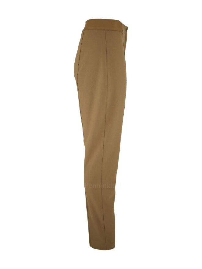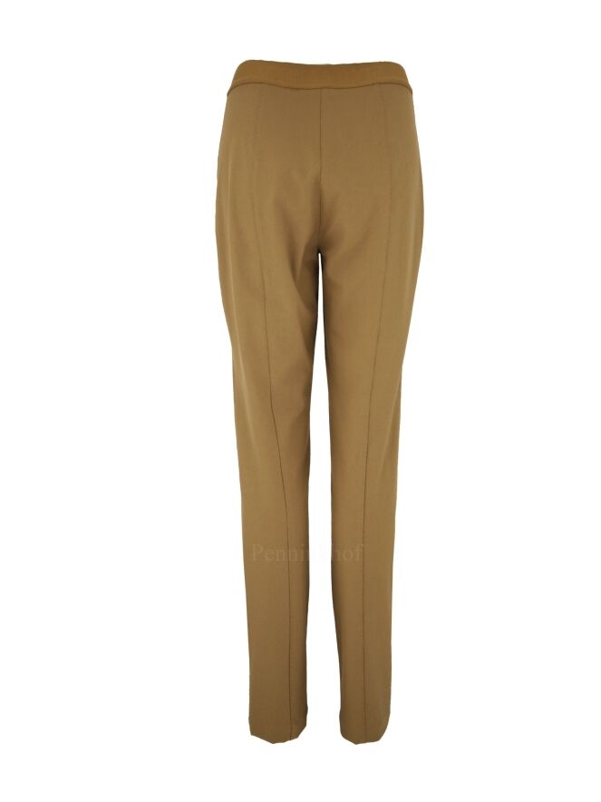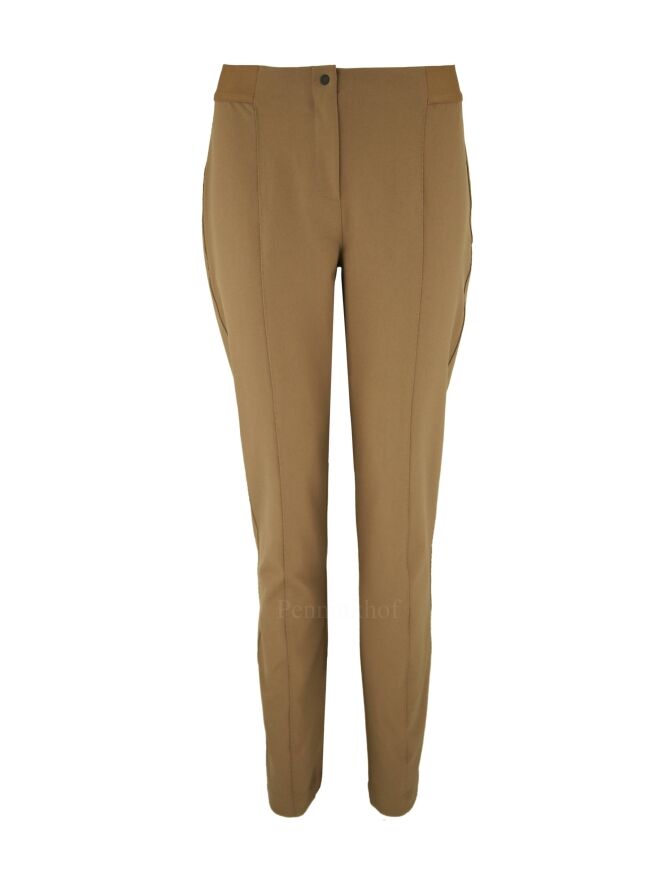 Een broek van Annette Görtz in een camel kleur. In de taille is vanaf de zijkanten en de achterkant een camel kleurige elastieken band. In het midden van de pijpen is over de gehele lengte een decoratieve stiknaad. Deze broek mag op 30 graden worden gewassen.