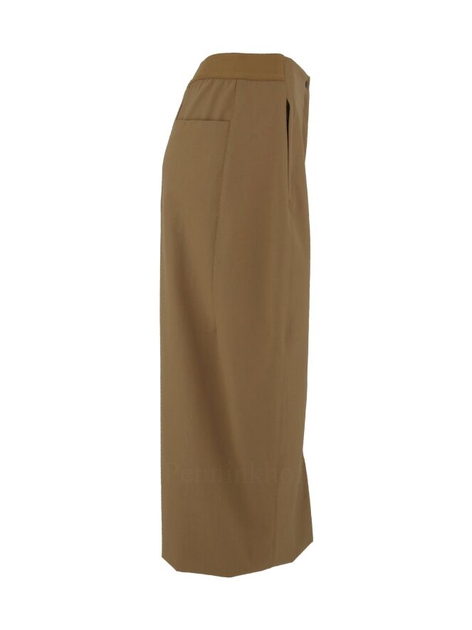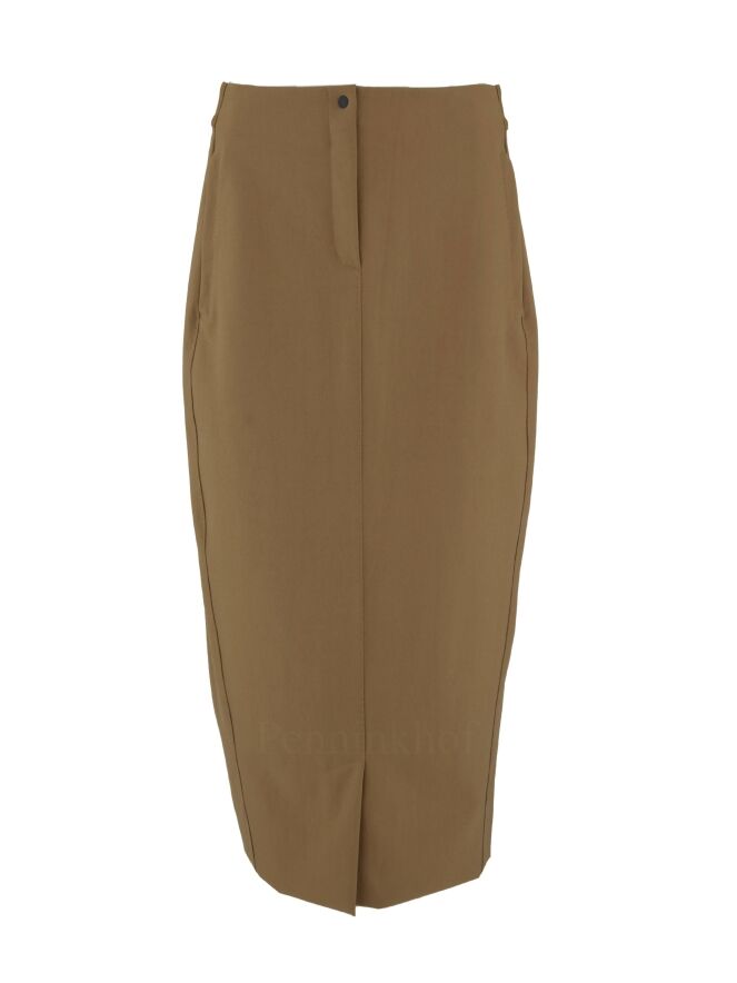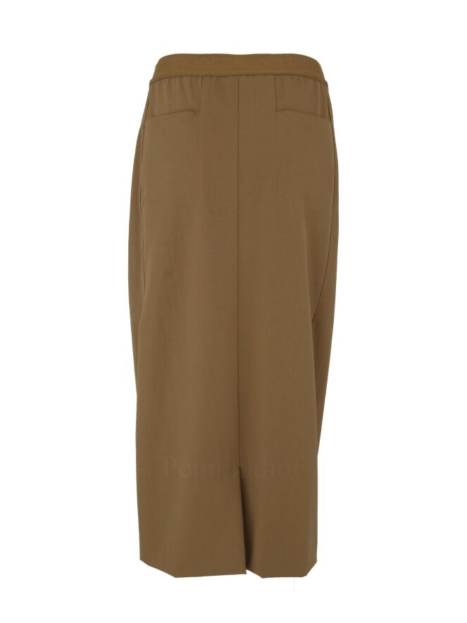 Een rok van Annette Görtz in een camel kleur. In de taille is vanaf de zijkanten en de achterkant een camel kleurige elastieken band. Aan de onderkant van de rok is aan de voor en achterkant een korte split. Deze rok mag op 30 graden worden gewassen.
