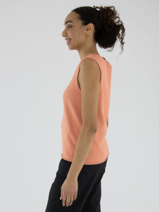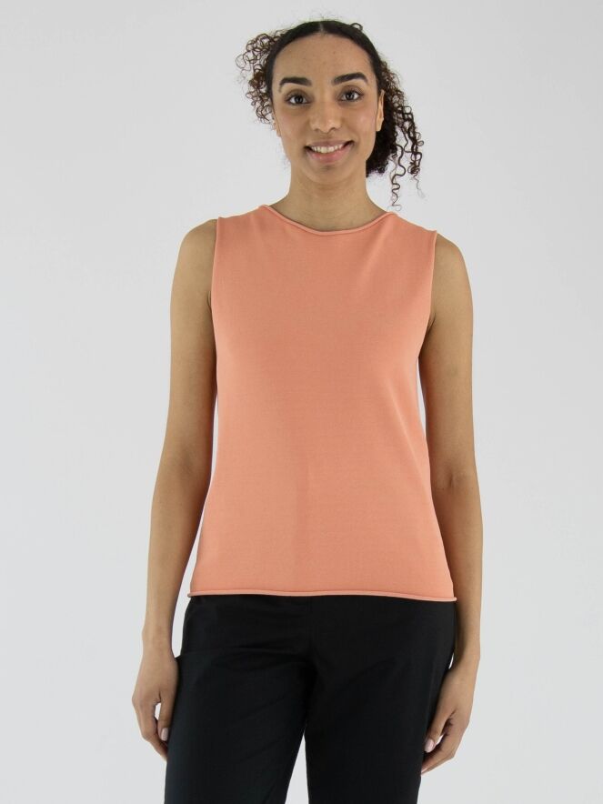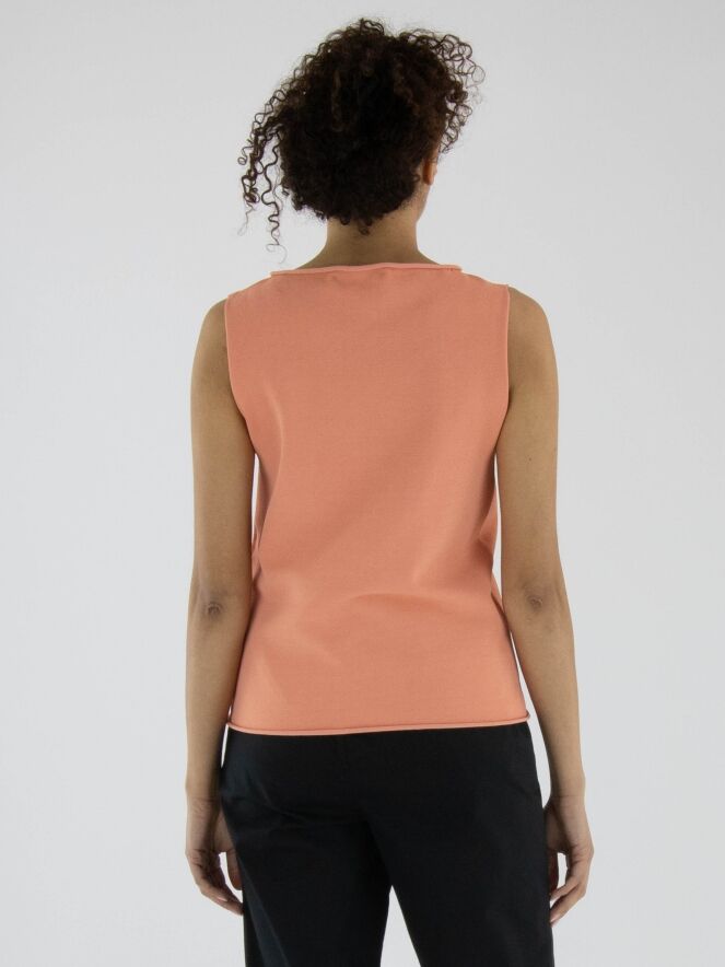 Een top van Annette Görtz in de kleur pastel oranje. De rand van de ronde hals en de onderkant van de top zijn fijn geruld. Deze top kan op 30 graden worden gewassen.