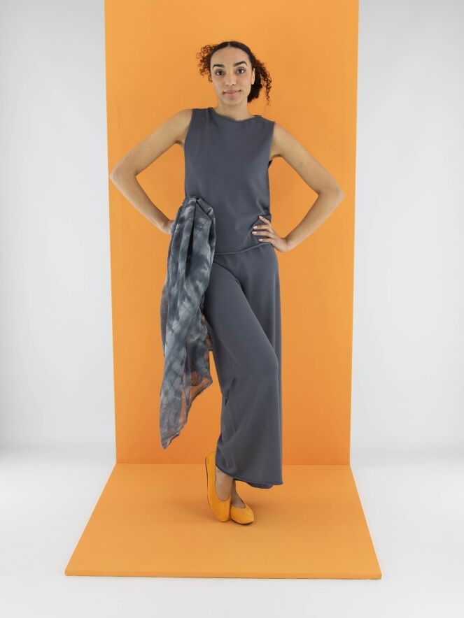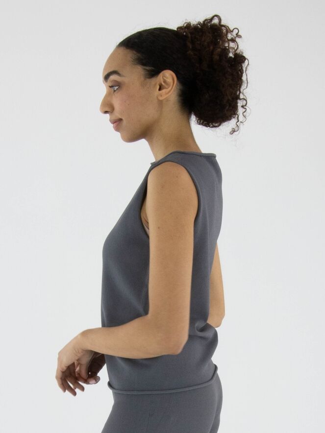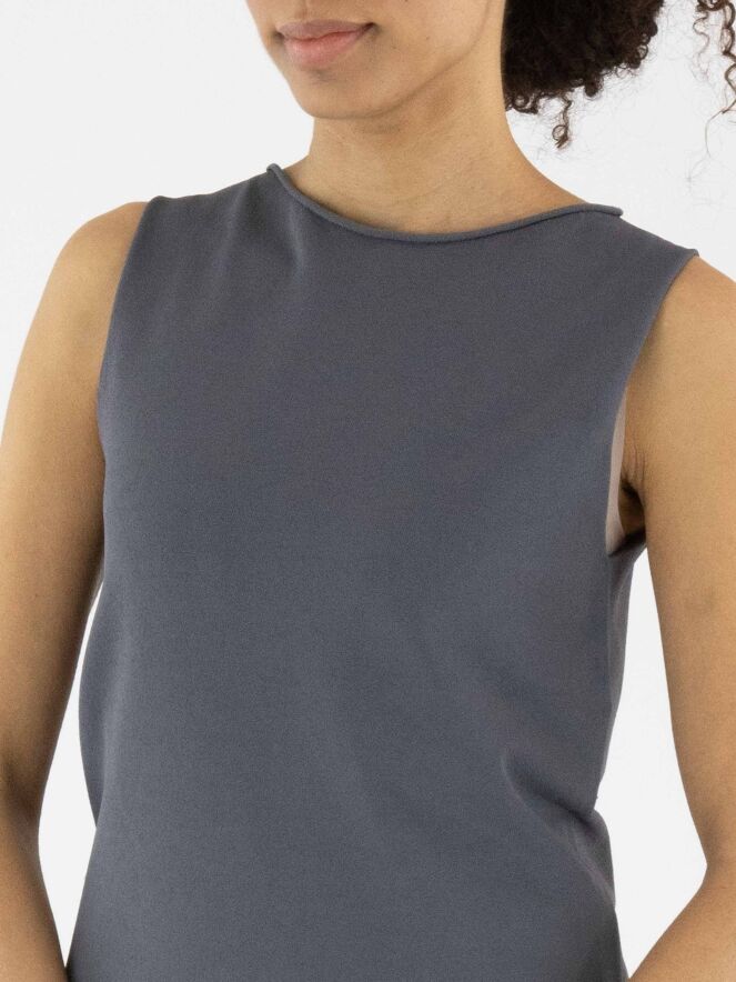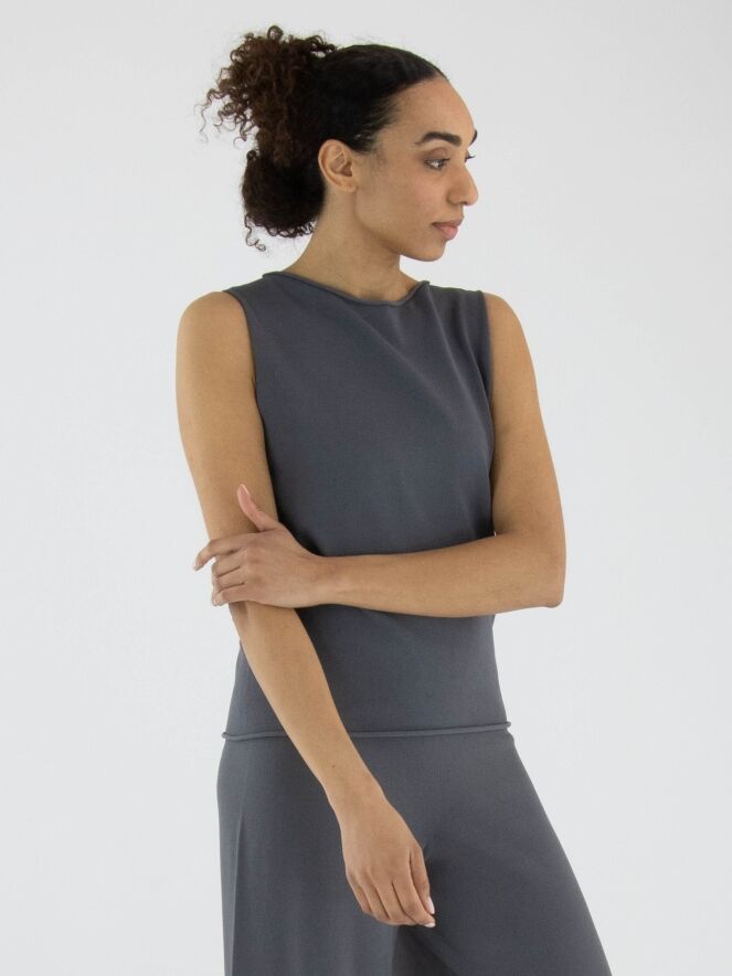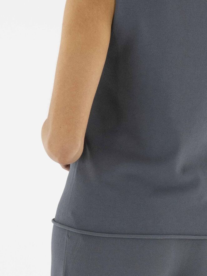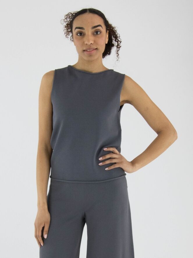 Een top van Annette Görtz in de kleur grijs. De rand van de ronde hals en de onderkant van de top zijn fijn geruld. Deze top kan op 30 graden worden gewassen.