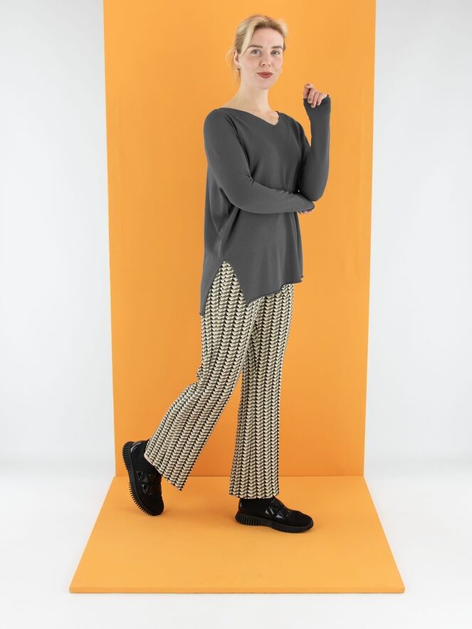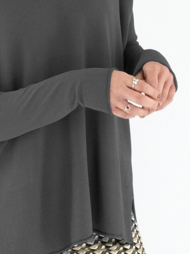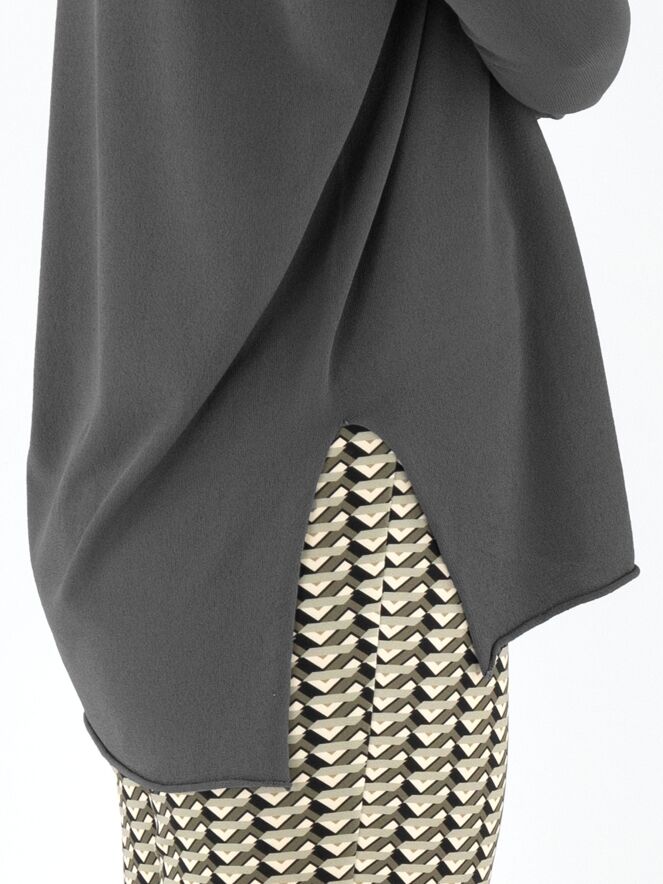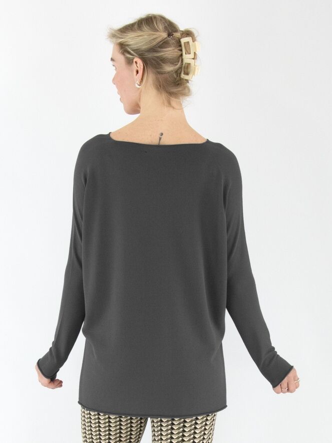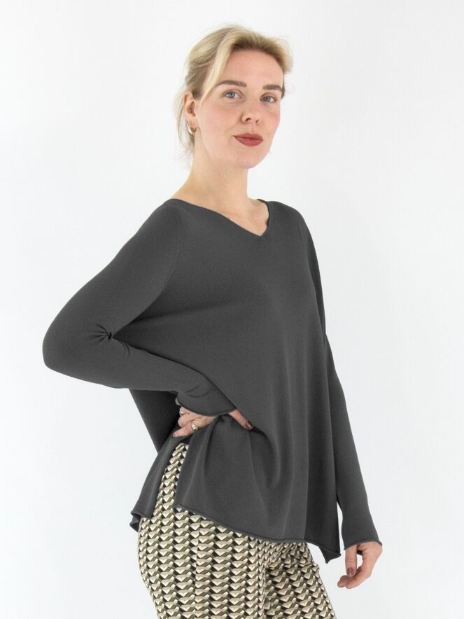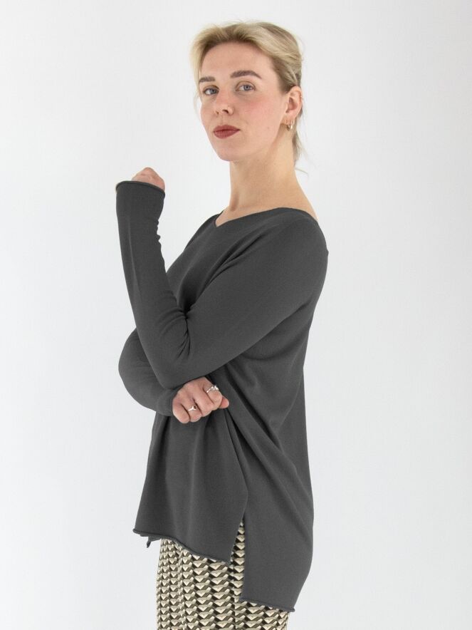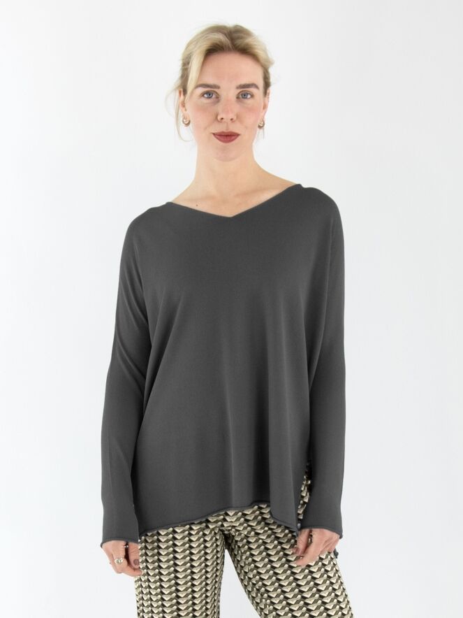 Een luxe, fijngebreide pullover van Annette Görtz in de kleur donkergrijs. De pullover heeft een V-hals en aan beide zijkanten aan de onderkant bevindt zich een diepe split. Deze pullover dient met de hand te worden gewassen.