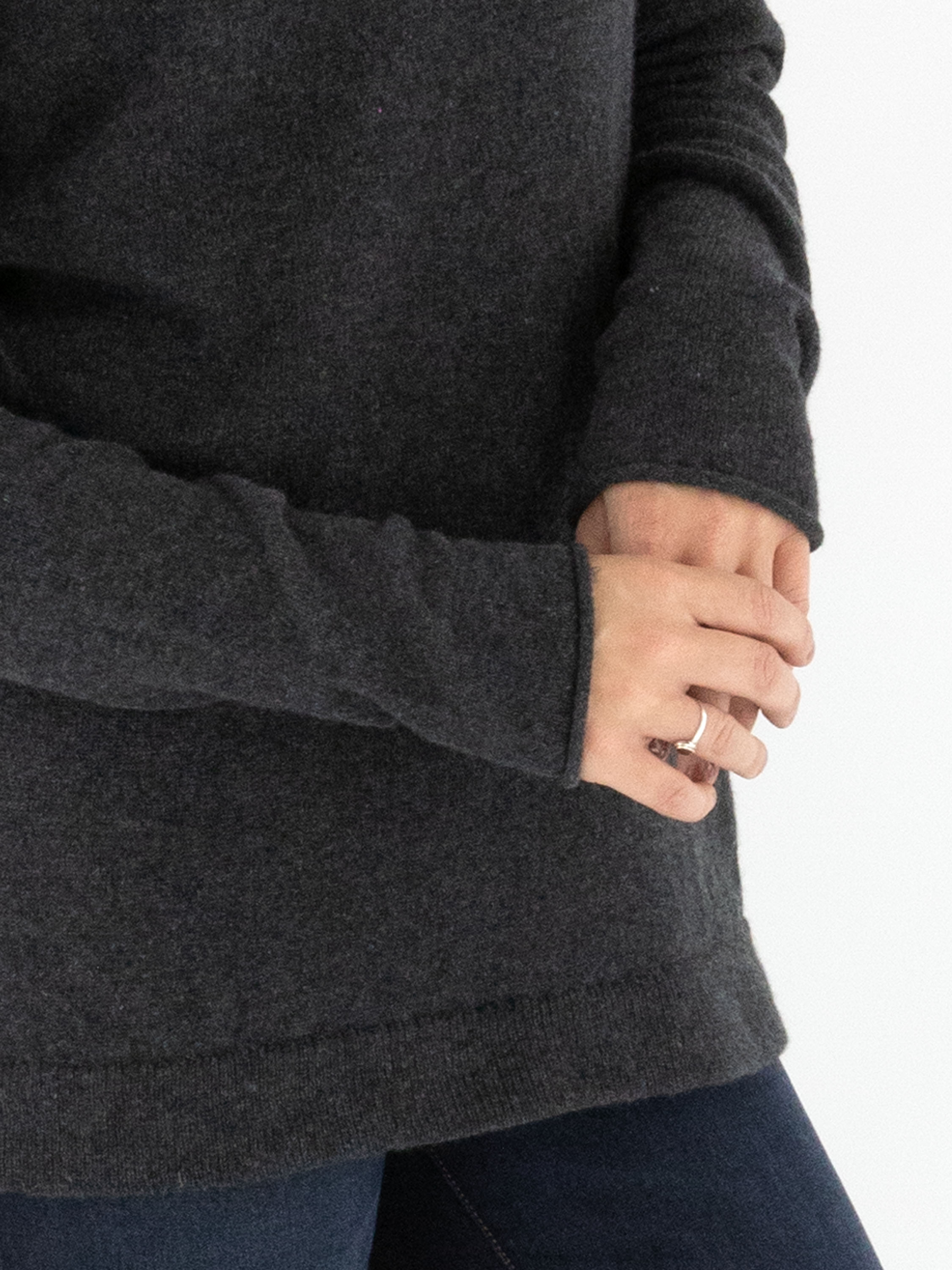 Een luxe pullover van Annette Görtz in een donkergrijze kleur. De pullover heeft een vallende turtle hals. Deze pullover mag met de hand worden gewassen.