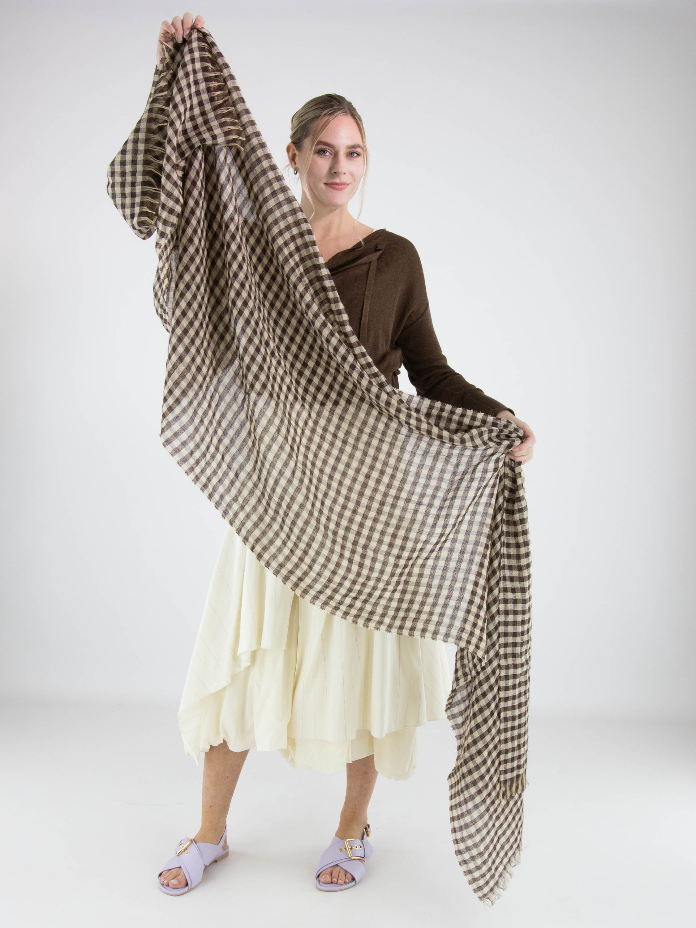 Een luxe, licht transparante shawl van Annette Görtz met een geblokt patroon in de kleuren mokkabruin en beige. De randen van de shawl zijn fijn gerafeld. Deze shawl kan met de hand worden gewassen.