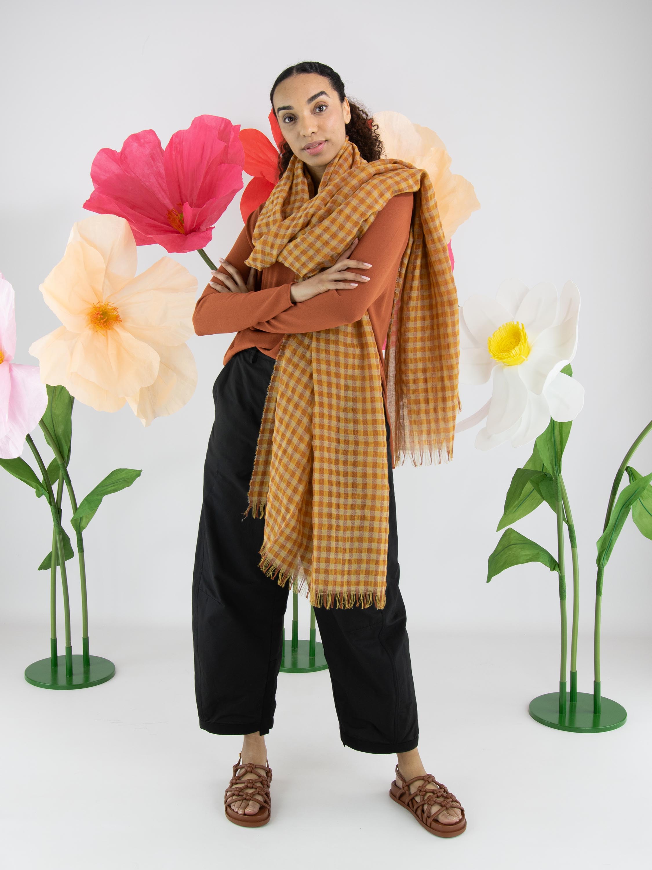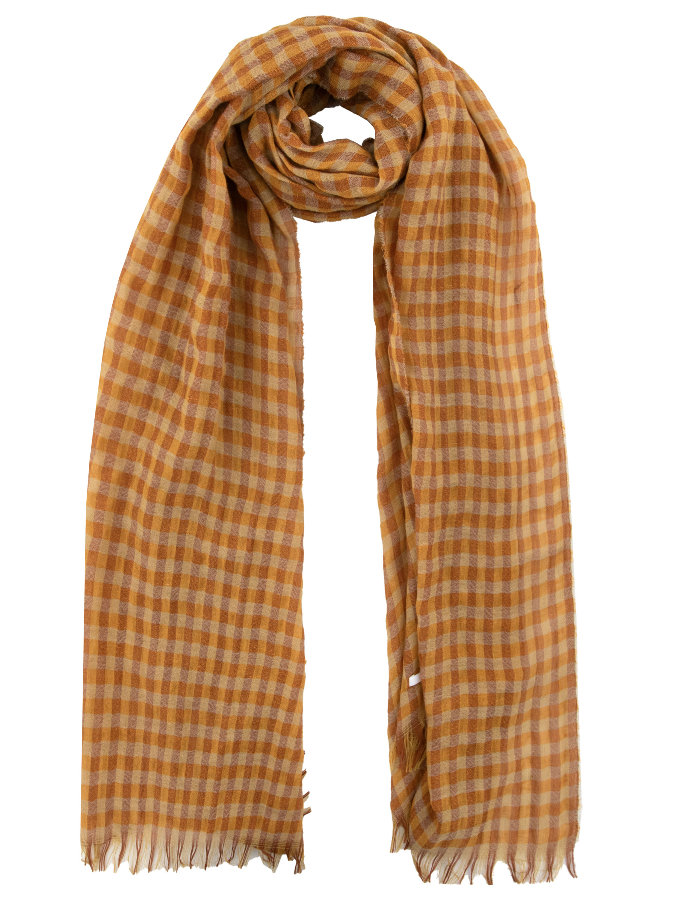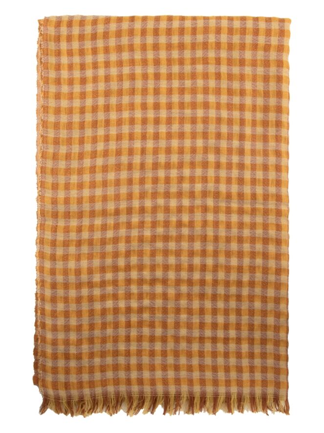 Een luxe, licht transparante shawl van Annette Görtz met een geblokt patroon in meerdere tinten oranje en beige. De randen van de shawl zijn fijn gerafeld. Deze shawl kan met de hand worden gewassen.