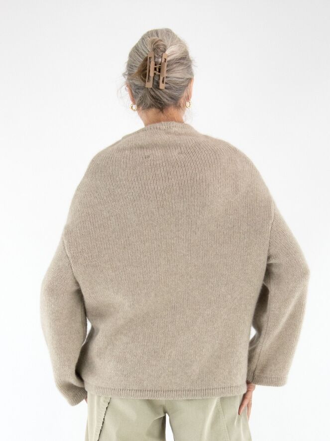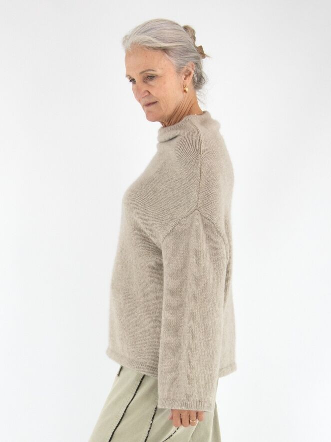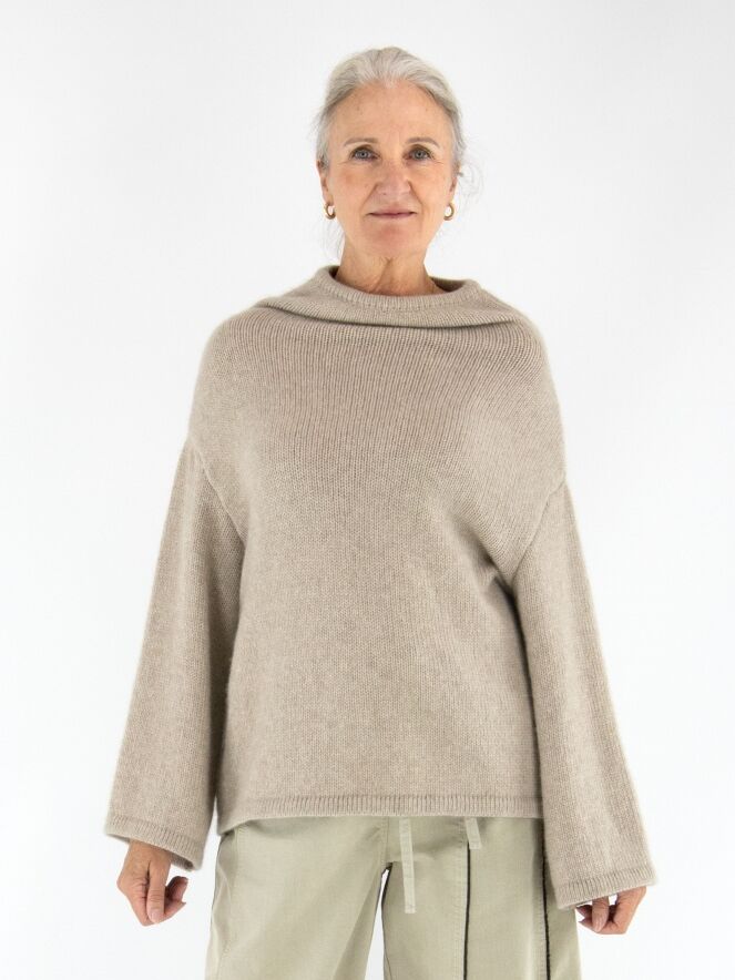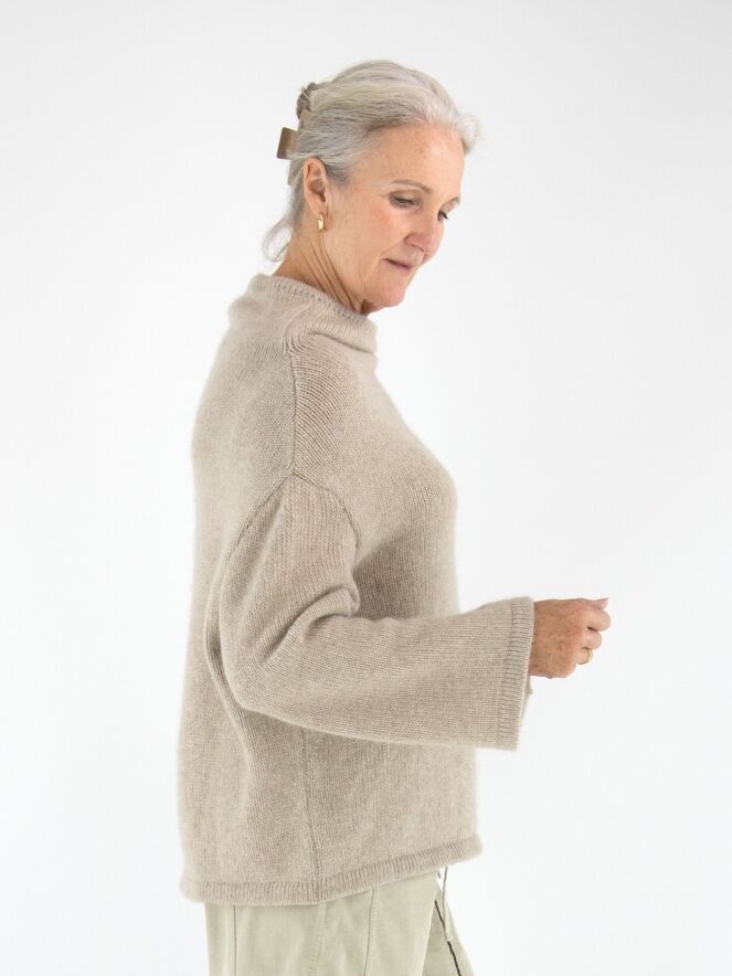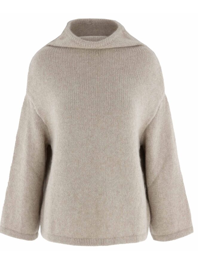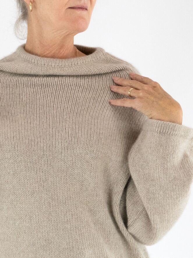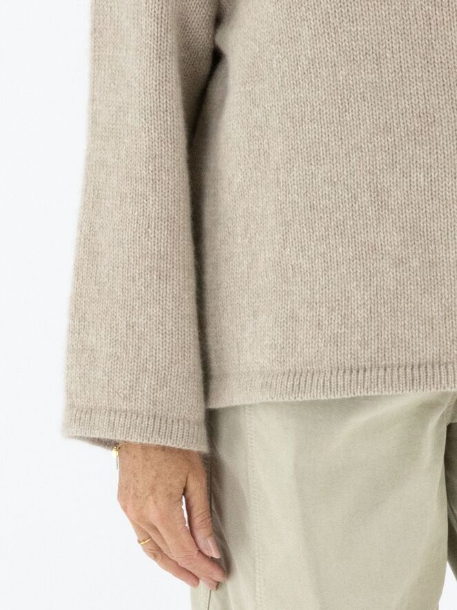 Een luxe pullover van Annette Görtz in de kleur beige. De pullover heeft een vallende hals en wijde driekwartmouwen. Deze pullover kan met de hand worden gewassen.