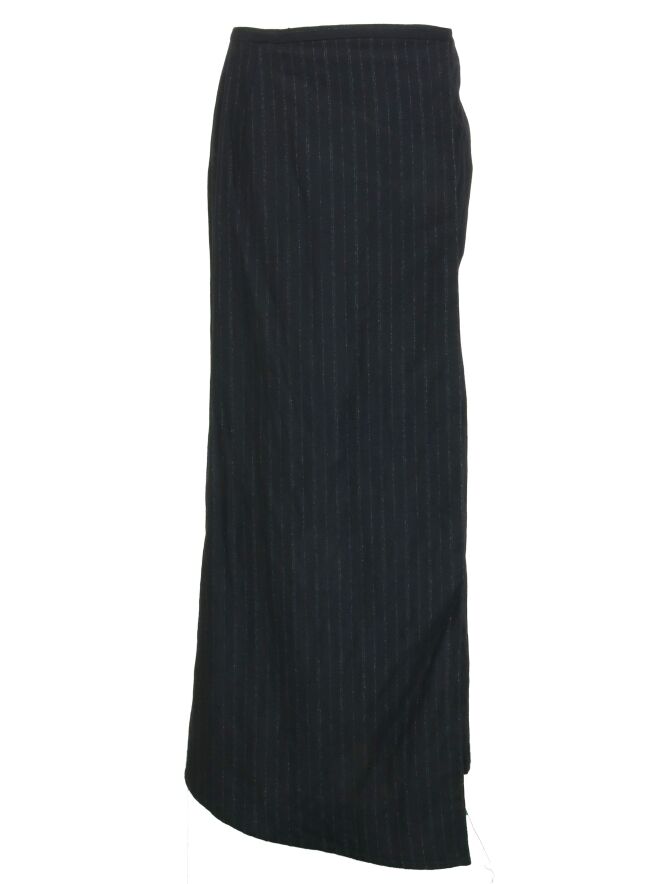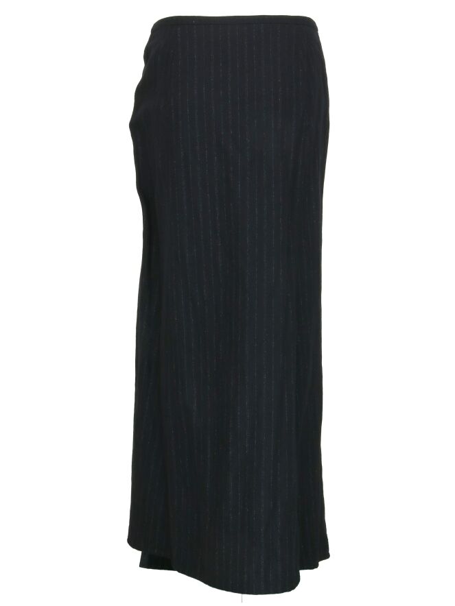 Een overslag rok van Annette Görtz in een krijtstreep met de kleuren zwart en off white. De rand van de overslag kan meer of minder woden dichtgezet met kleine drukknoopjes. De rok is gevoerd en mag niet worden gewassen.