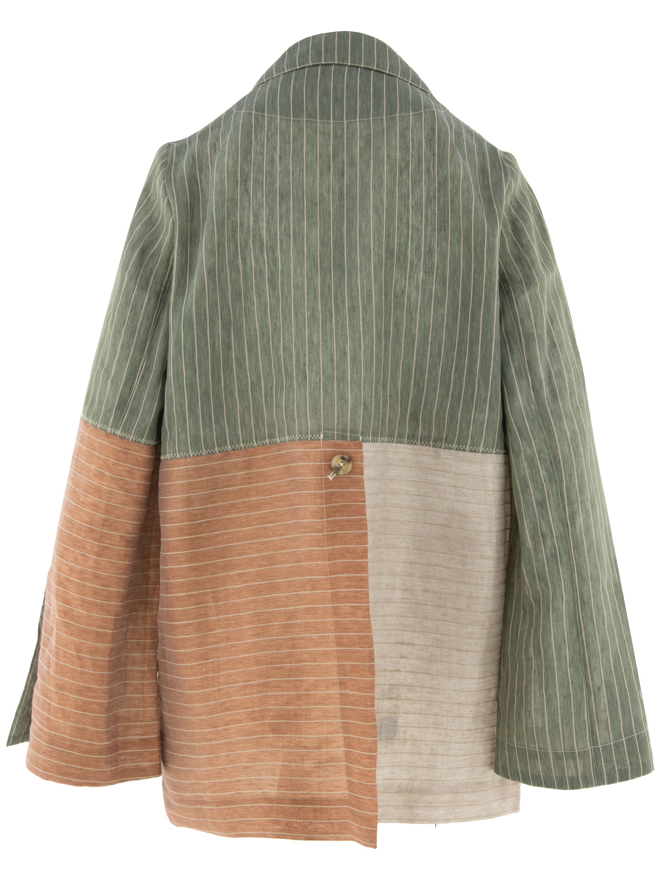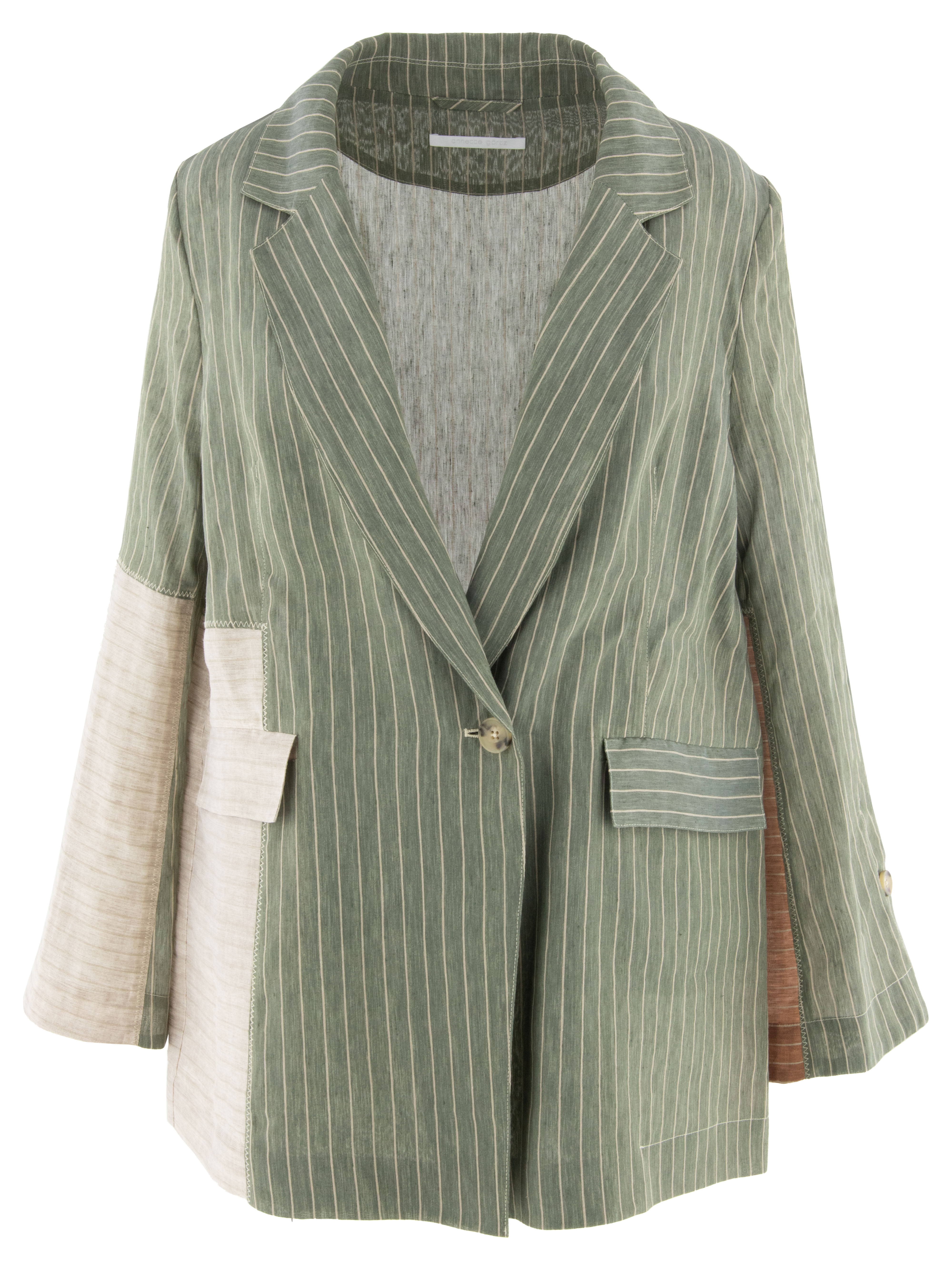 Designblazer van Annette Görtz in een streeppatroon met meerdere kleurvlakken, waaronder olijfgroen, beige en cognacbruin. De blazer heeft een sluiting met één knoop en is ongevoerd, wat zorgt voor een lichte en moderne valling. Aan de achterzijde bevindt zich in het midden een diepe split tot aan de taille, die eindigt met een knoopdetail. Deze blazer kan met de hand worden gewassen.