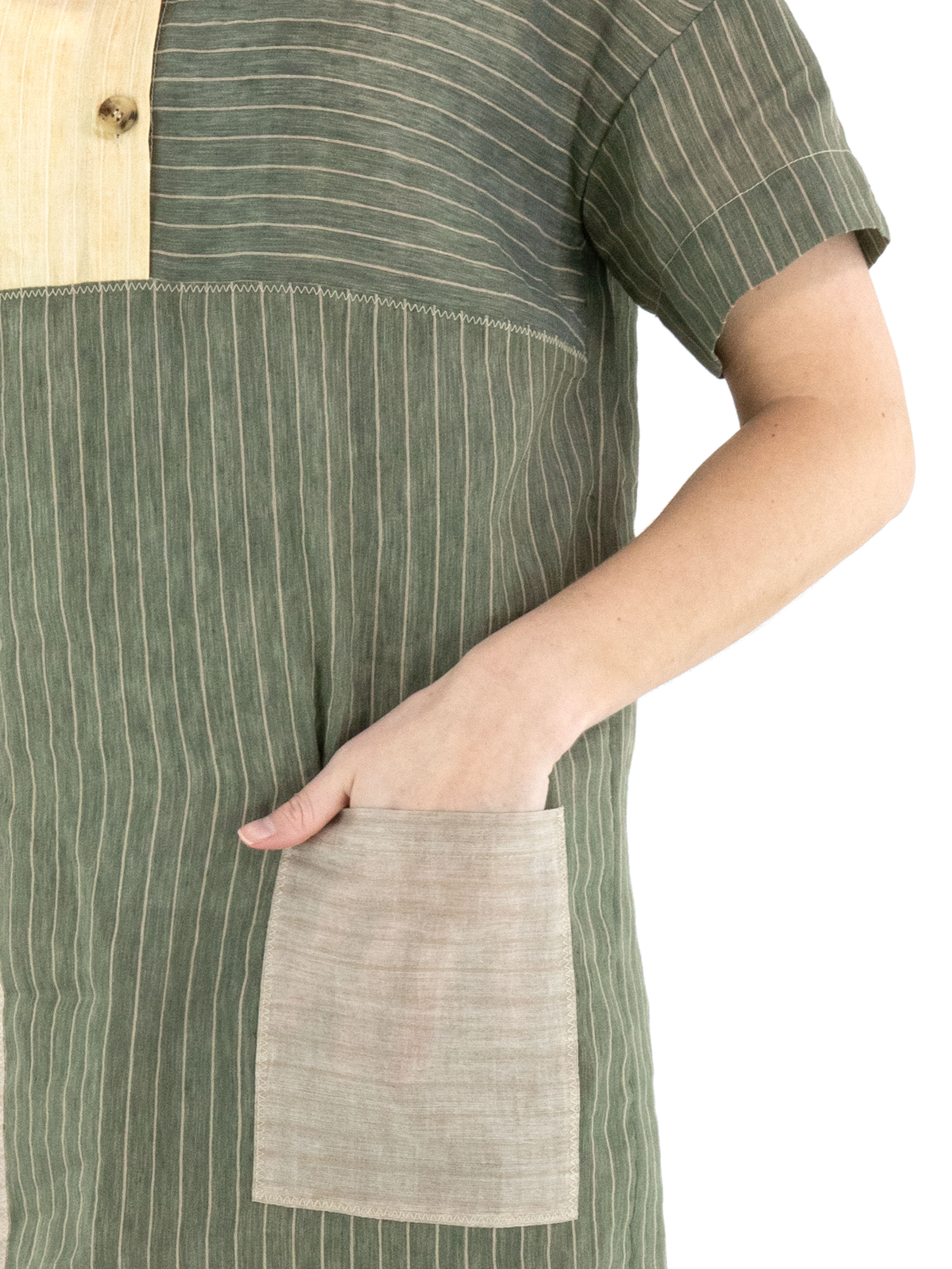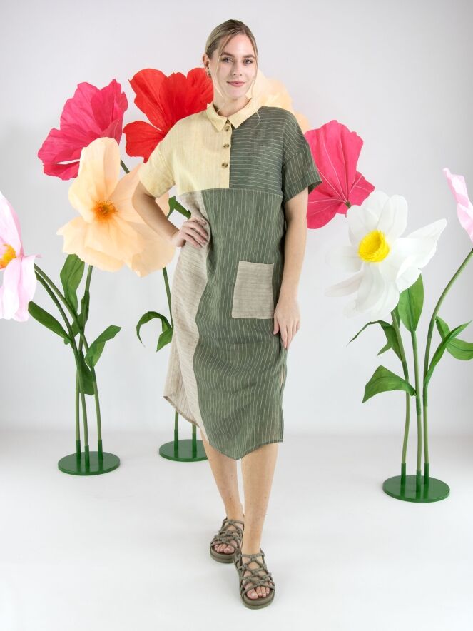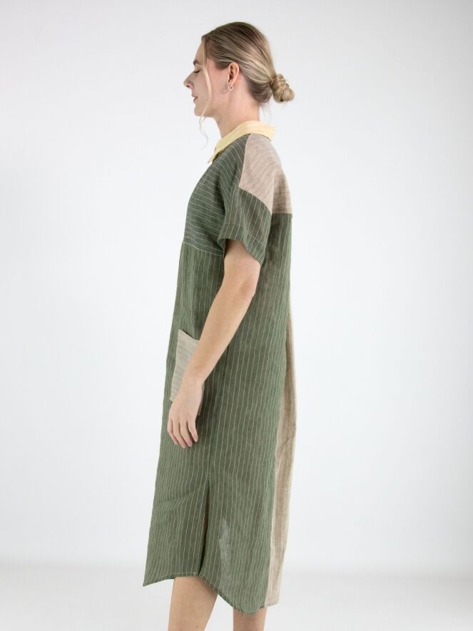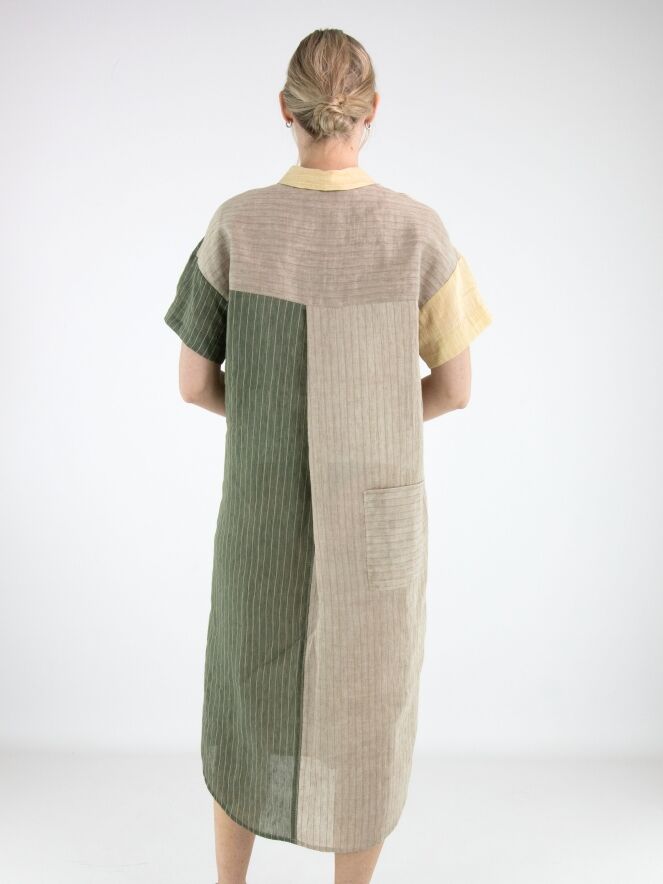 Designjurk van Annette Görtz in een streeppatroon, verdeeld over meerdere vlakken in olijfgroen, vanille en lichtgrijs. Vanuit de hals loopt een knoopsluiting tot aan de buste. Ter hoogte van de taille is aan de linkerzijde een zak verwerkt. De jurk is recht gesneden en heeft korte mouwen, wat zorgt voor een moderne en minimalistische uitstraling. Deze jurk kan met de hand worden gewassen.