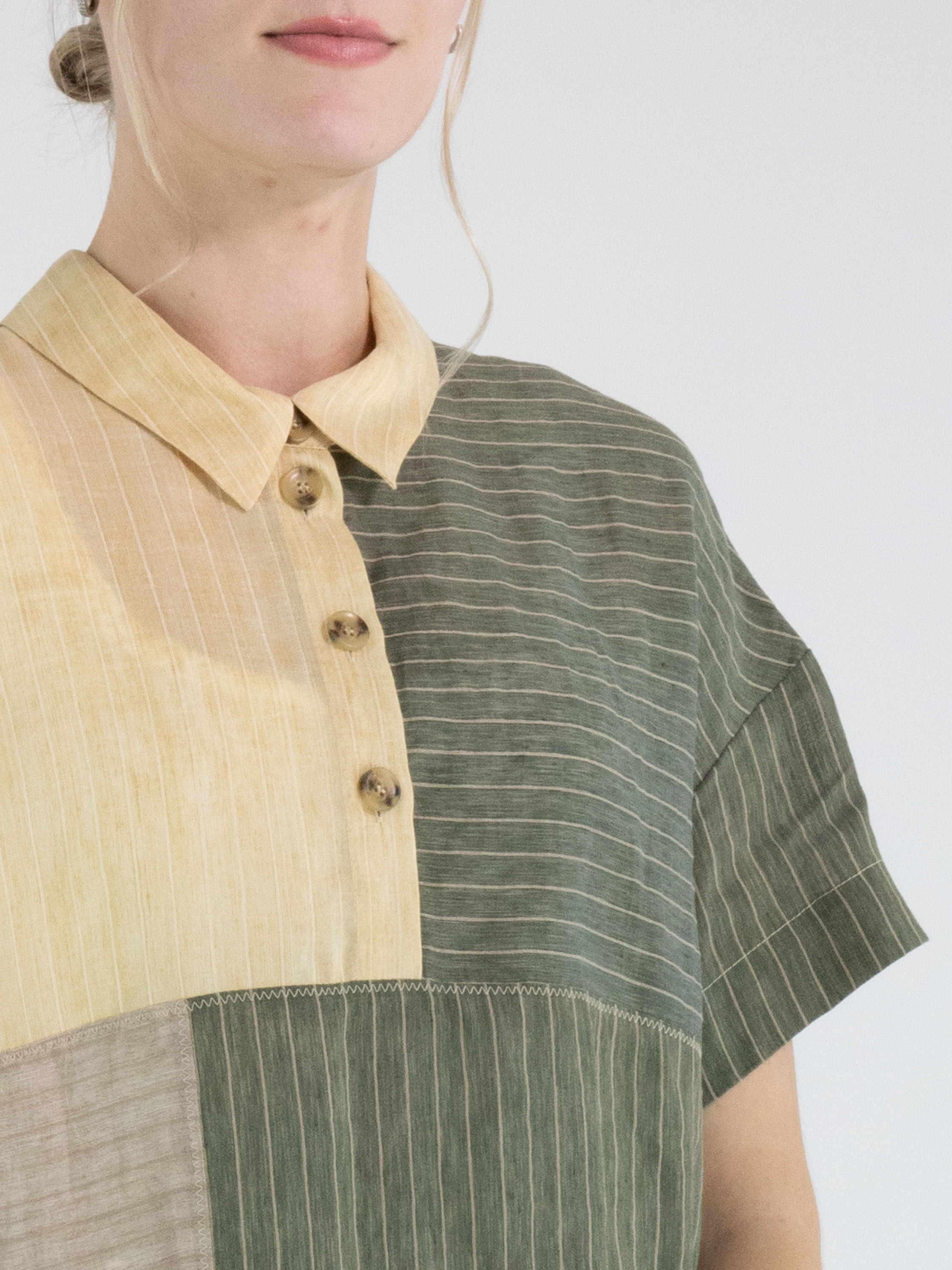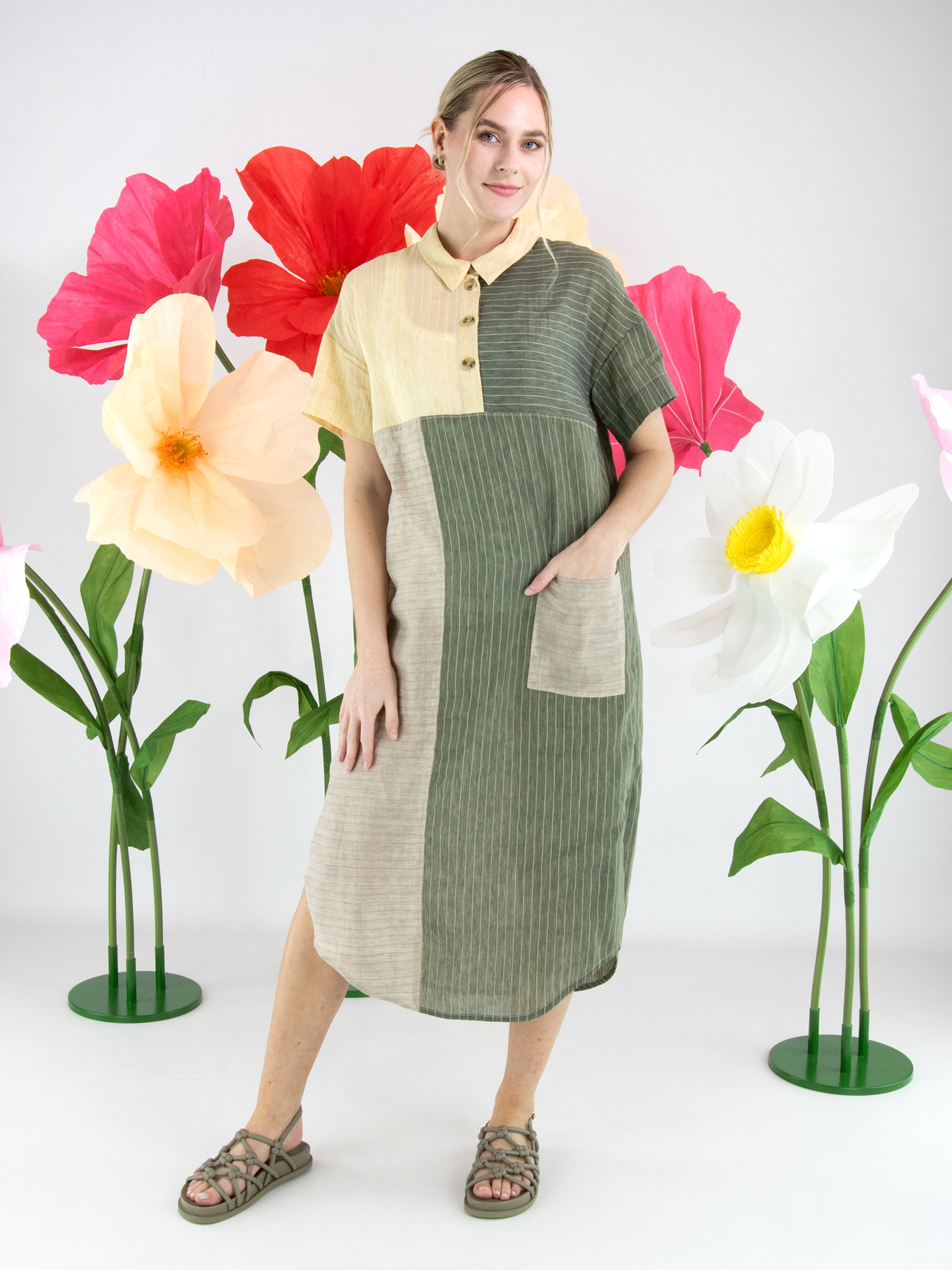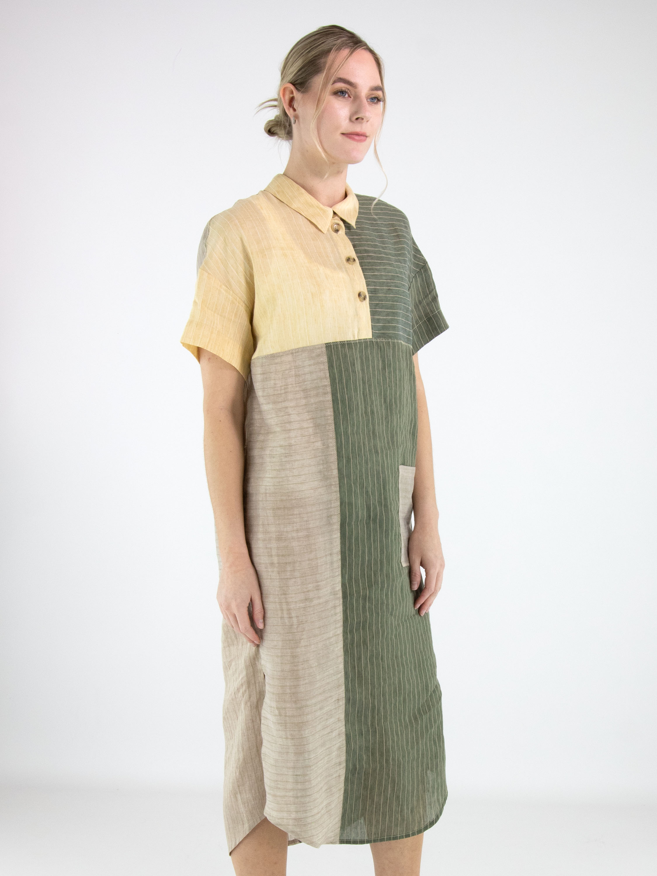 Designjurk van Annette Görtz in een streeppatroon, verdeeld over meerdere vlakken in olijfgroen, vanille en lichtgrijs. Vanuit de hals loopt een knoopsluiting tot aan de buste. Ter hoogte van de taille is aan de linkerzijde een zak verwerkt. De jurk is recht gesneden en heeft korte mouwen, wat zorgt voor een moderne en minimalistische uitstraling. Deze jurk kan met de hand worden gewassen.