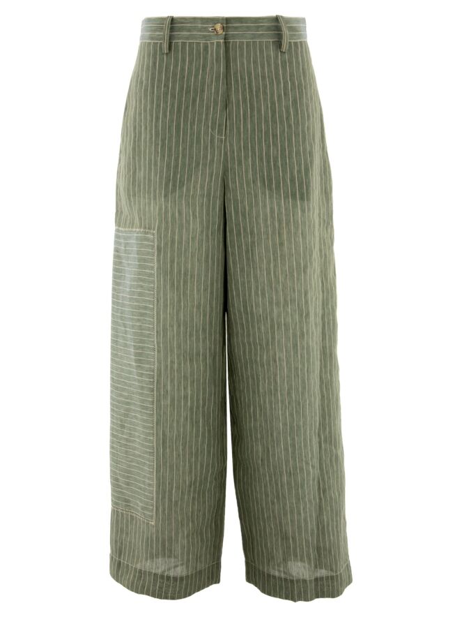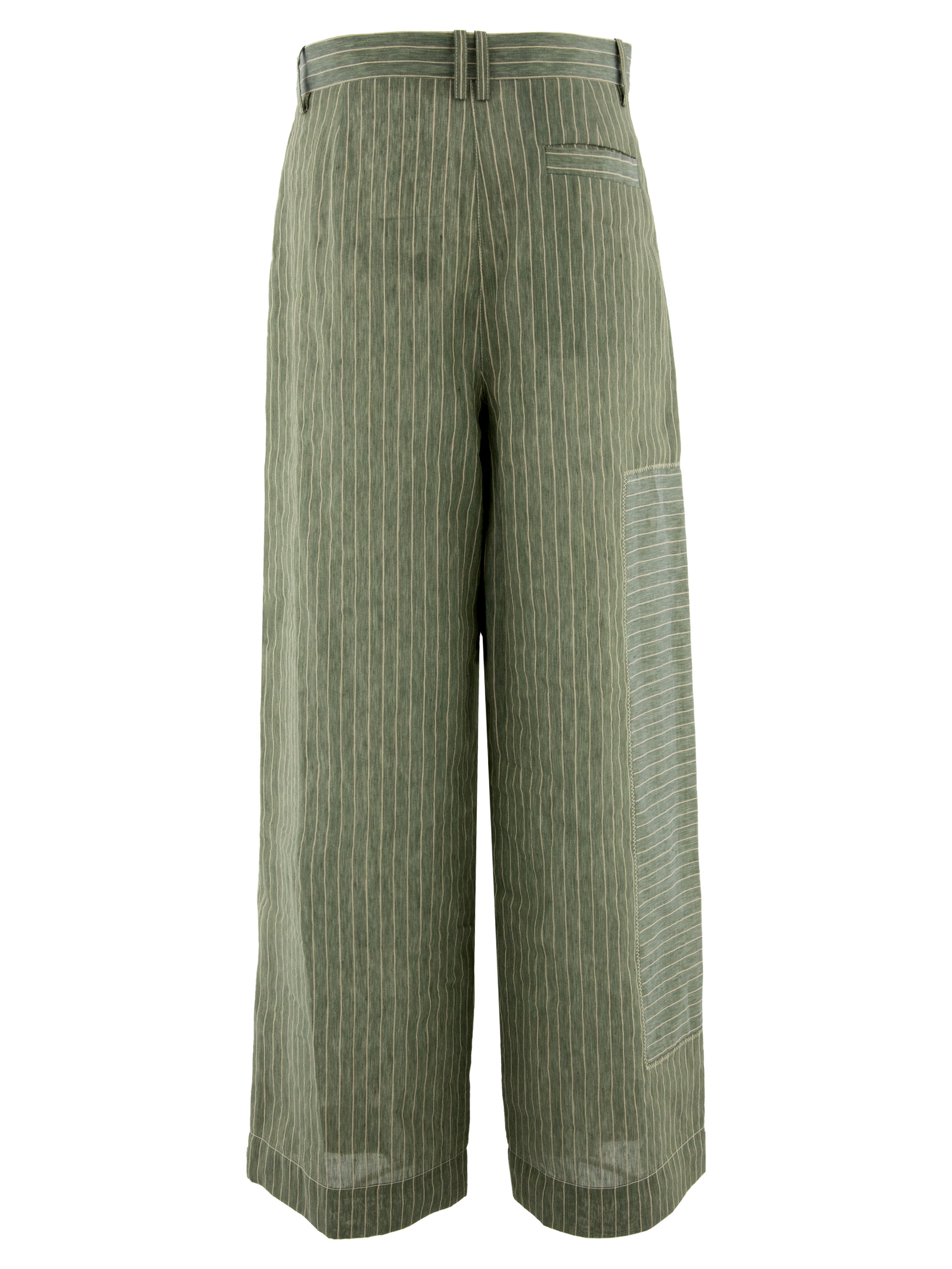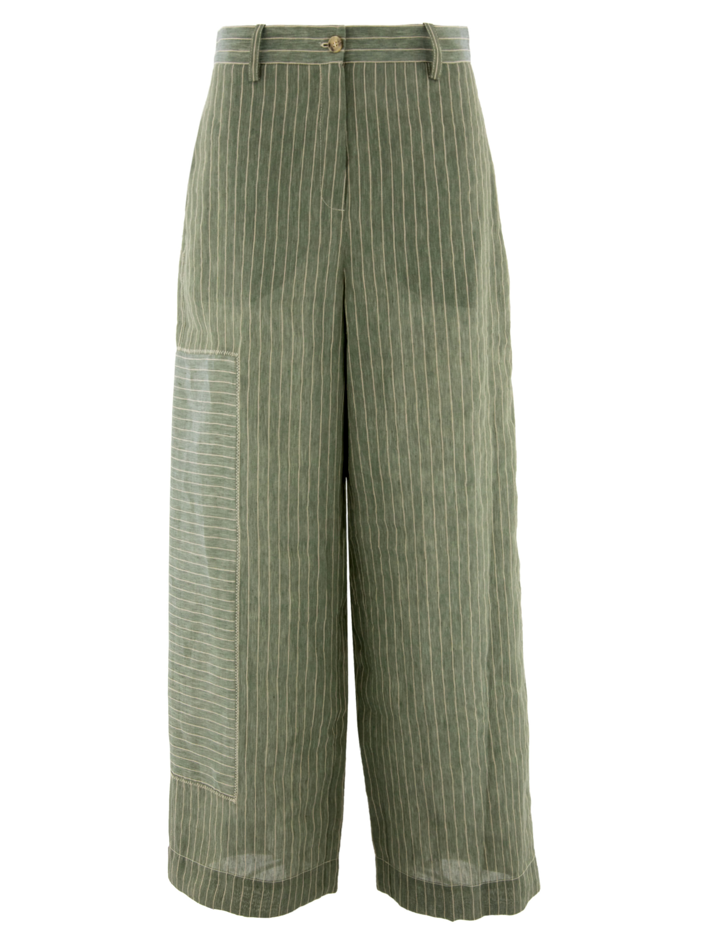 Een broek van Annette Görtz in een krijtstreeppatroon in de kleuren olijfgroen en beige. Aan de zijkant van de linker pijp is de stof deels uitgevoerd in een horizontale krijtstreep, wat zorgt voor een speels contrast. De broek heeft steekzakken en is gevoerd tot het bovenbeen. Deze broek mag op de hand worden gewassen.