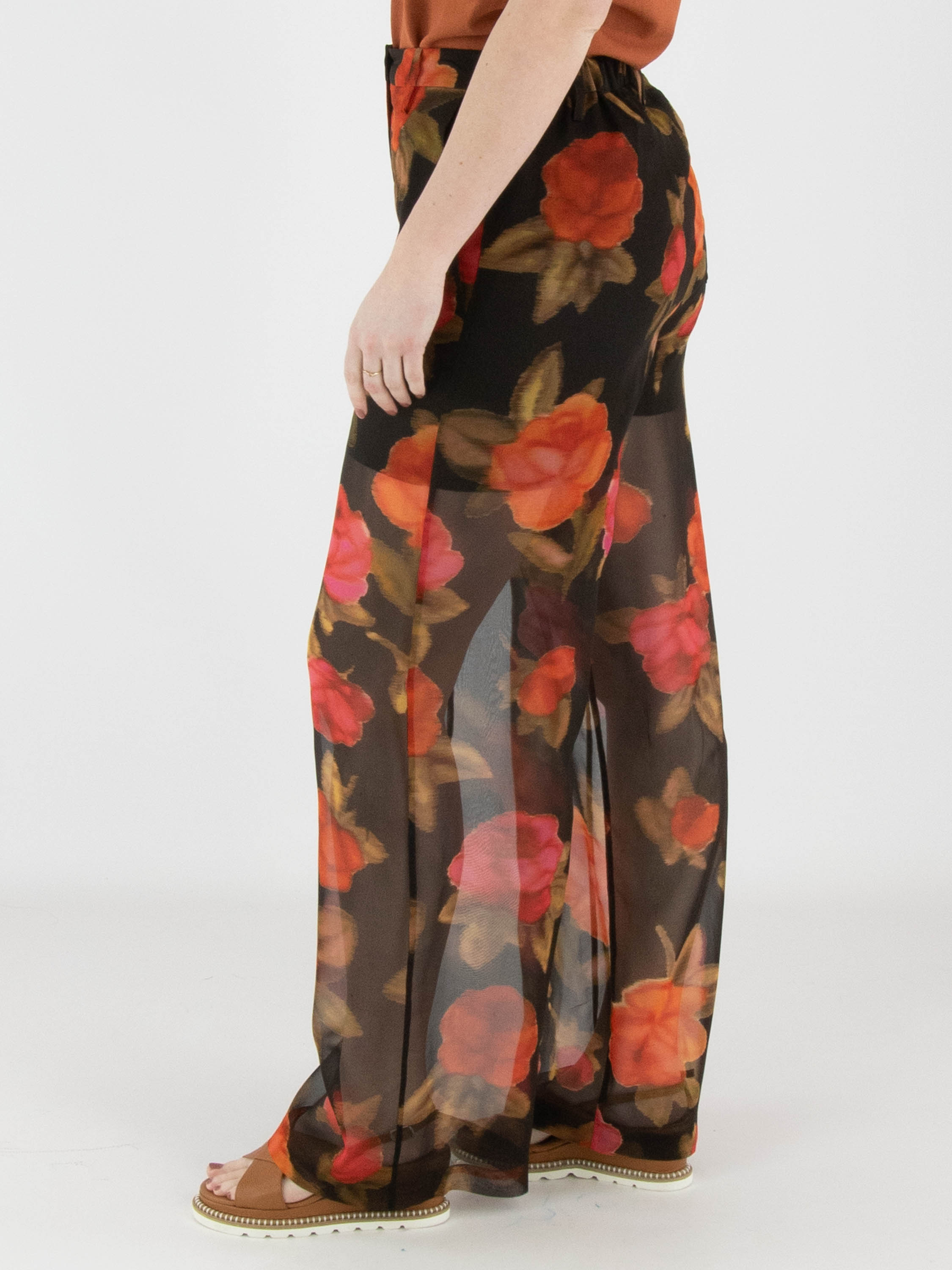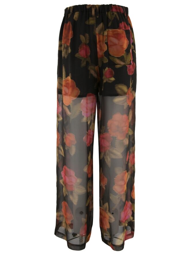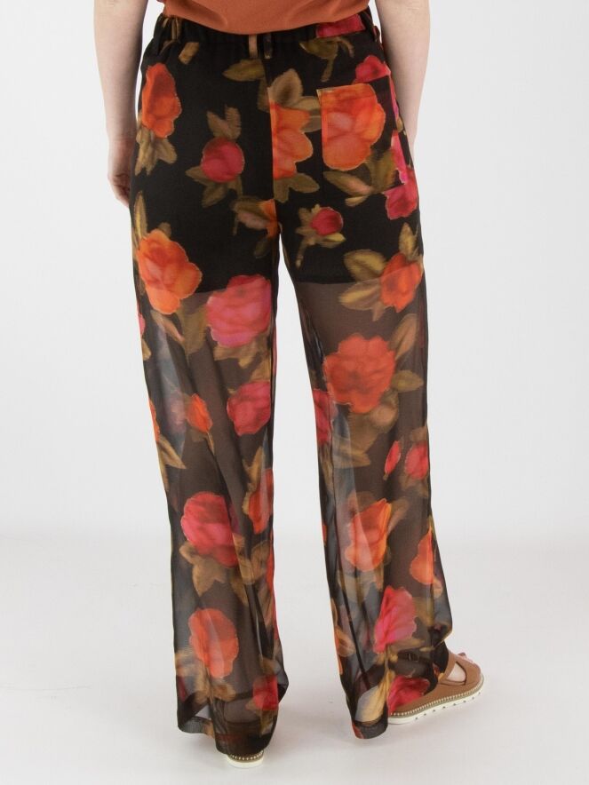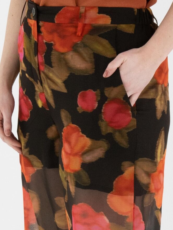 Een licht transparante, wijde broek van Annette Görtz met een bloemenprint in meerdere tinten rood en fuchsia, gecombineerd met olijfgroen op een zwarte achtergrond. De broek is tot op het bovenbeen gevoerd. In de taille is aan de achterzijde een elastische band verwerkt. De broek heeft steekzakken en mag niet worden gewassen.