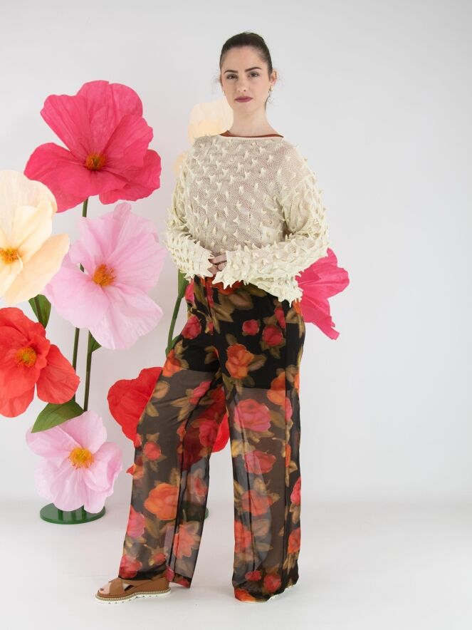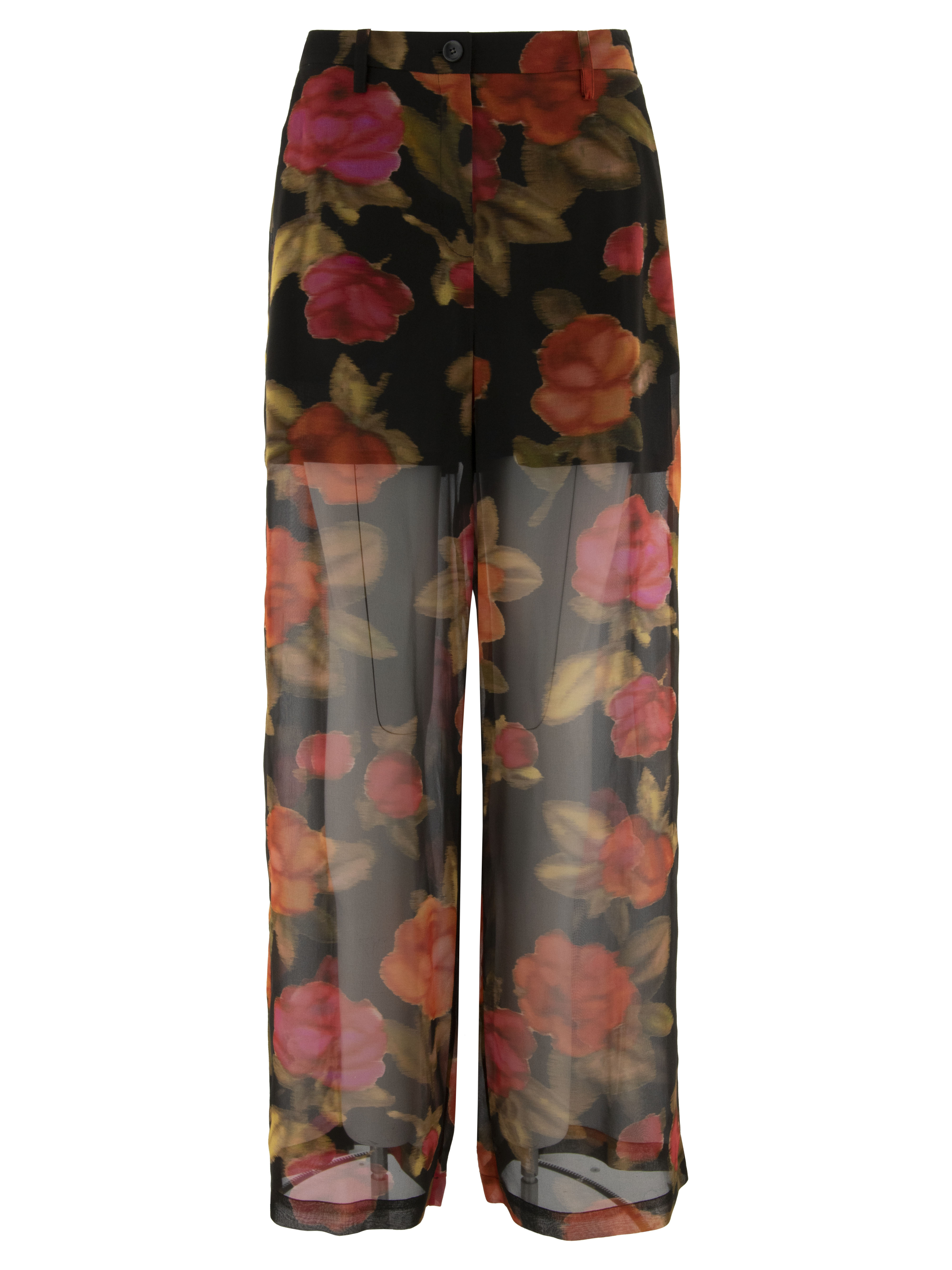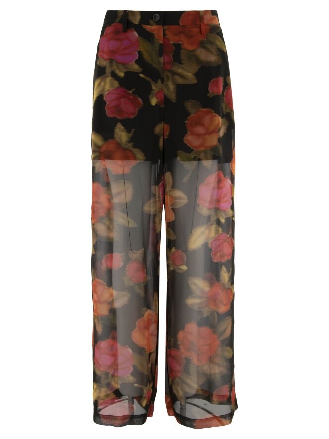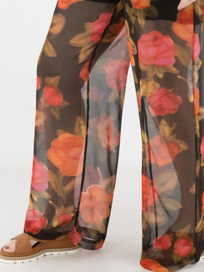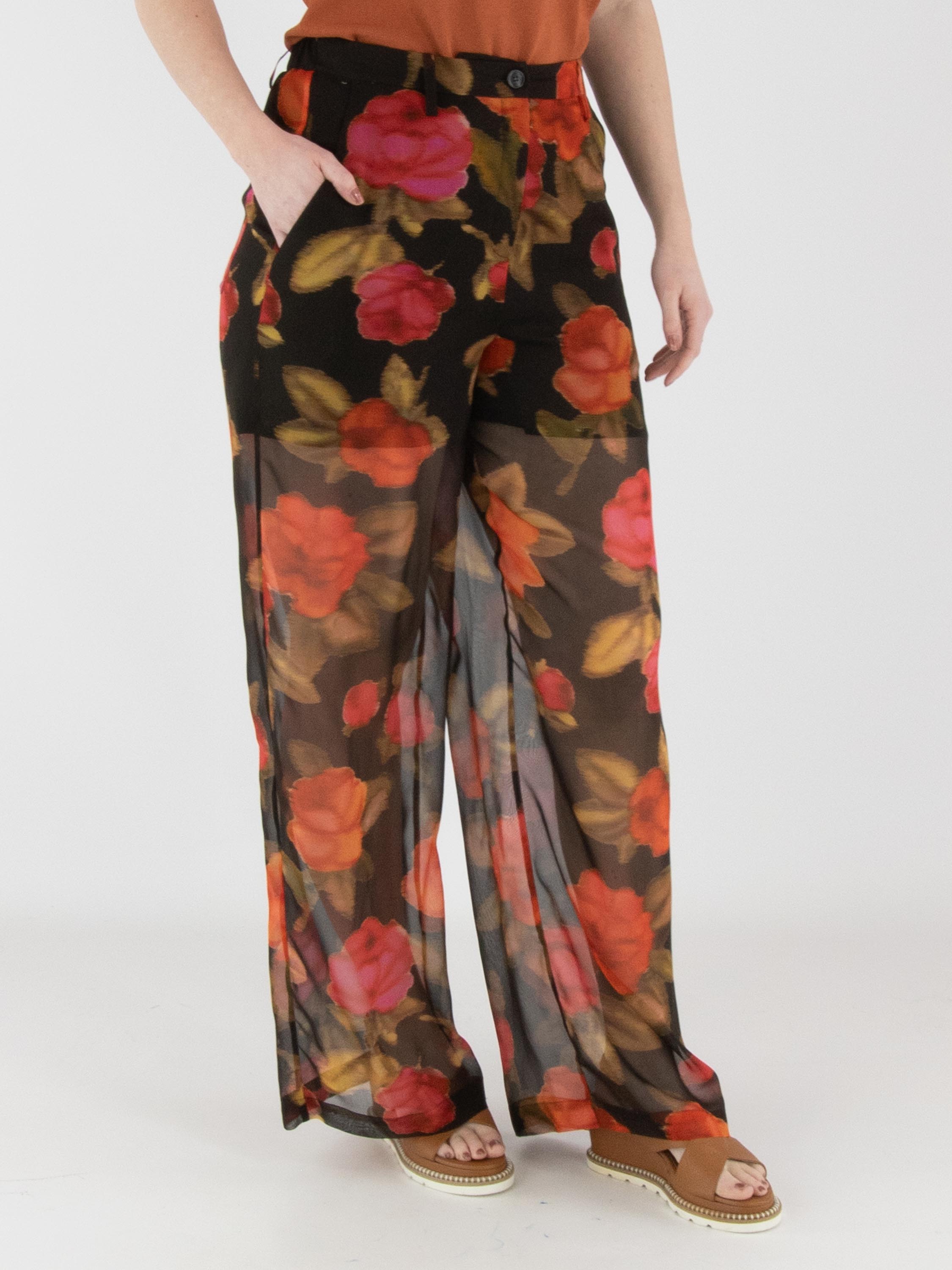 Een licht transparante, wijde broek van Annette Görtz met een bloemenprint in meerdere tinten rood en fuchsia, gecombineerd met olijfgroen op een zwarte achtergrond. De broek is tot op het bovenbeen gevoerd. In de taille is aan de achterzijde een elastische band verwerkt. De broek heeft steekzakken en mag niet worden gewassen.