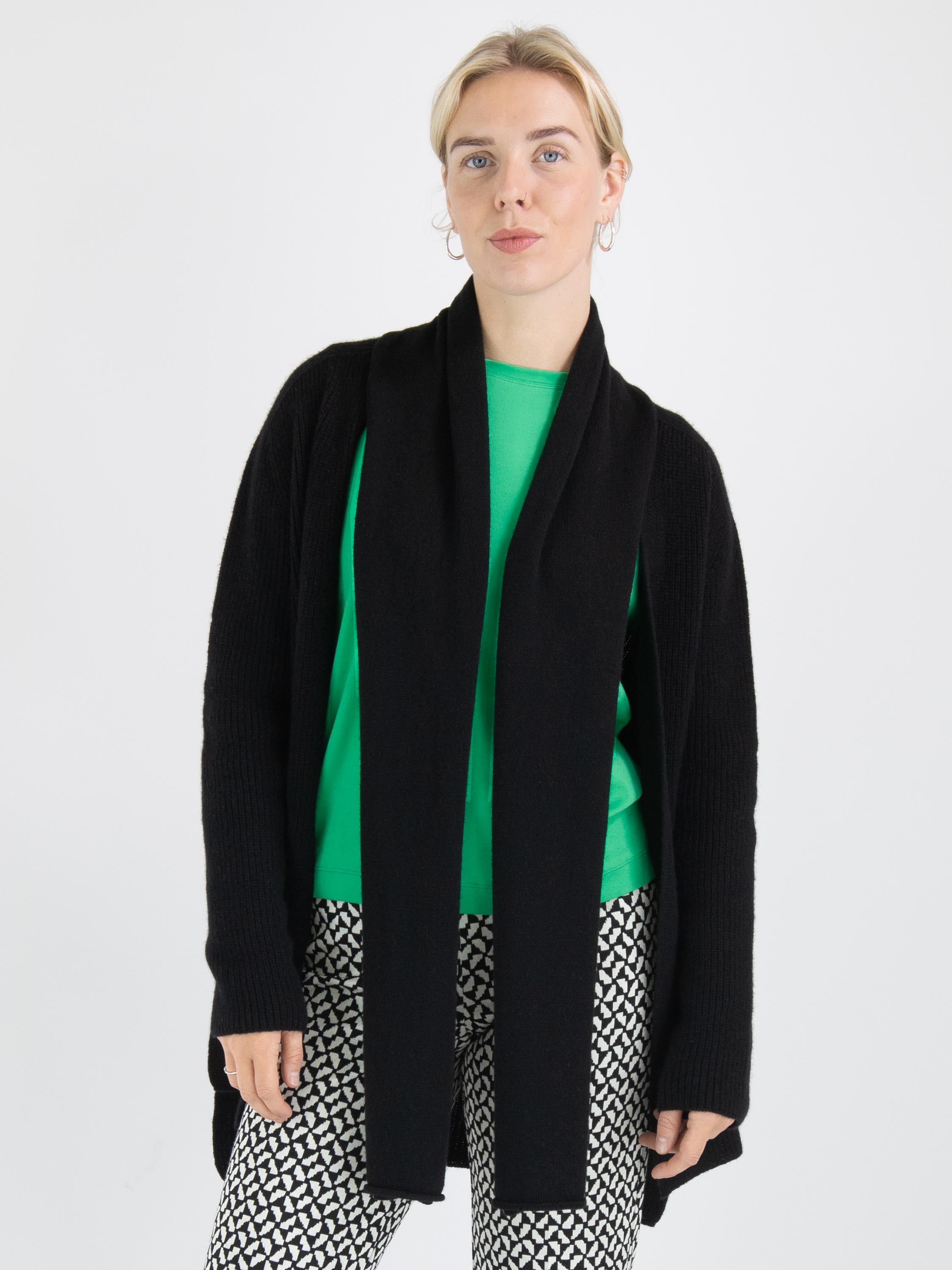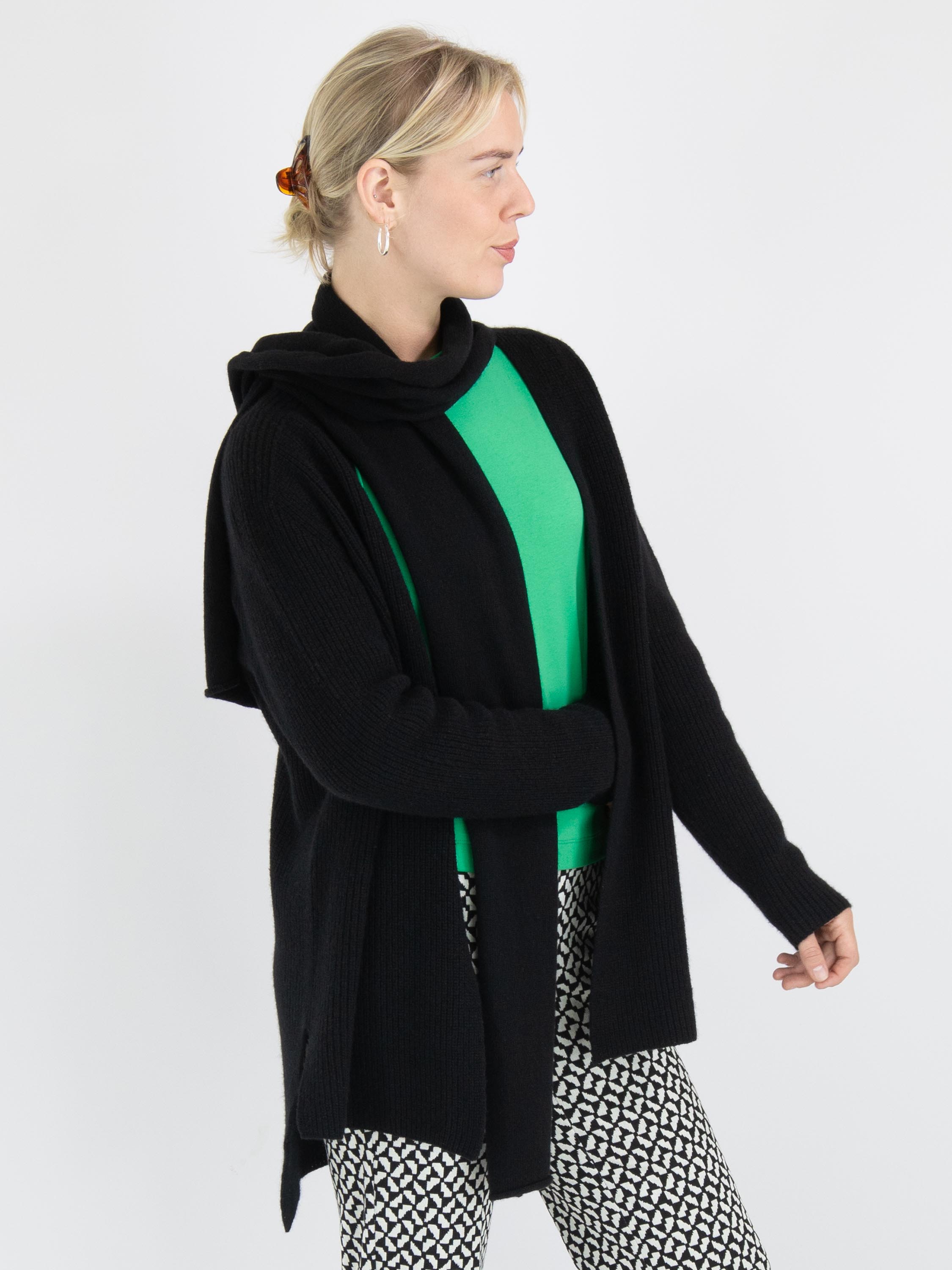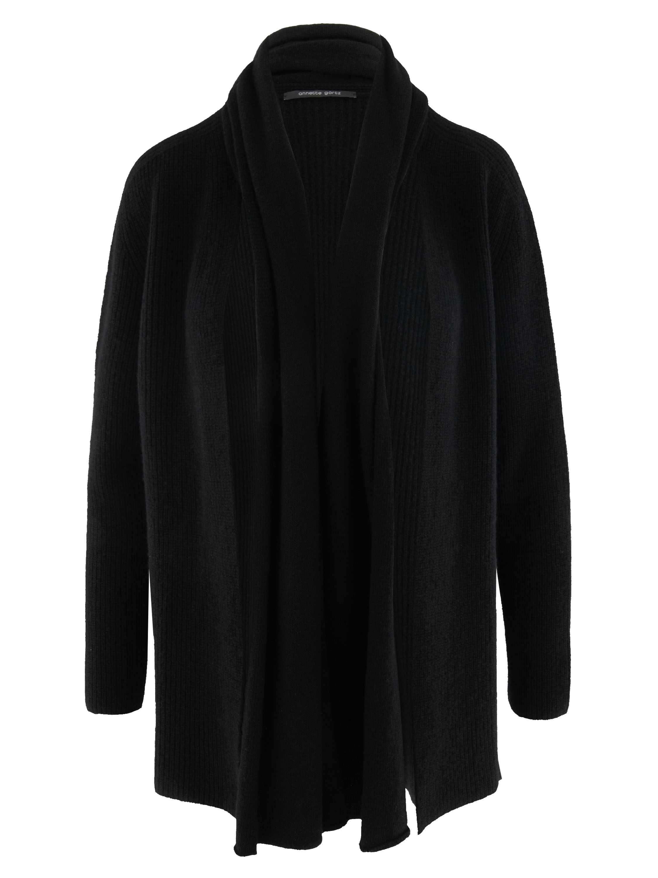 Een luxe gemêleerd vest van Annette Görtz in de kleur zwart. Het vest heeft geen sluiting en de sjaalkraag is vanaf de schouderinzet los van het vest. Dit vest mag met de hand worden gewassen.