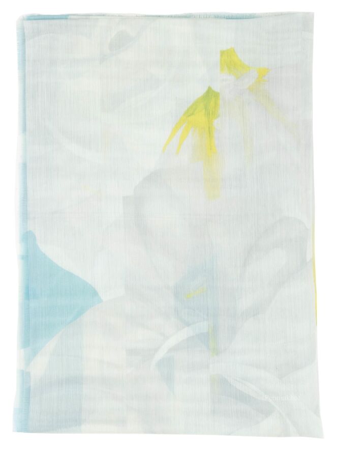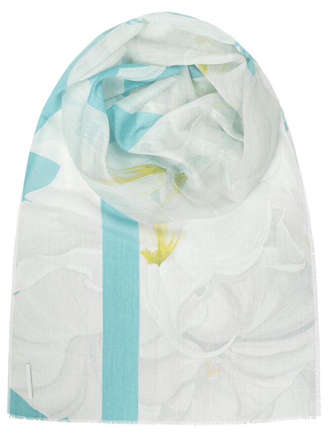 Een luxe licht transparante shawl van Annette Görtz in een grafische print met de kleuren turquoise, limegroen en roomwit. De randen van de shawl zijn fijn gerafeld. Deze shawl mag op de hand worden gewassen.