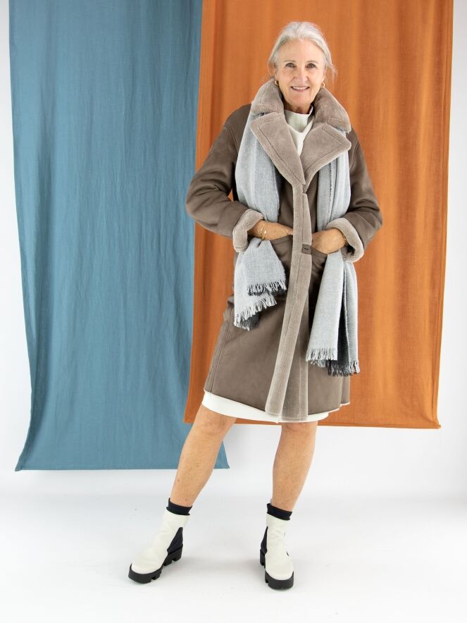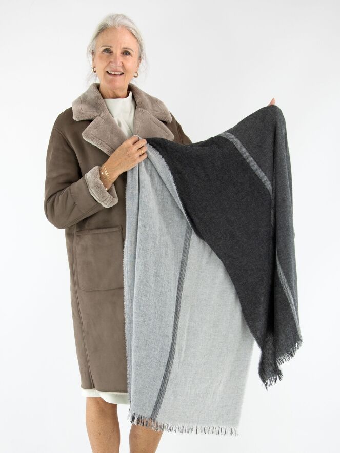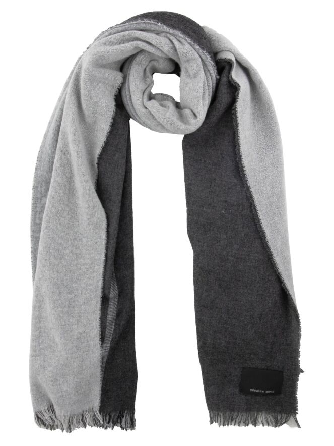 Een luxe shawl van Annette Görtz in grijs met beige. In het midden van de shawl is een verfijnde geruite structuur verwerkt, waarin een zilverkleurig metaaldraad subtiel is meegeweven. De uiteinden zijn fijn gerafeld, wat de shawl een elegante afwerking geeft. Deze shawl mag niet worden gewassen.