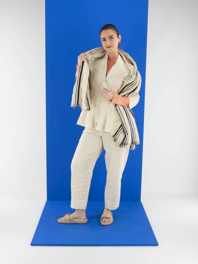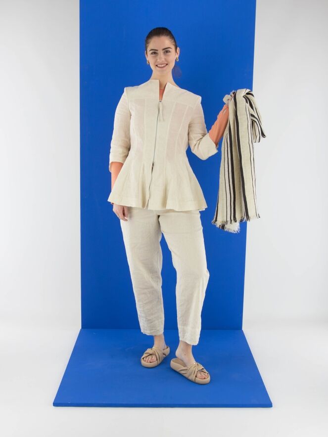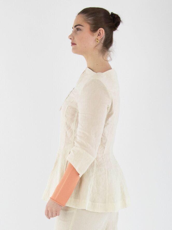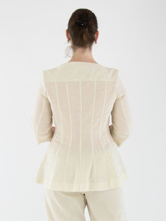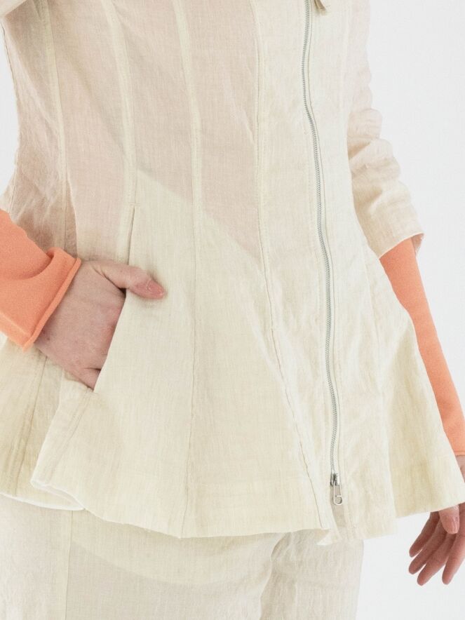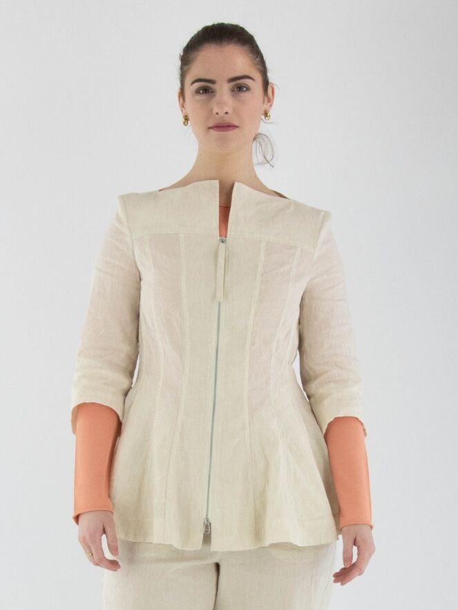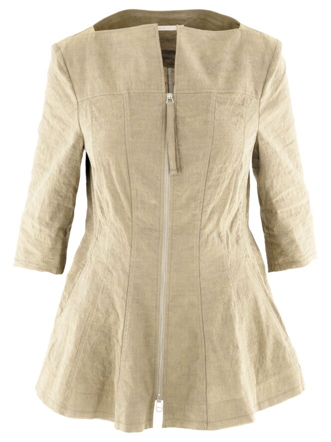 Een getailleerde blazer van Annette Görtz in een beige kleur. De blazer heeft een hoge, brede vierkante hals waarbij de ritssluiting net boven de buste eindigt. Net onder de taille bevinden zich steekzakken. Aan de uiteinden van de halflange mouwen is een voile bies langs de randen. Deze blazer is ongevoerd en kan op 30 graden worden gewassen.