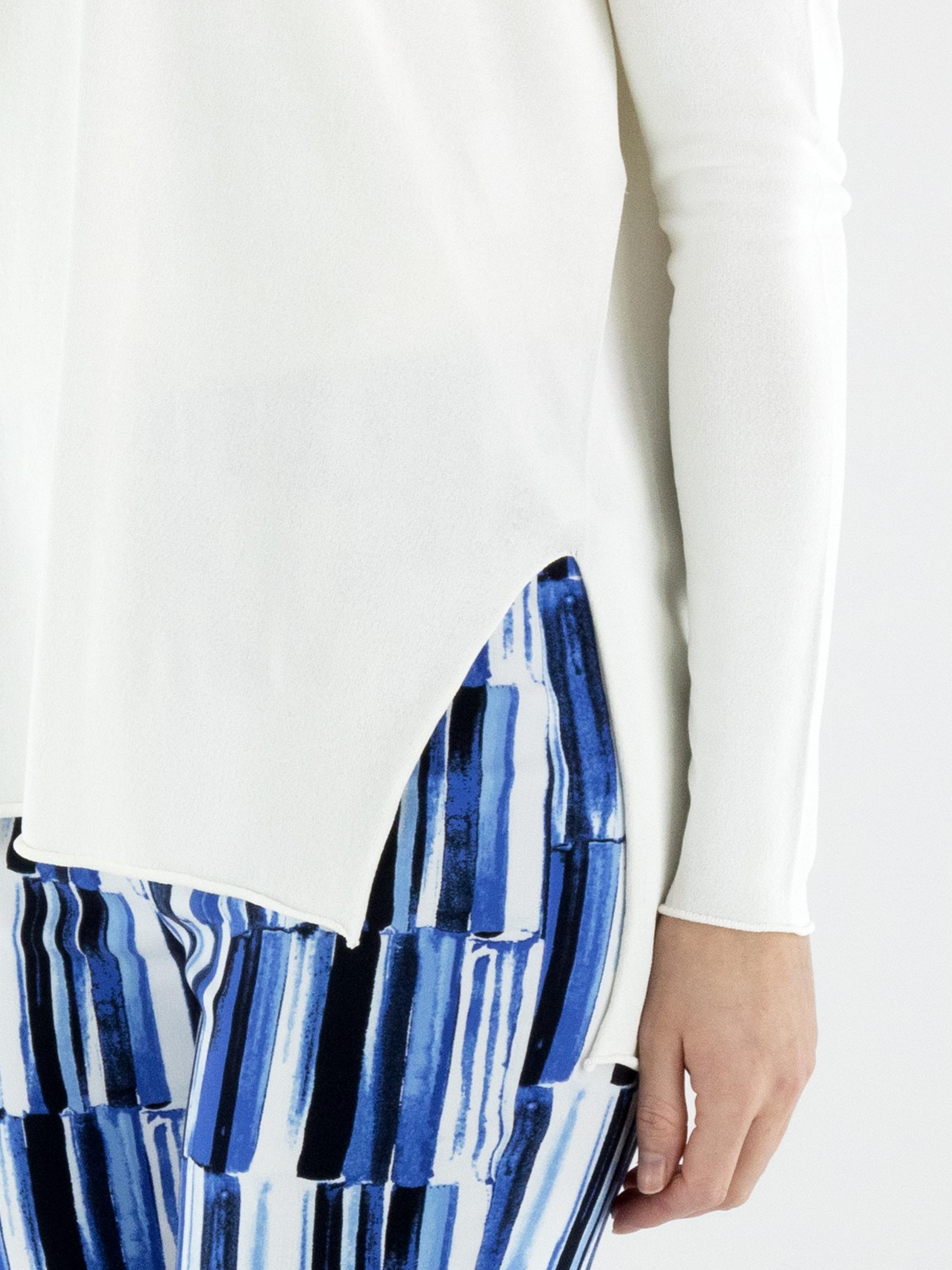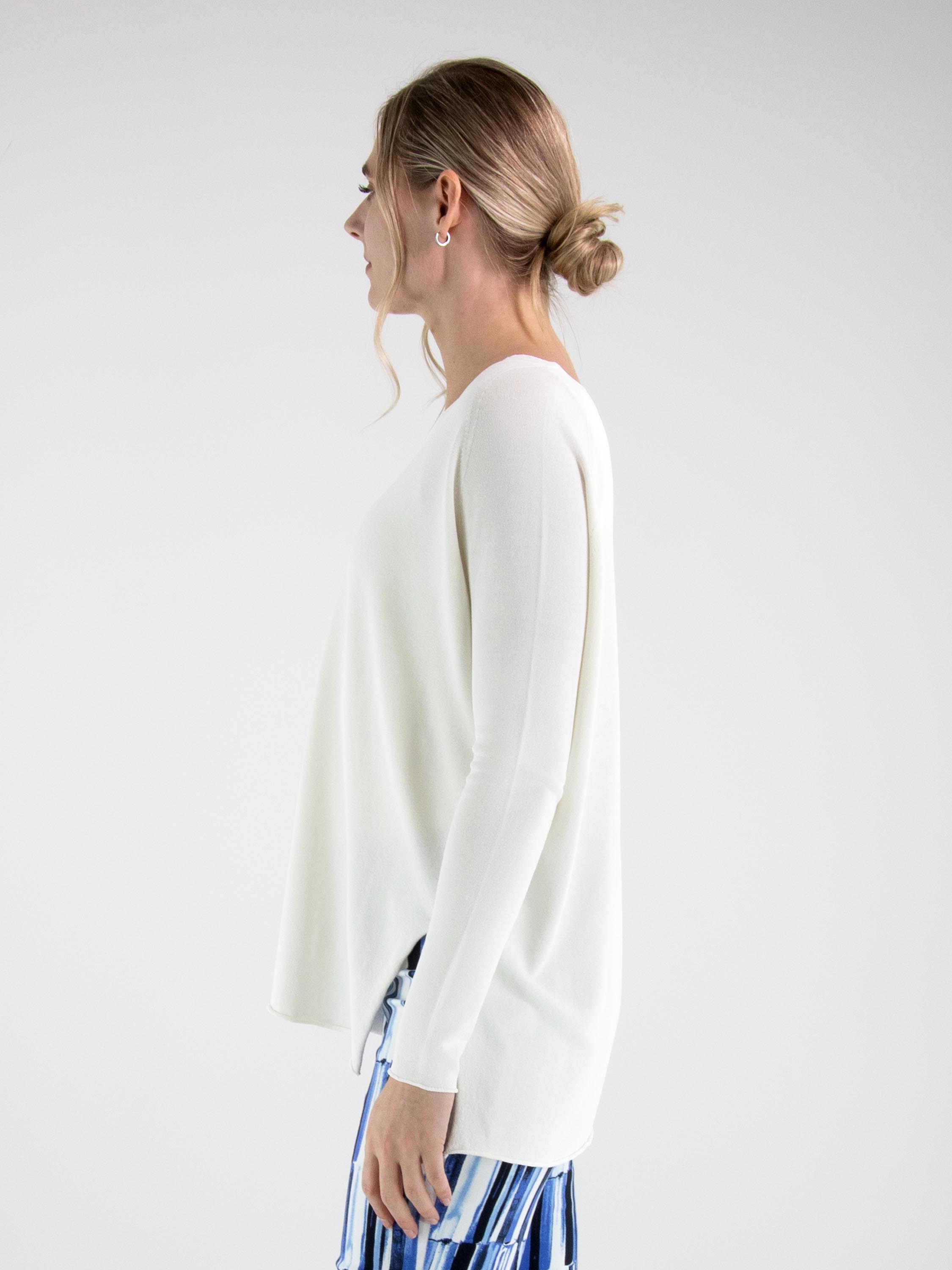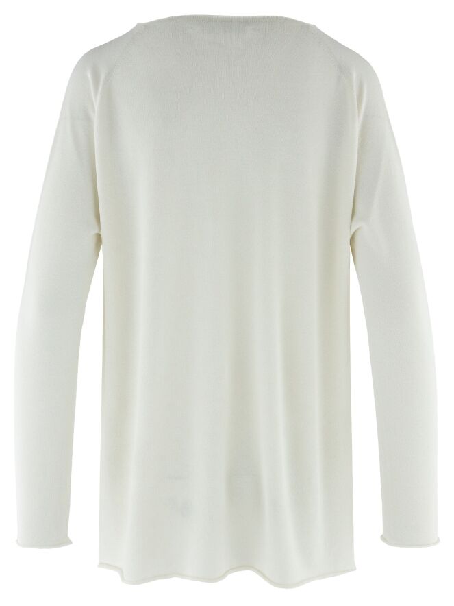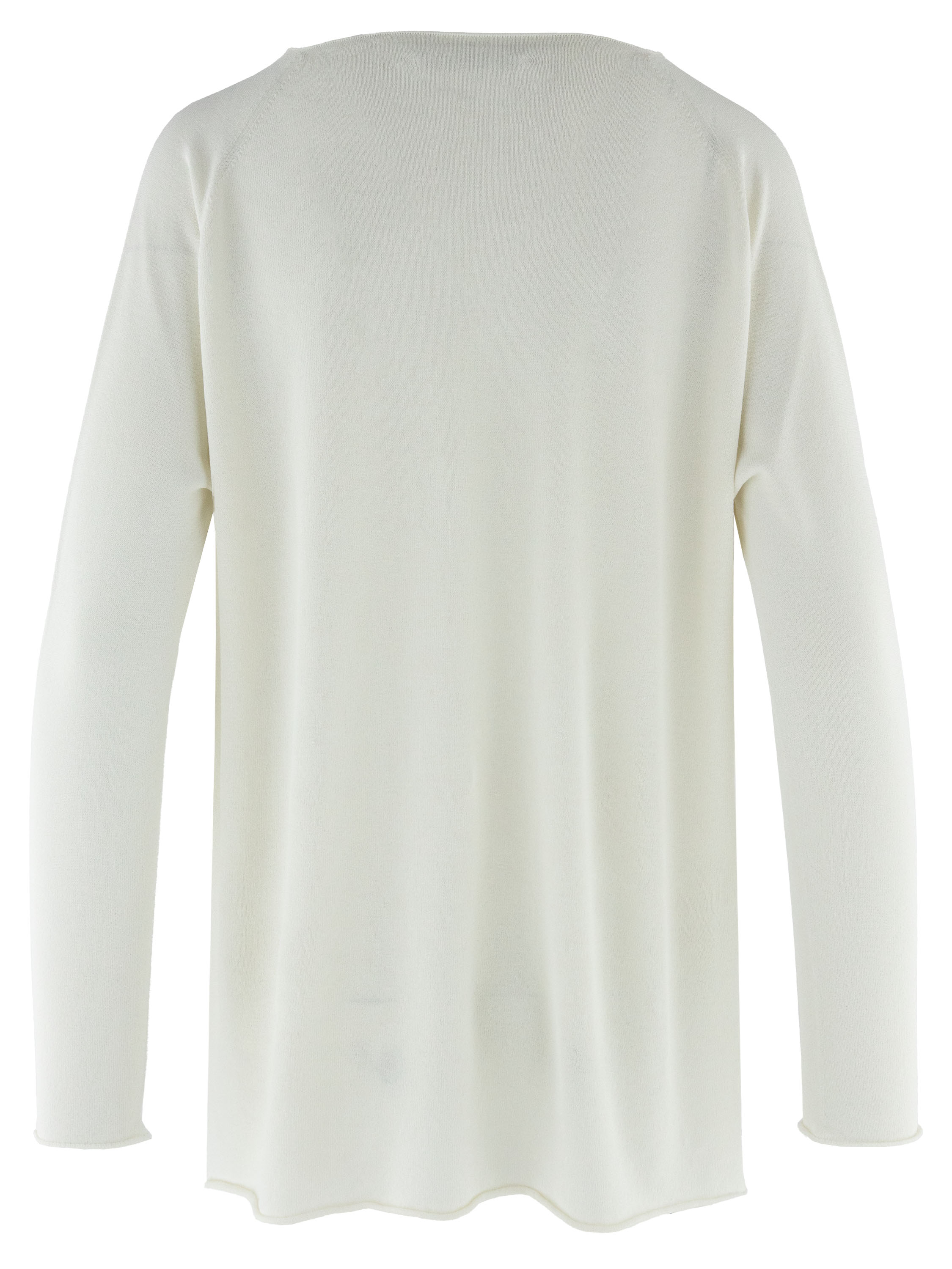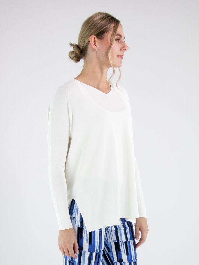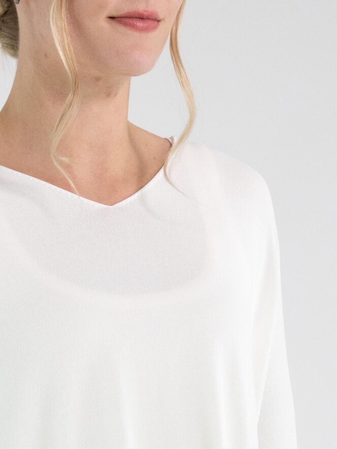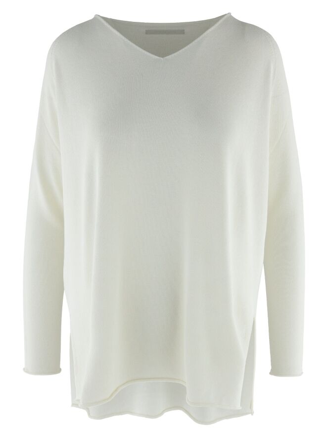 Een pullover van Annette Görtz in een roomwitte kleur. De pullover heeft een V-hals en lange mouwen. Aan de onderkant zijn aan beide zijden splitten aangebracht. De rand aan de onderkant en aan de uiteinden van de mouwen is geruld afgewerkt. Deze pullover kan op 30 graden worden gewassen.
