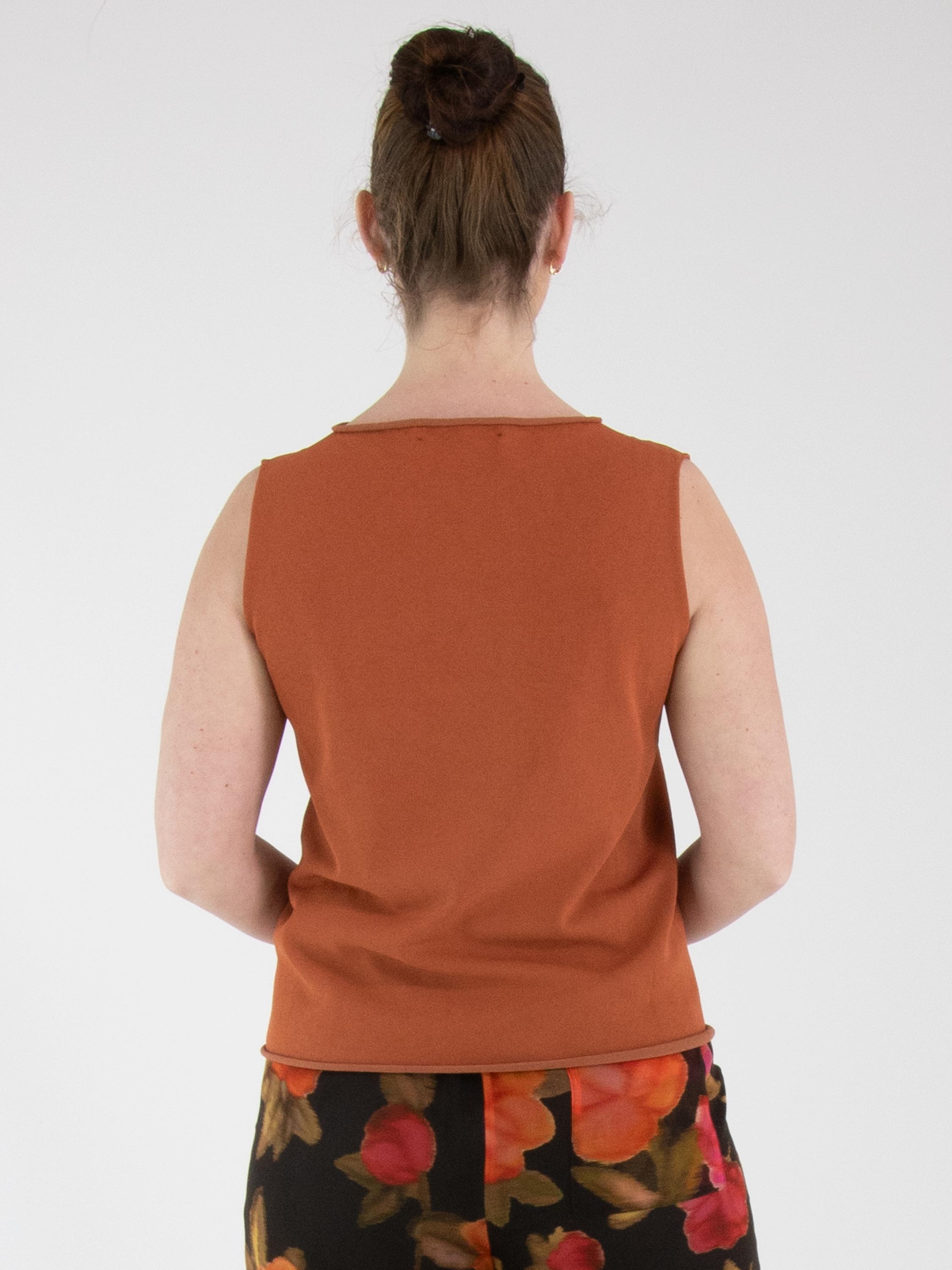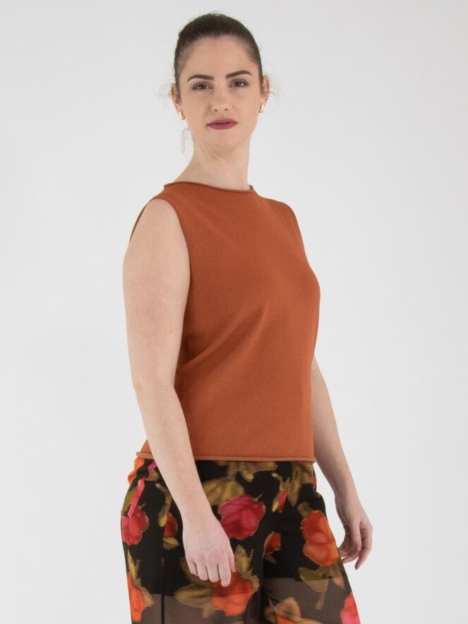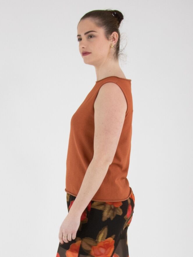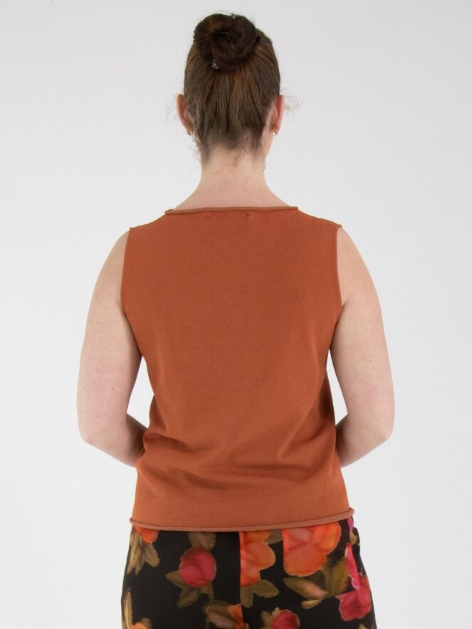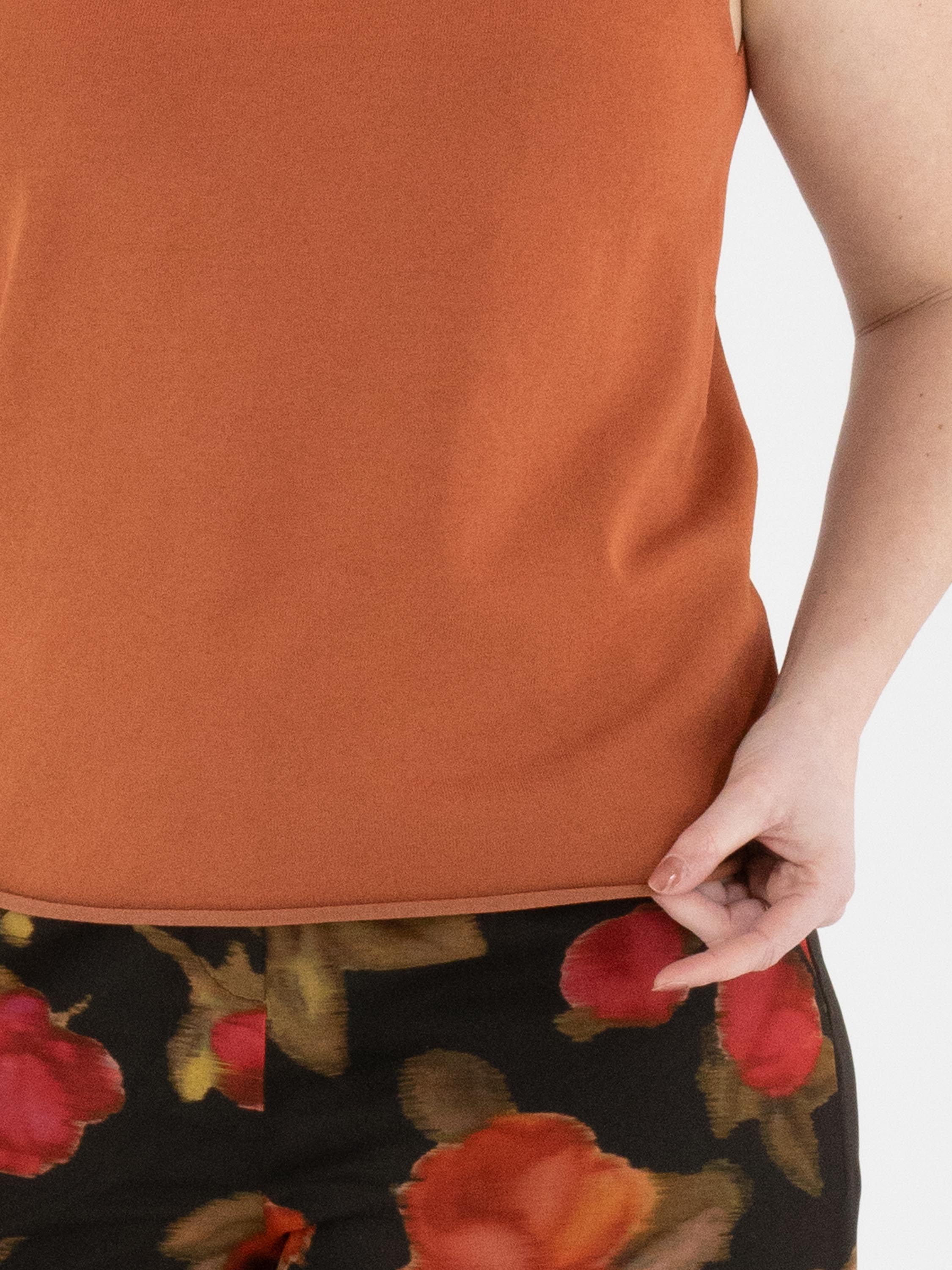 Een top van Annette Görtz in een roestbruine kleur. De rand van de ronde hals, de mouwinzet en de onderkant zijn geruld afgewerkt. Deze top kan op 30 graden worden gewassen.