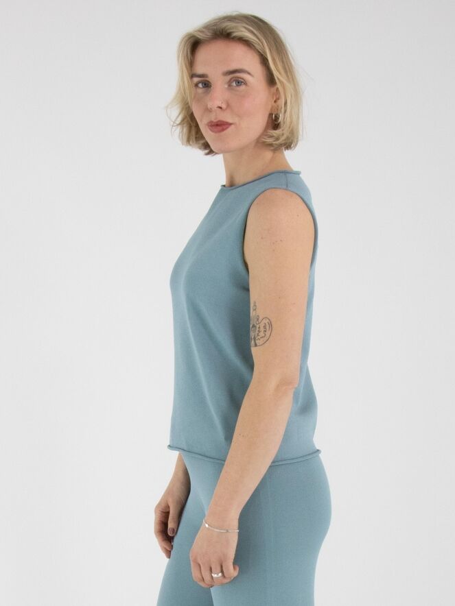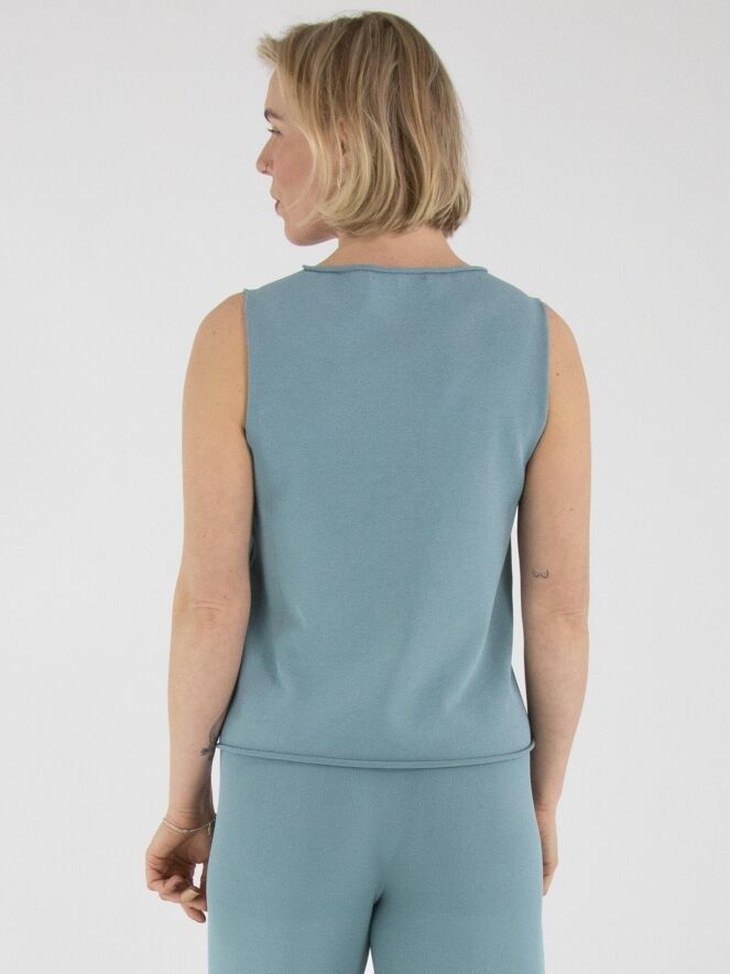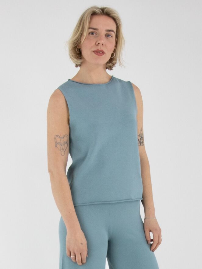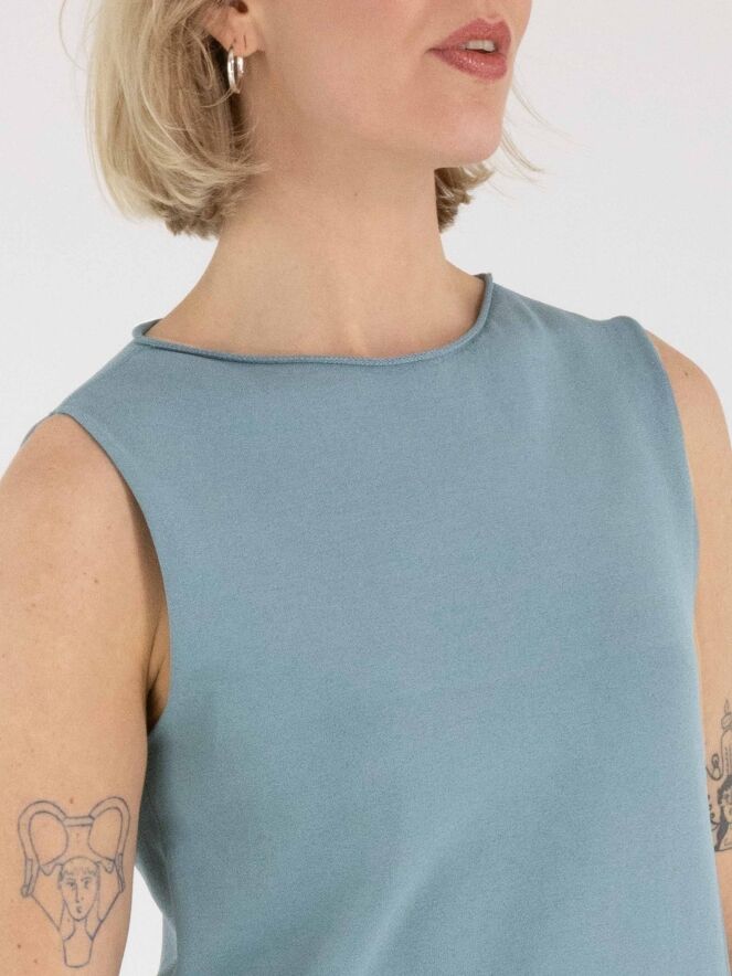 Een top van Annette Görtz in een petrolblauwe kleur. De rand van de ronde hals, de mouwinzet en de onderkant zijn geruld. Deze top kan op 30 graden worden gewassen.