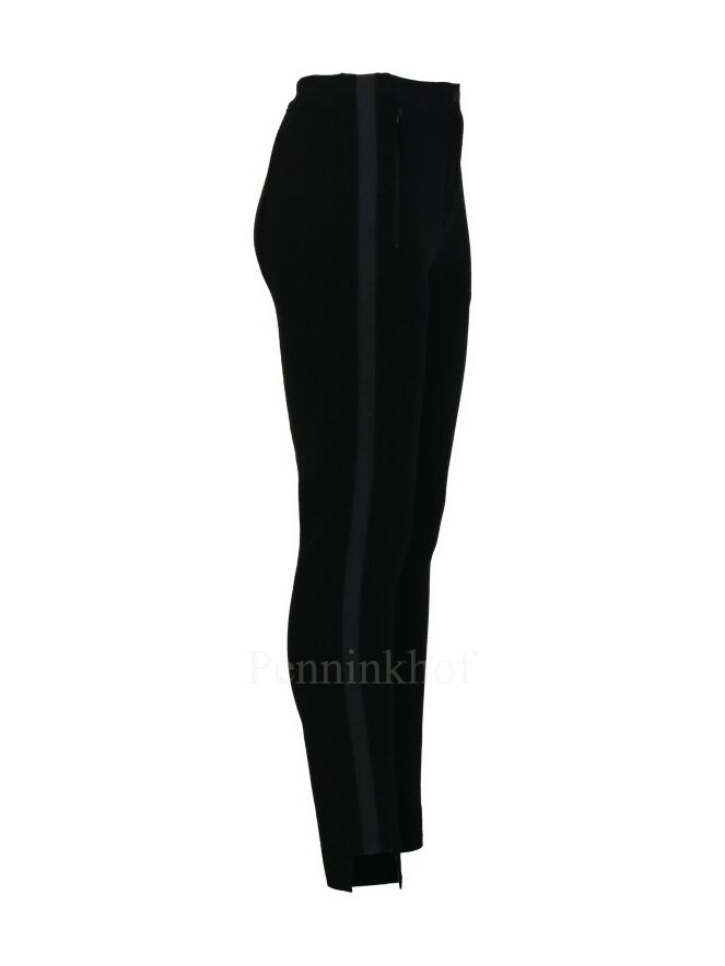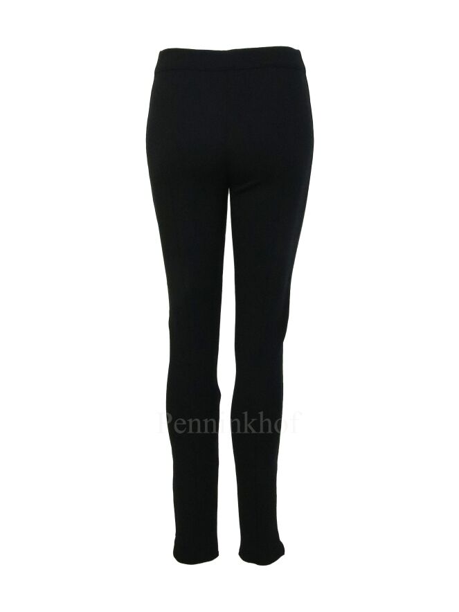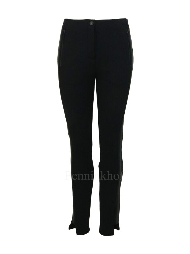 Een elastische broek van Annette Görtz in de kleur zwart. De zakken hebben een verticale ritssluiting. Langs de zijkanten is een brede mat zwarte bies. Aan de onderkant van de pijpen is aan de buitenzijde een inkeping. Deze broek mag op de hand worden gewassen.