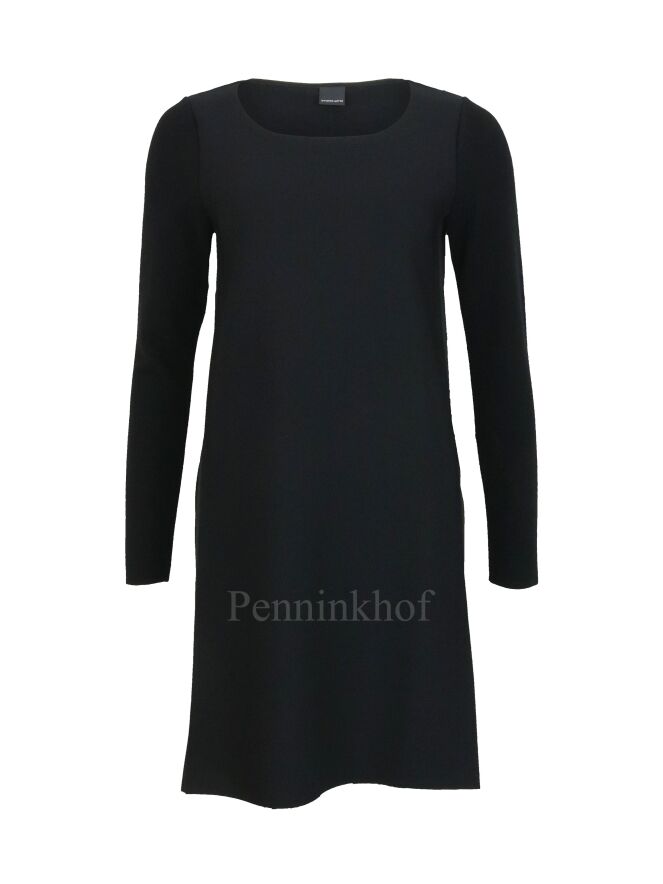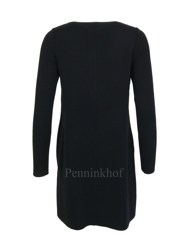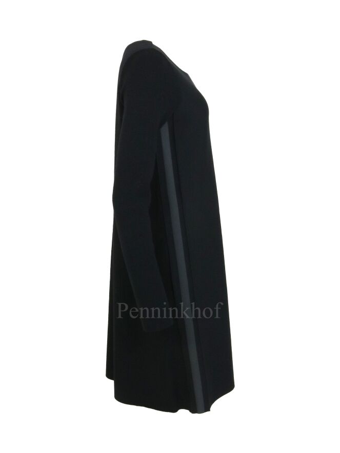 Een jurk van Annette Görtz in de kleur zwart. Aan beide zijkanten van de jurk zijn omgekeerde stiknaden met een mat zwarte bies ertussen. De jurk heeft een ronde hals, lange mouwen en mag op de hand worden gewassen.