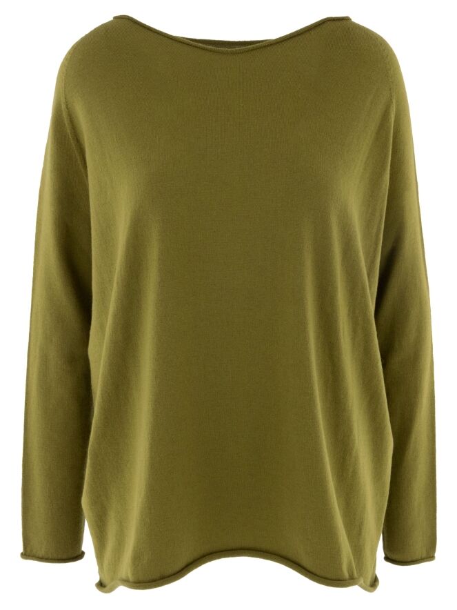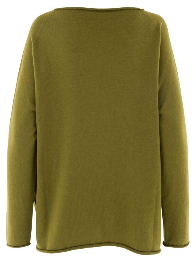 Een ruime pullover van Annette Görtz in een heldere olijfgroene kleur. De randen van de ronde hals, de onderkant en de uiteinden van de lange mouwen zijn gerold. Deze pullover mag met de hand worden gewassen.