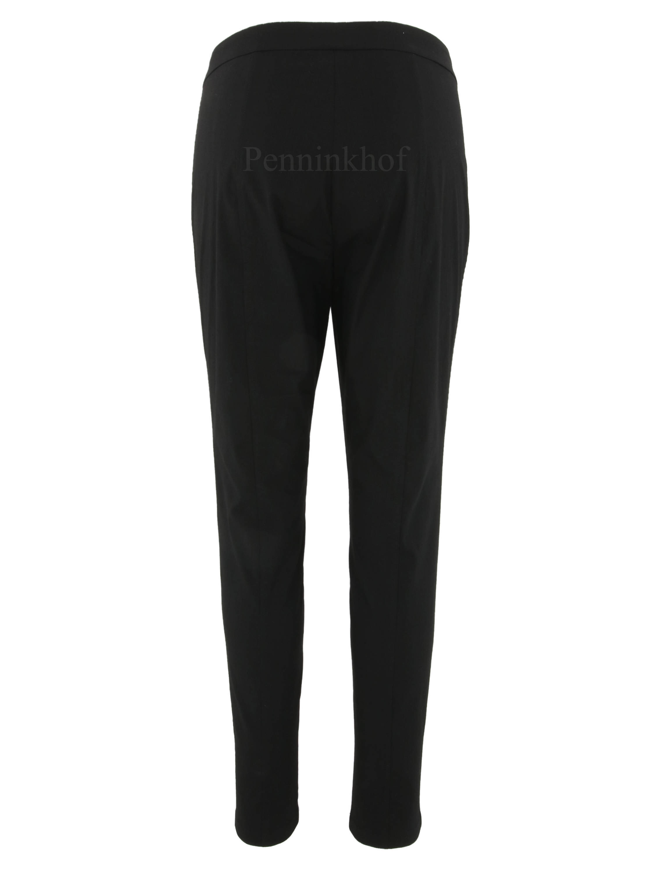 Een broek van Annette Görtz in de kleur zwart. langs de zijkant van de pijpen is een fijn geribbelde bies in dezelfde kleur als de broek. Deze broek mag op 30 graden worden gewassen.