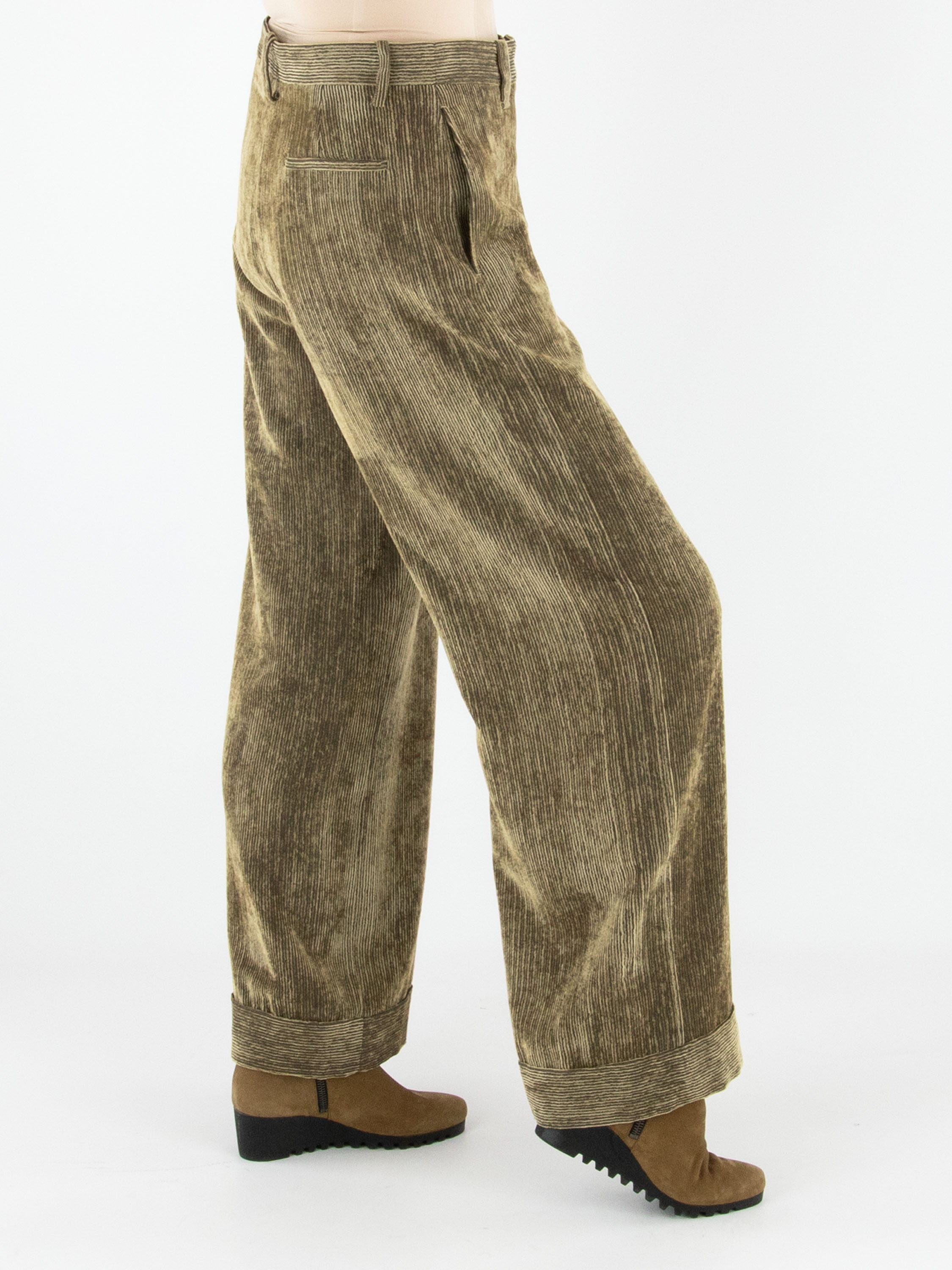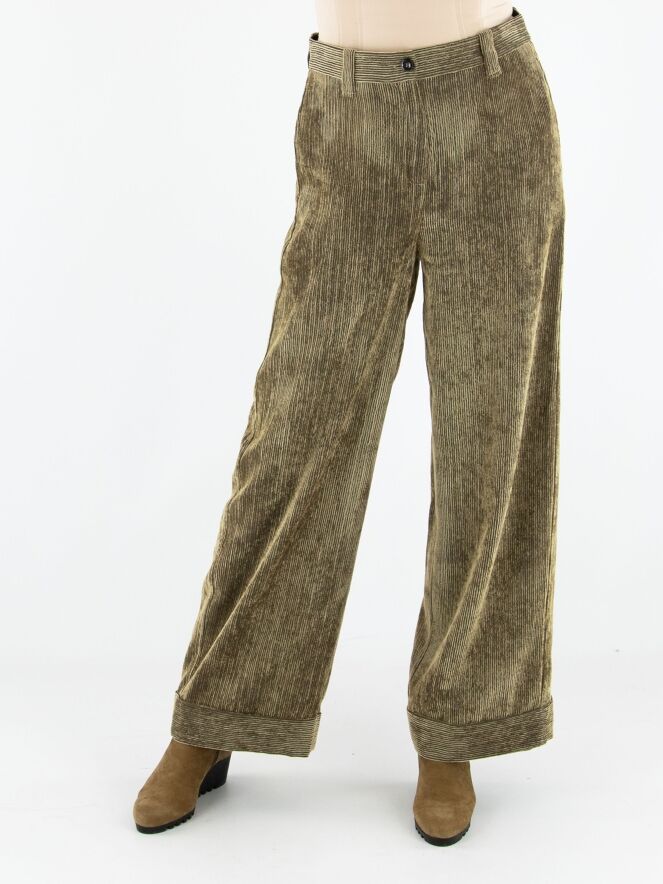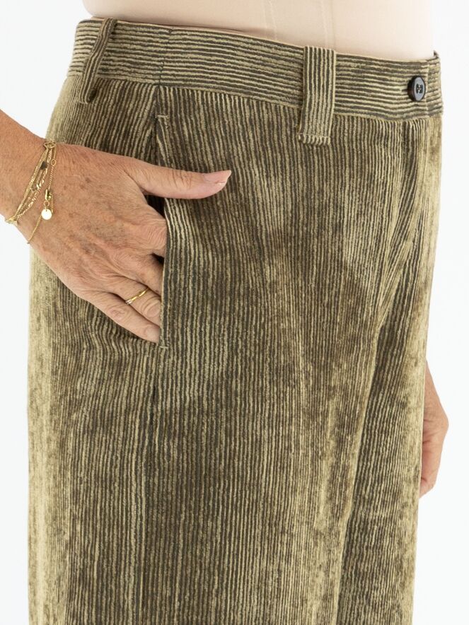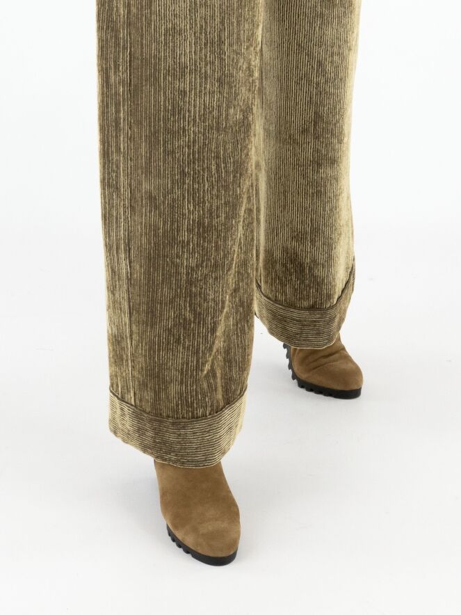 Een wijde broek van Annette Görtz in ribcord, uitgevoerd in meerdere olijfgroene tinten die variëren afhankelijk van de vleug. Aan de onderkant is een brede omslag. De broek heeft steekzakken en mag met de hand worden gewassen.