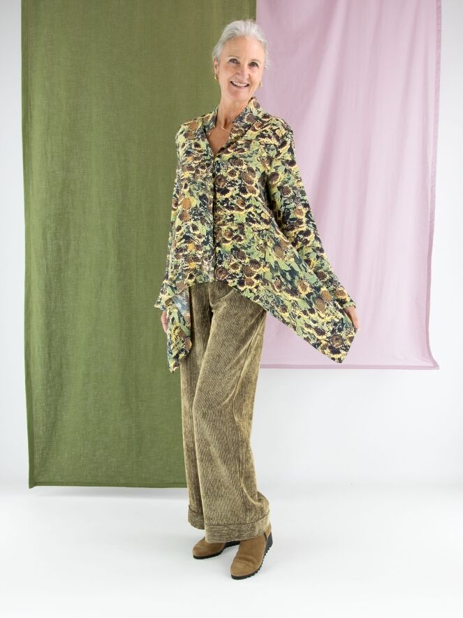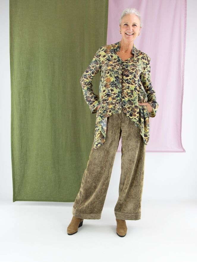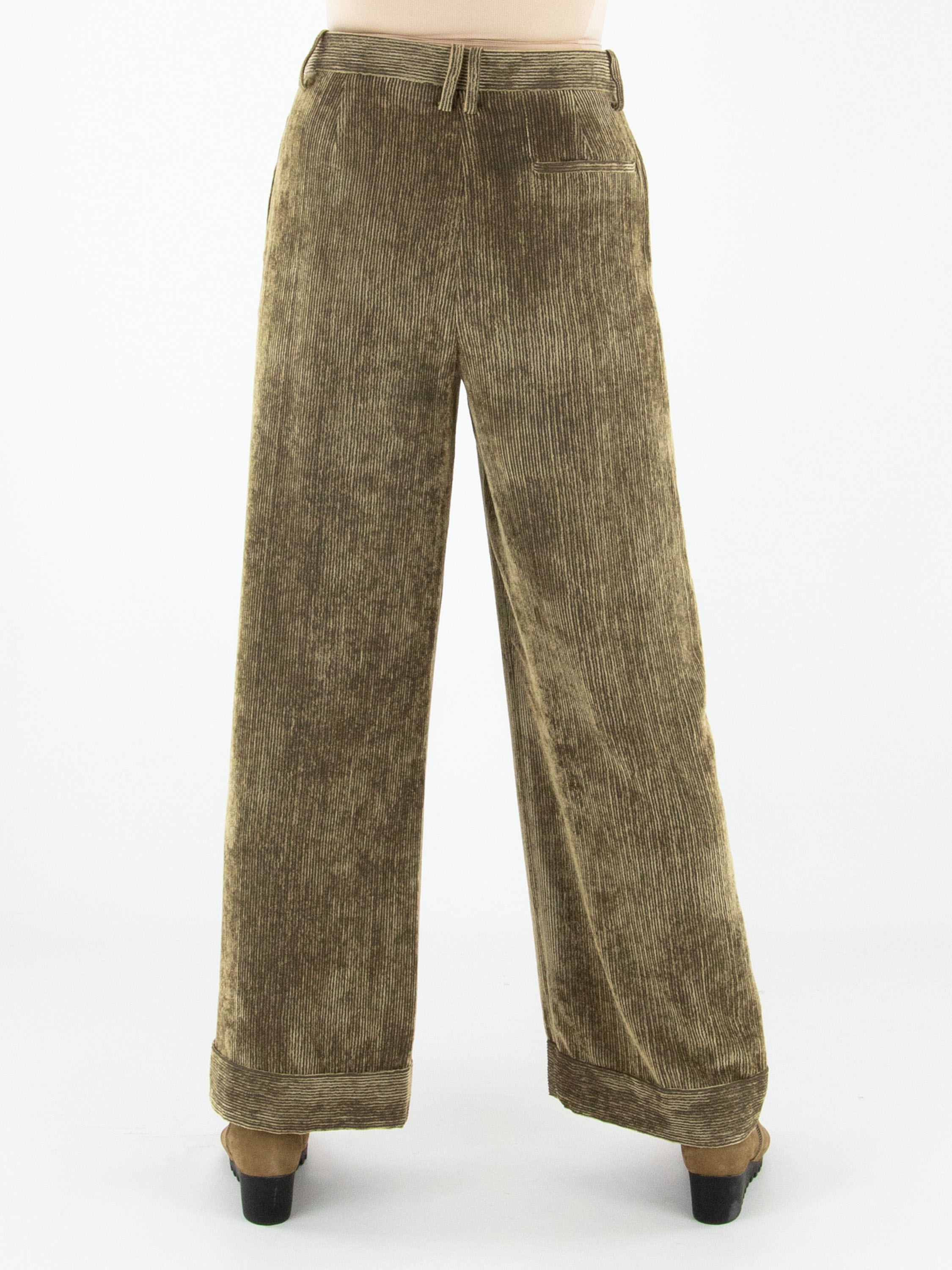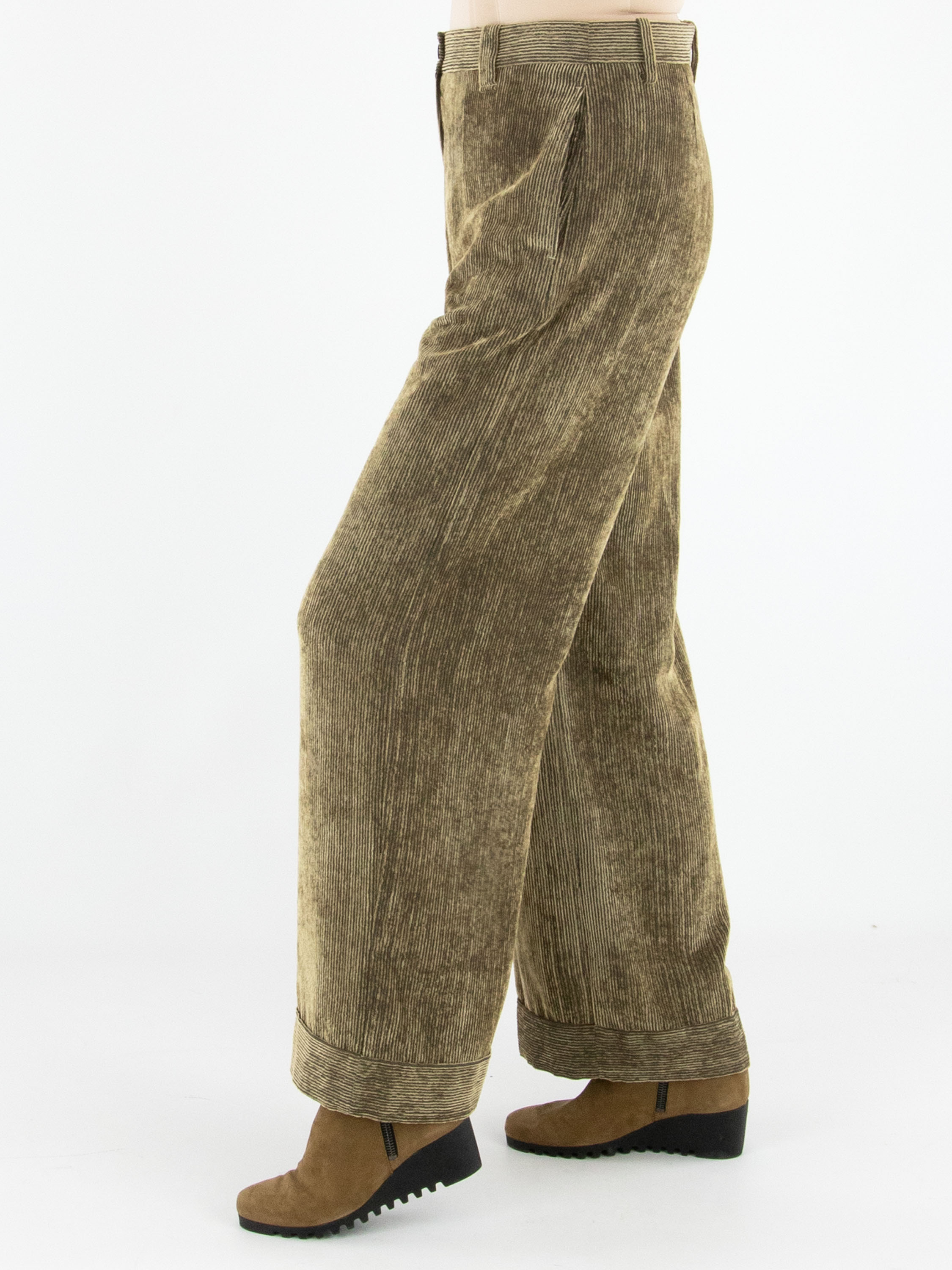 Een wijde broek van Annette Görtz in ribcord, uitgevoerd in meerdere olijfgroene tinten die variëren afhankelijk van de vleug. Aan de onderkant is een brede omslag. De broek heeft steekzakken en mag met de hand worden gewassen.