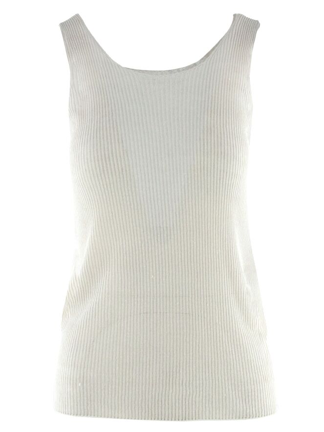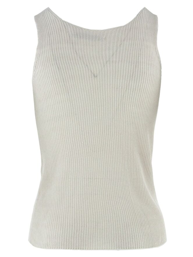 Top van Annette Görtz in een lichtgrijze tint. De stof heeft een subtiele geribbelde structuur, wat zorgt voor een verfijnd en modern effect. De top heeft een ronde hals en schouderbandjes van circa 3 cm breed. Deze top kan met de hand worden gewassen.