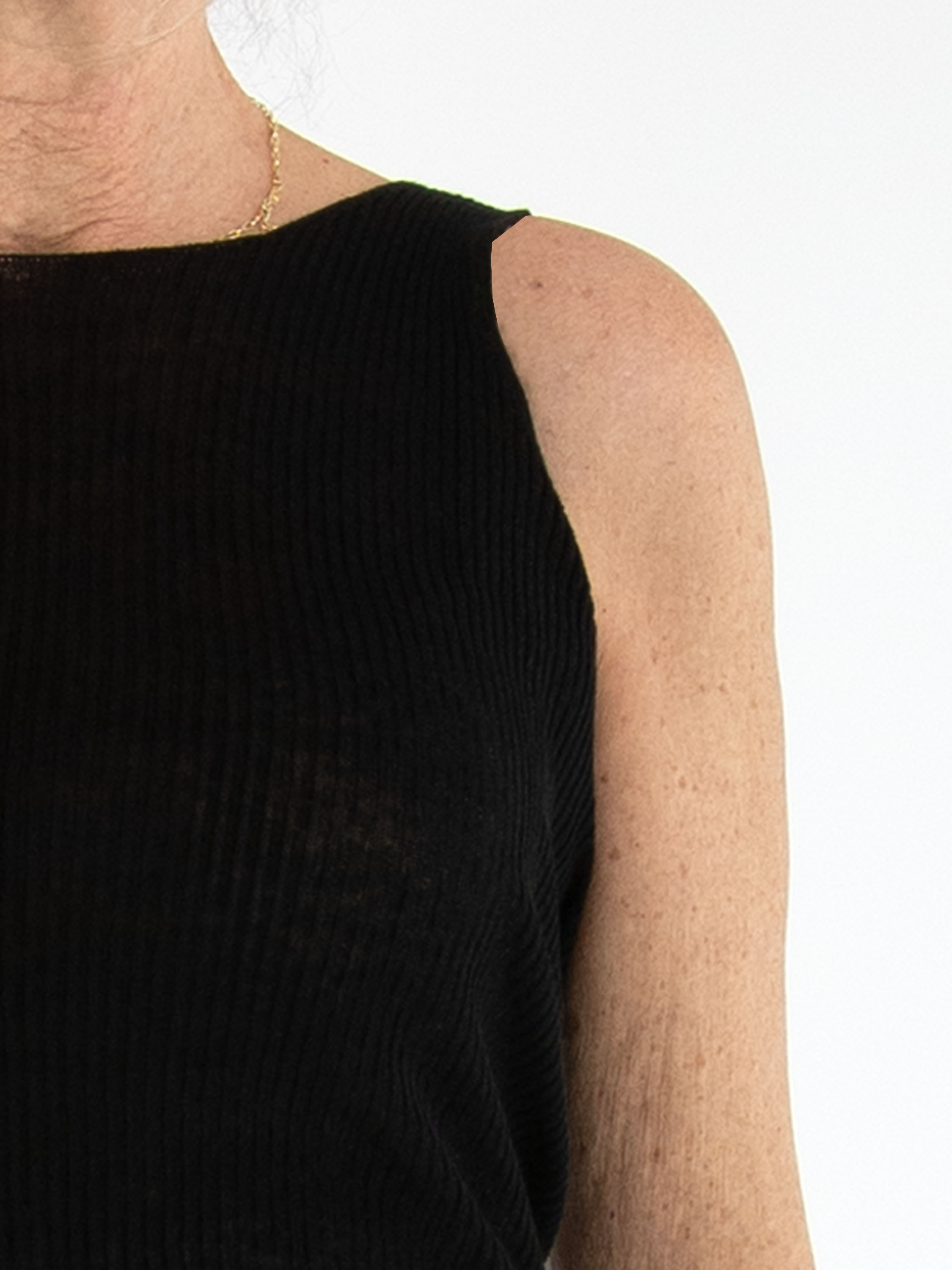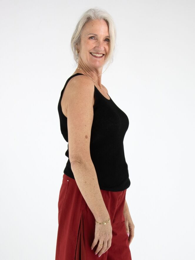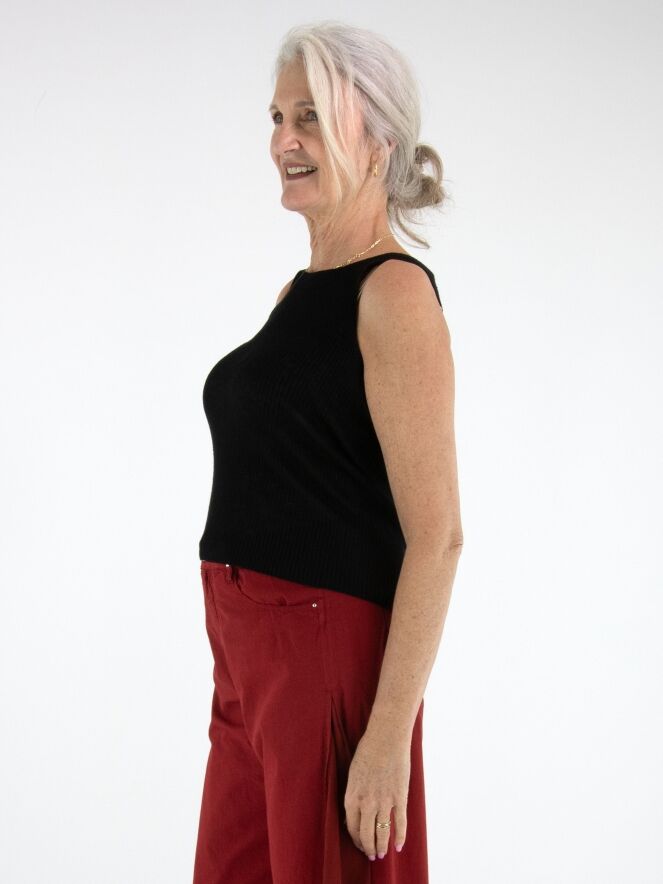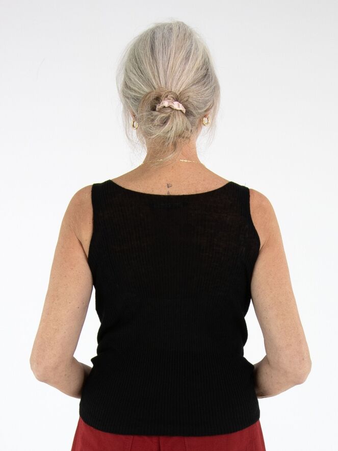 Top van Annette Görtz in een zwarte tint. De stof heeft een subtiele geribbelde structuur, wat het ontwerp een moderne en verfijnde uitstraling geeft. De top heeft een ronde hals en schouderbandjes van circa 3 cm breed. Deze top kan met de hand worden gewassen.