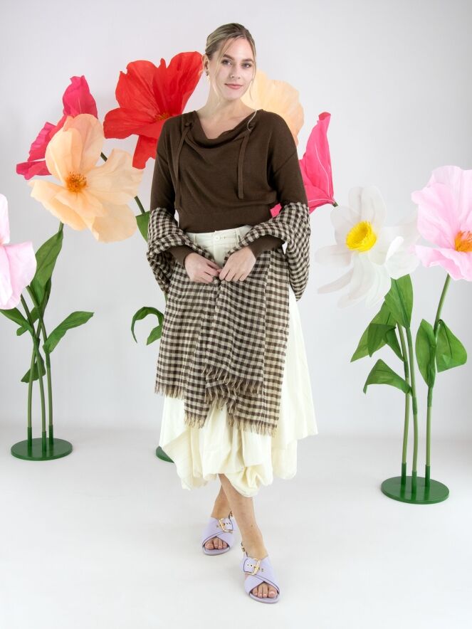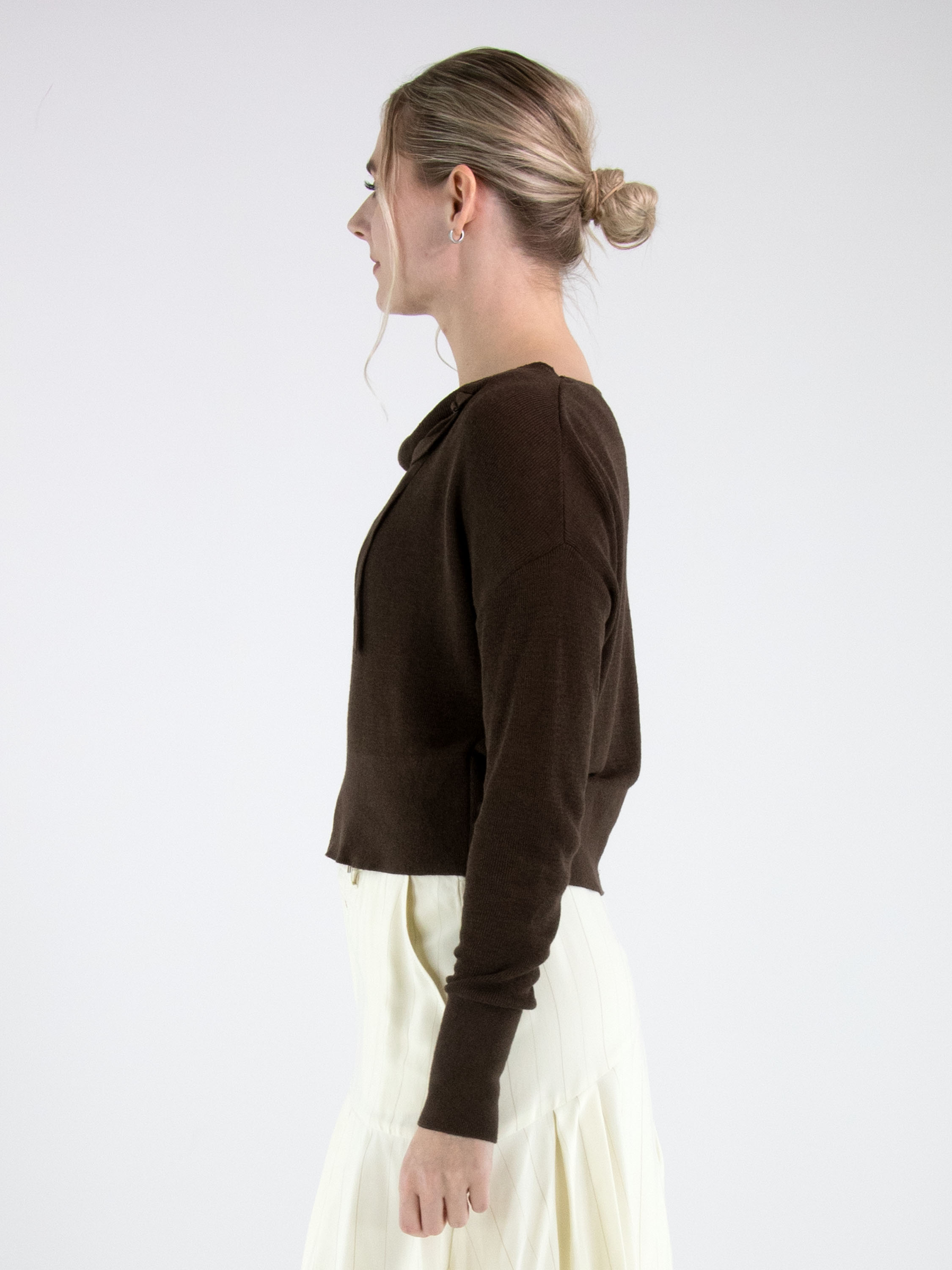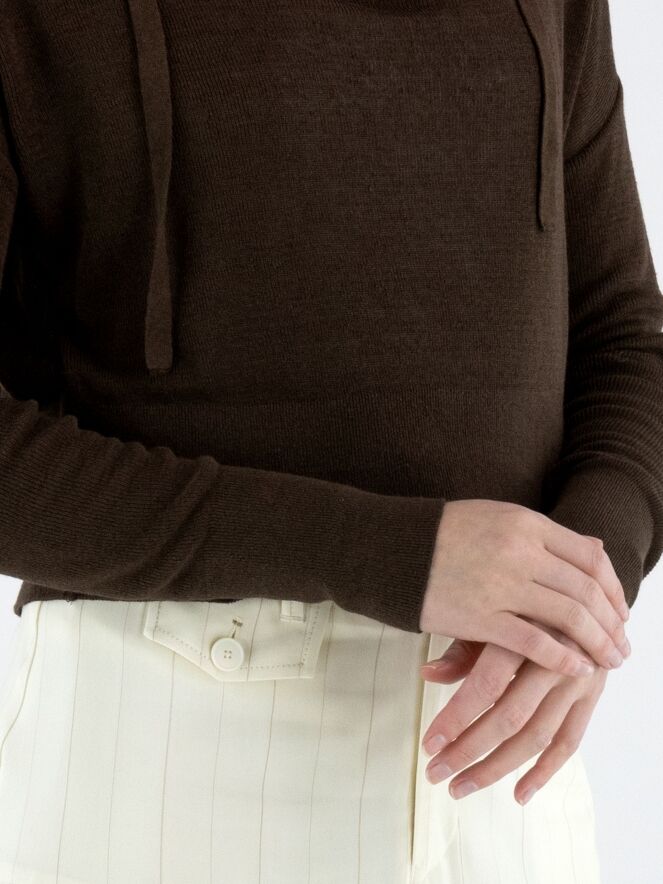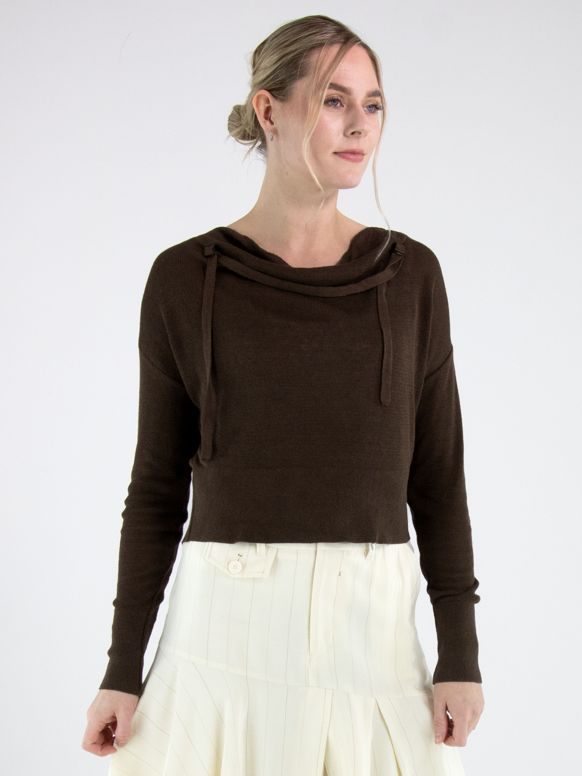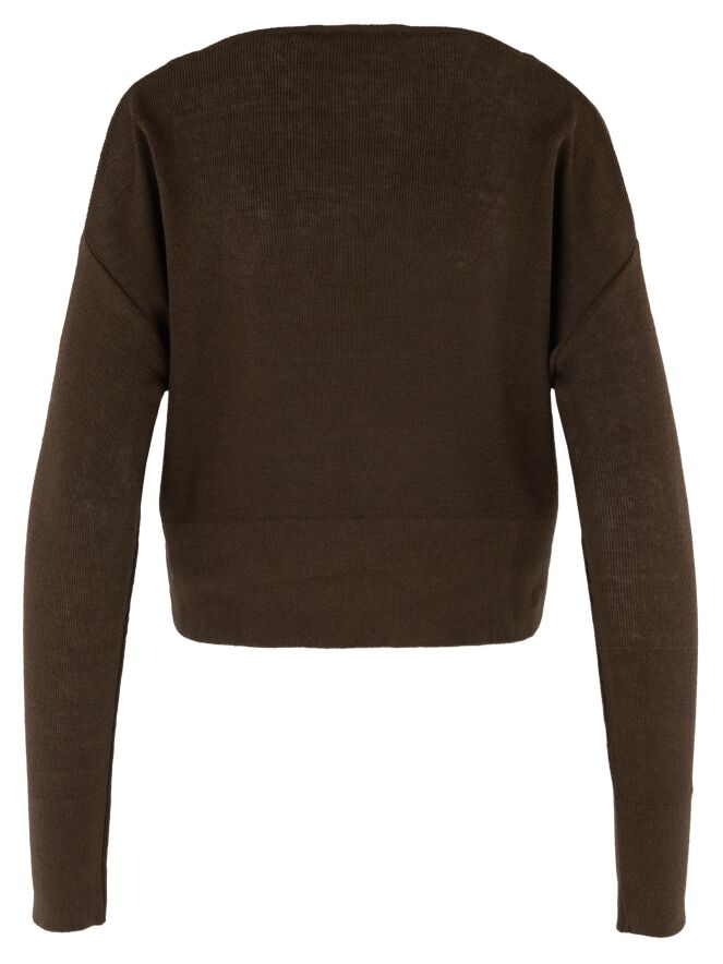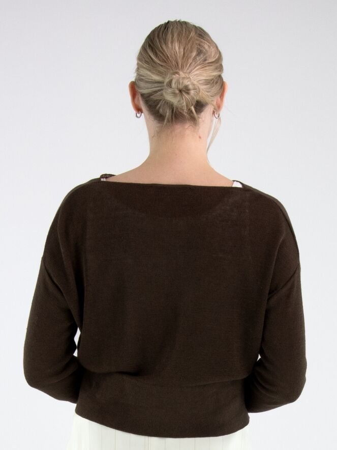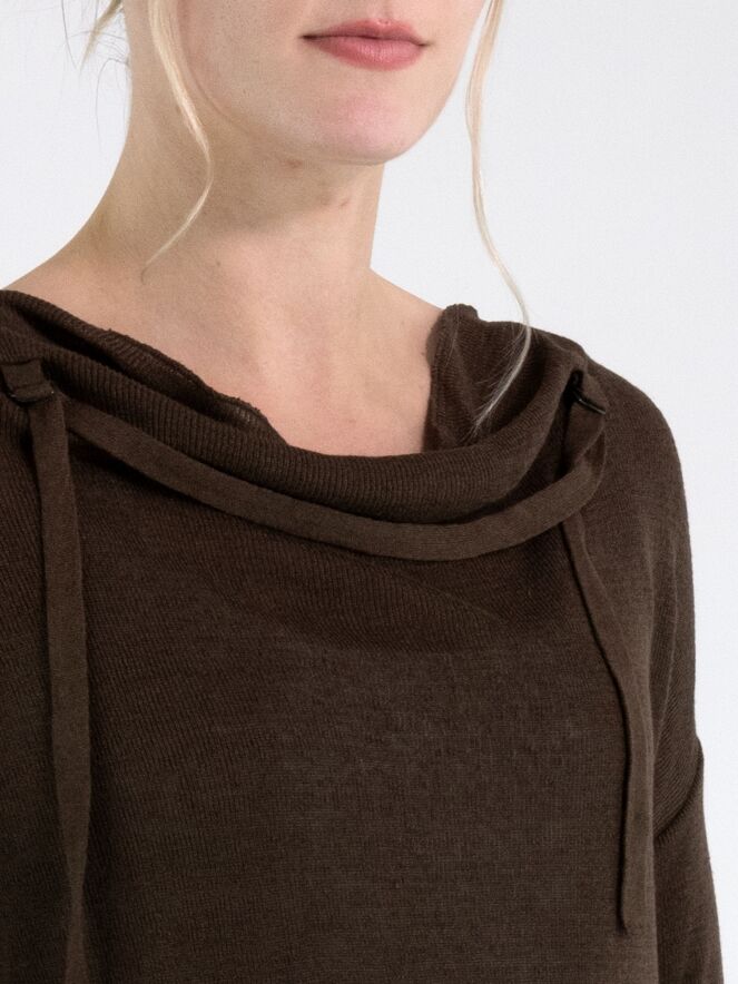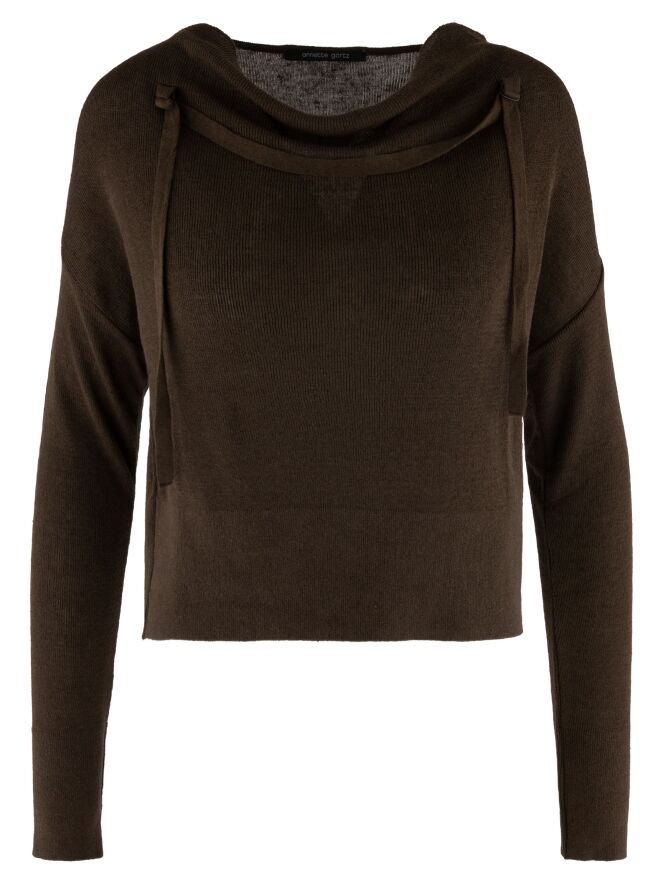 Een korte luxe pullover van Annette Görtz in een mokkabruine kleur. De pullover heeft een vallende hals. Langs de halslijn is een dun, verstelbaar lint aangebracht in dezelfde stof als de pullover, dat aan de voorzijde van beide schouders is bevestigd. Aan de onderkant en aan de uiteinden van de lange mouwen is een brede, fijn geribbelde boord verwerkt. Deze pullover kan met de hand worden gewassen.