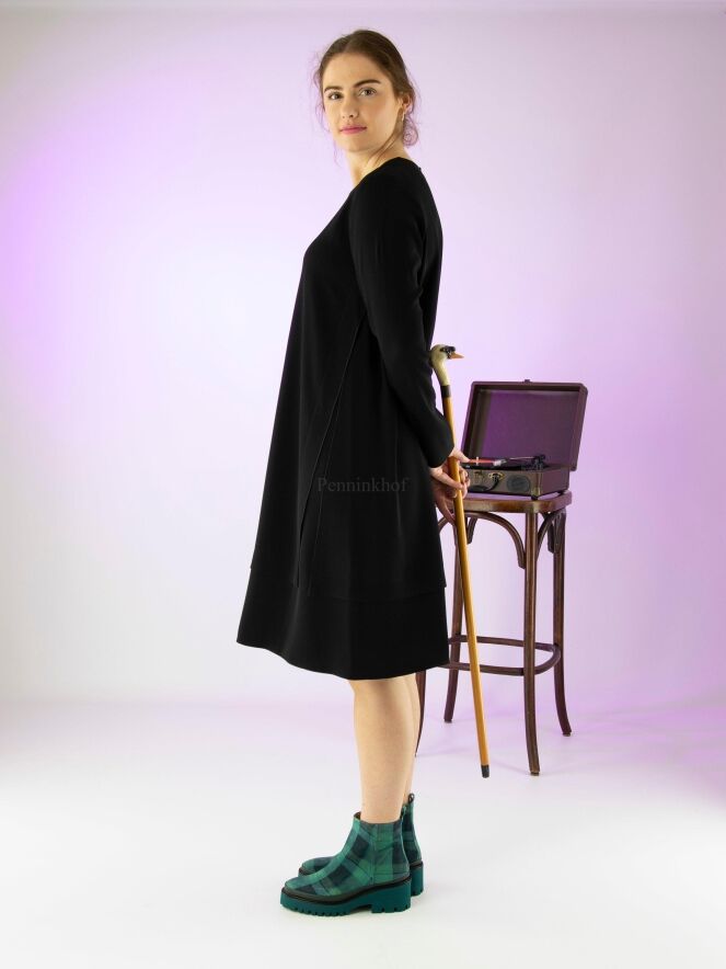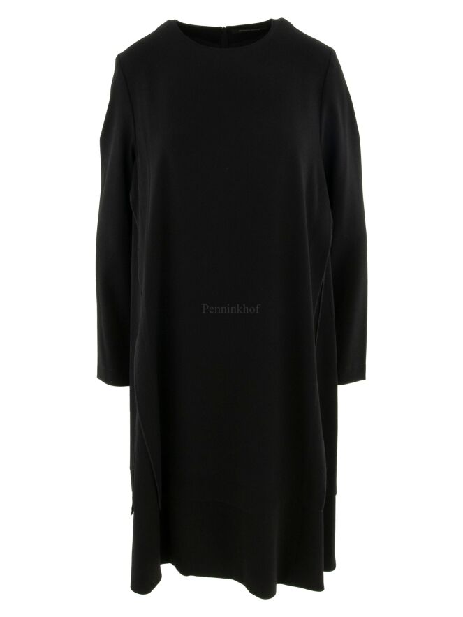 Een jurk van Annette Görtz in de kleur zwart. Langs de zijkanten is de stof open met daaronder een diepzwarte stof die ook aan de onderkant van de jurk tevoorschijn komt. De jurk heeft een ronde hals en mag op de hand worden gewassen.