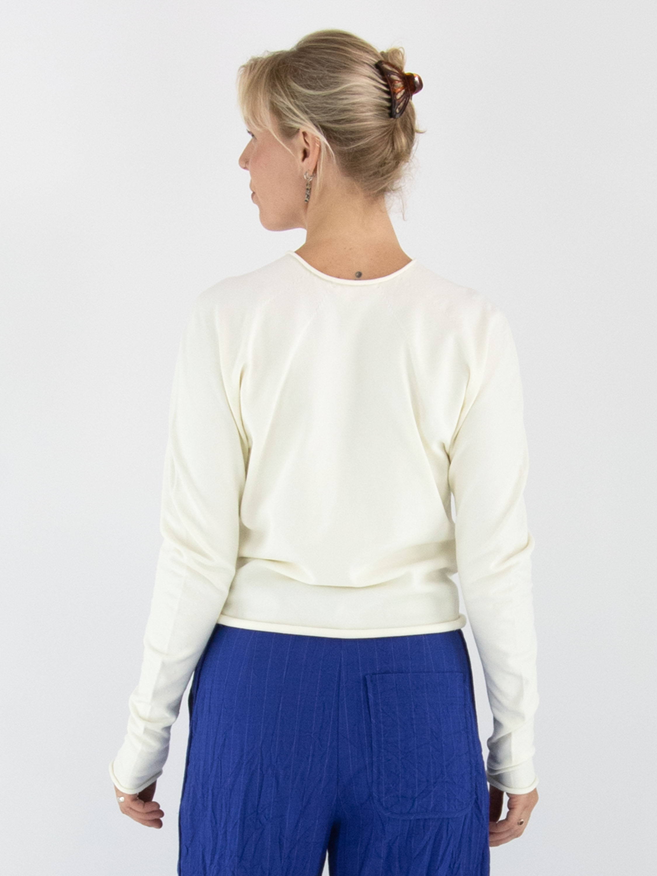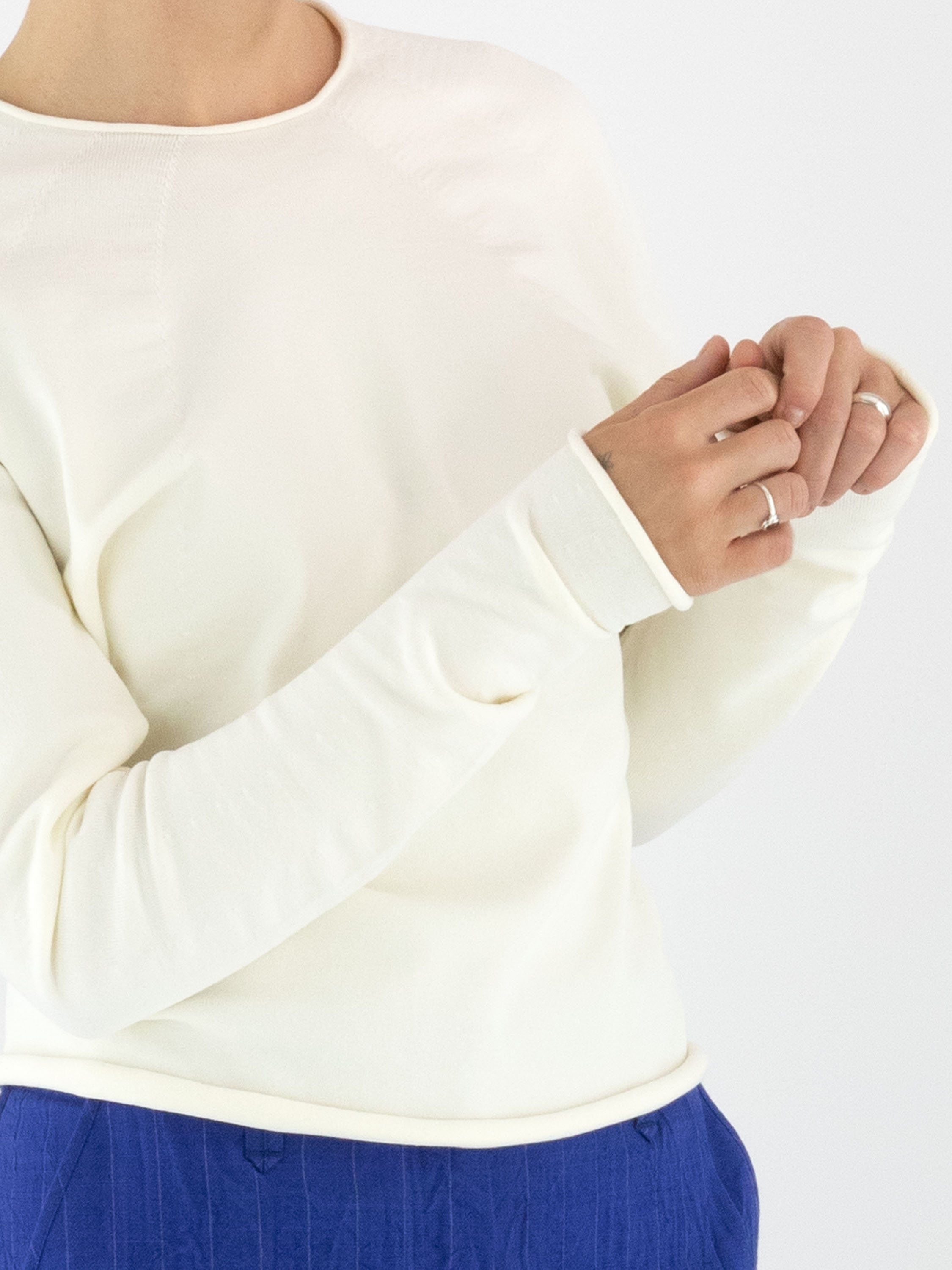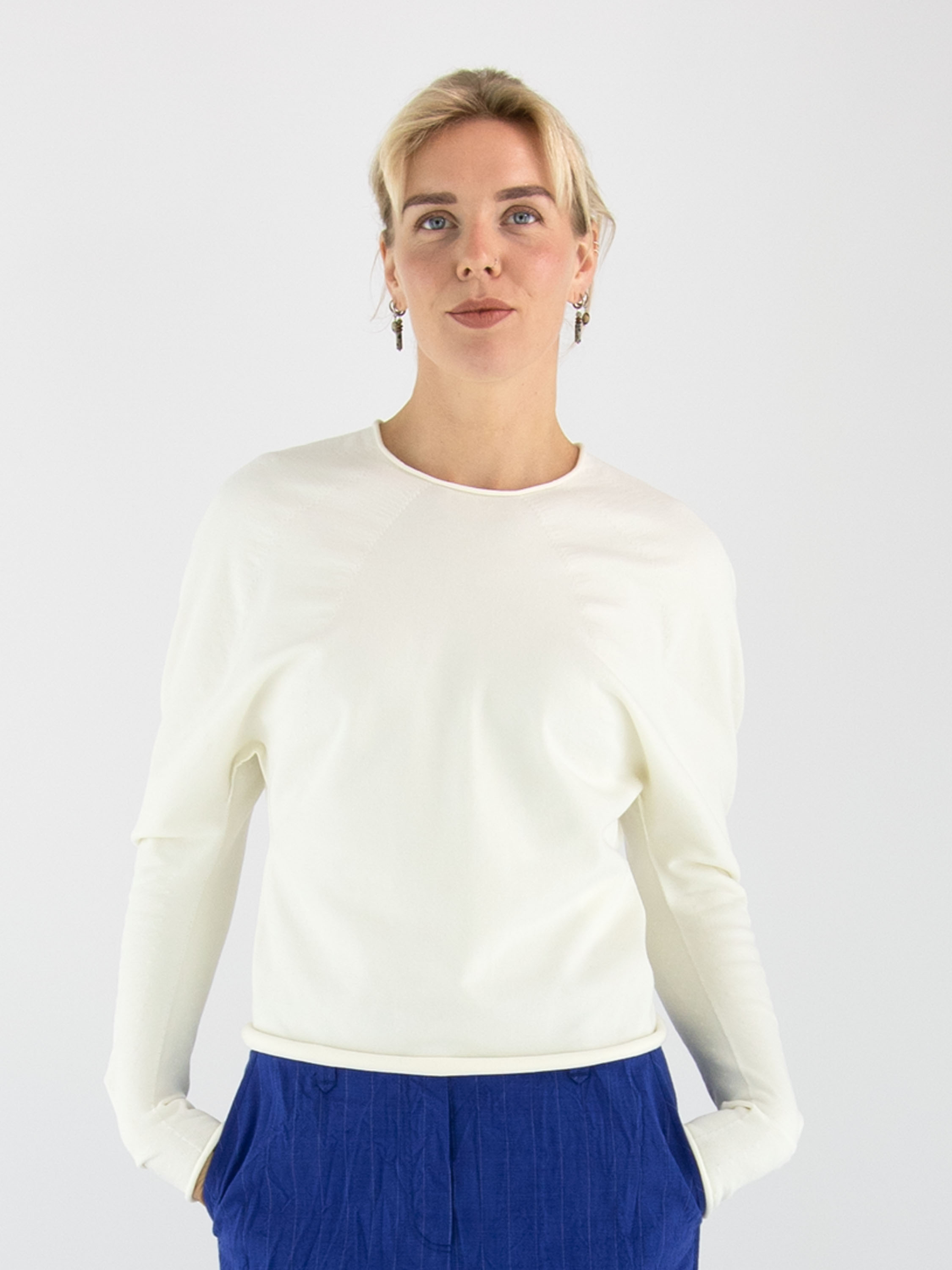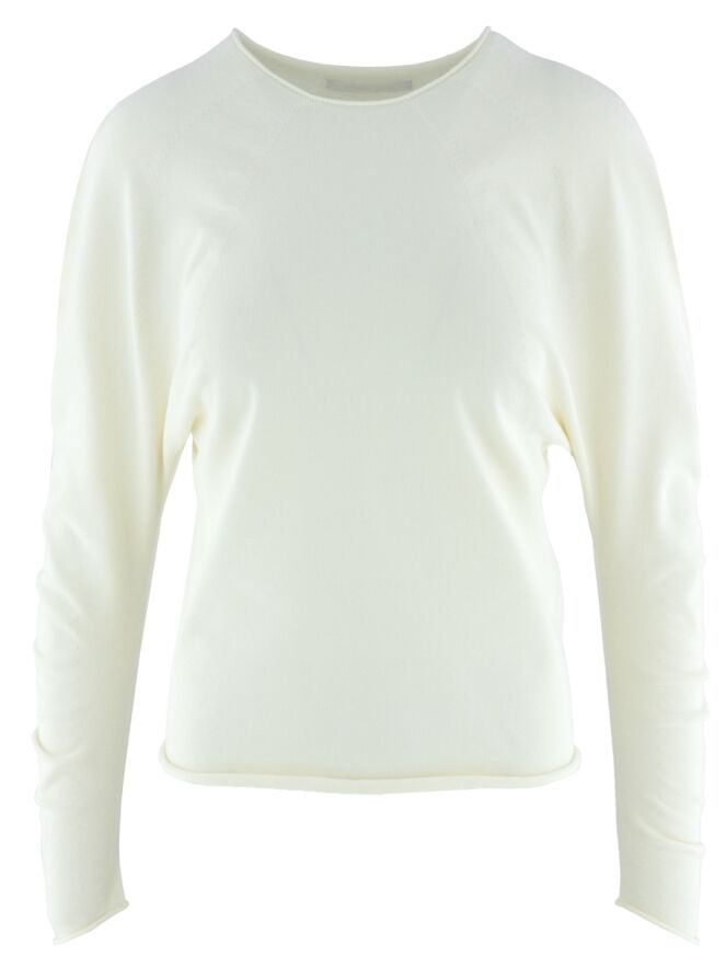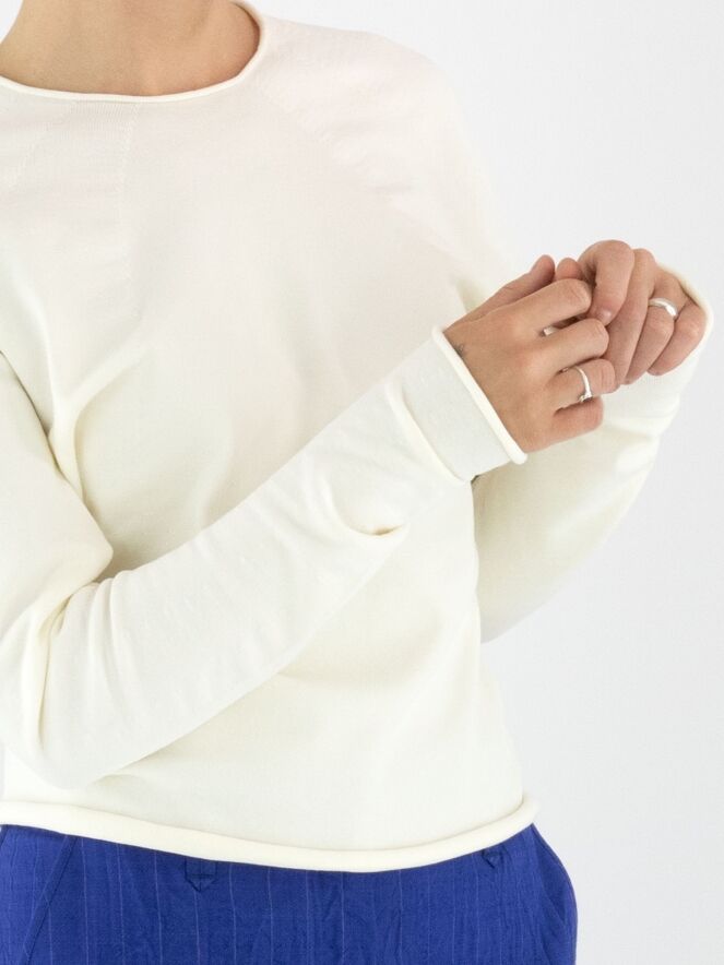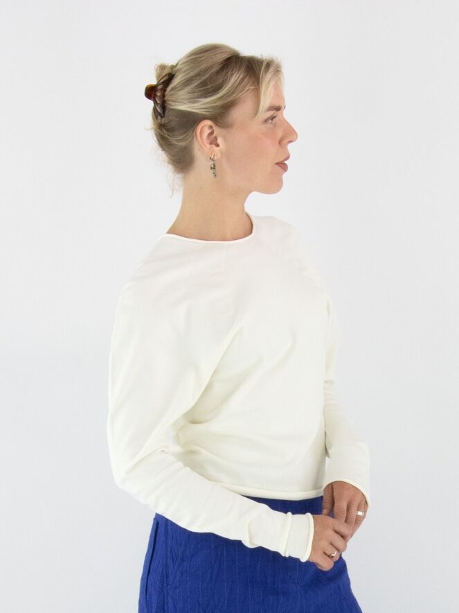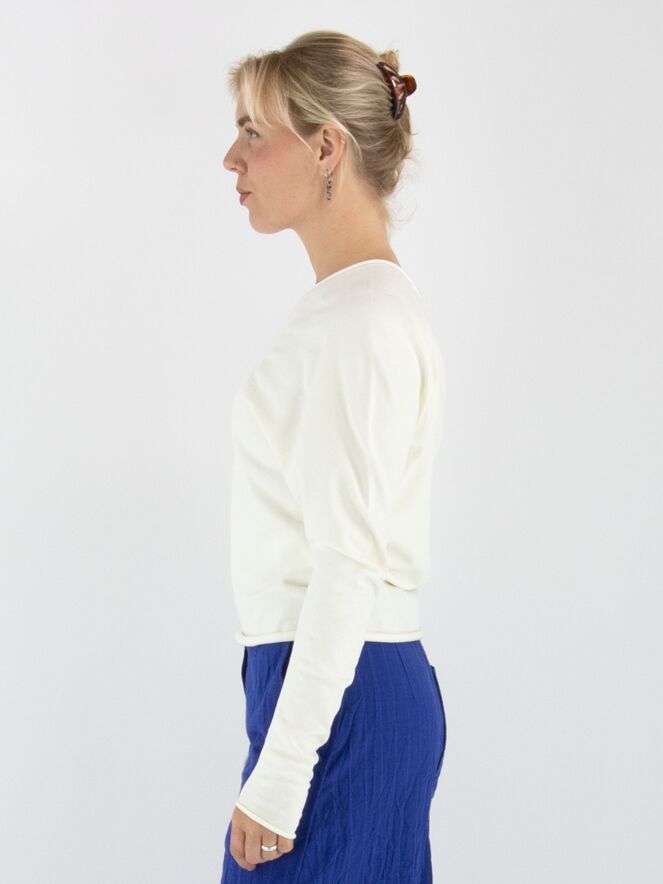 Een pullover van Annette Görtz in een stevige stof in de kleur roomwit. De randen van de ronde hals, de lange mouwen en de onderkant zijn geruld. Vanuit de hals lopen meerdere decoratieve stiknaden die een subtiel smokeffect creëren. Deze pullover mag met de hand worden gewassen.