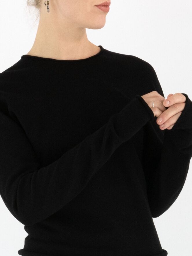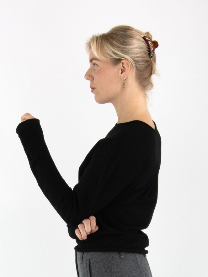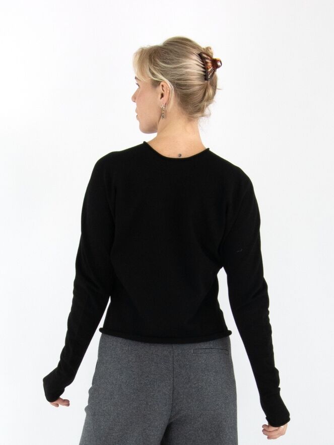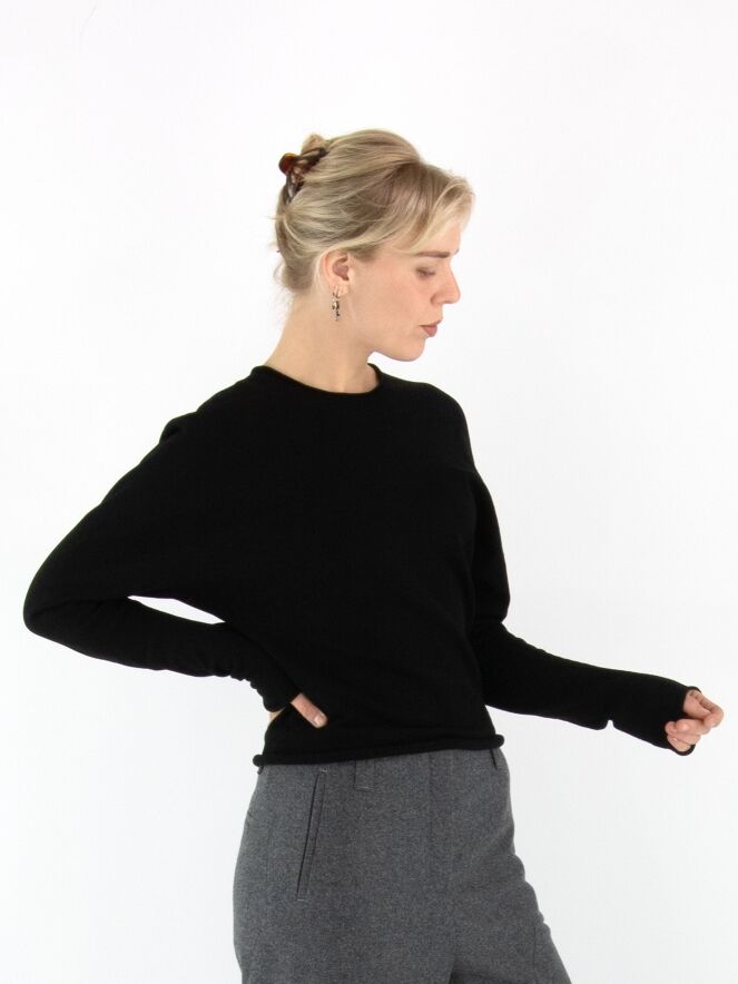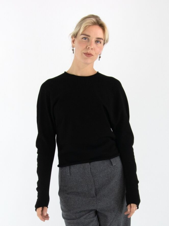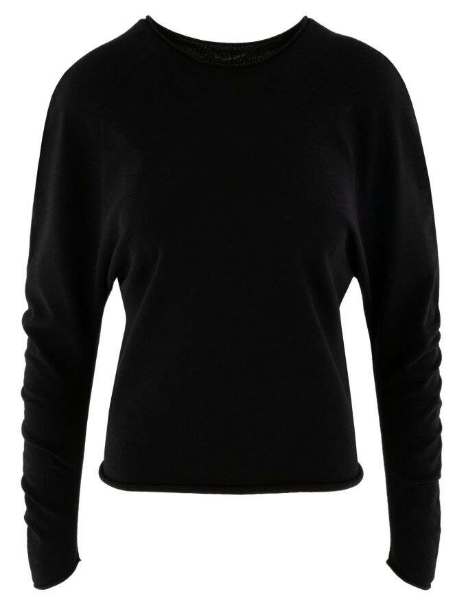 Een pullover van Annette Görtz in een stevige zwarte stof. De randen van de ronde hals, de lange mouwen en de onderkant zijn geruld. Vanuit de hals lopen meerdere decoratieve stiknaden die een subtiel smokeffect creëren. Deze pullover mag met de hand worden gewassen.