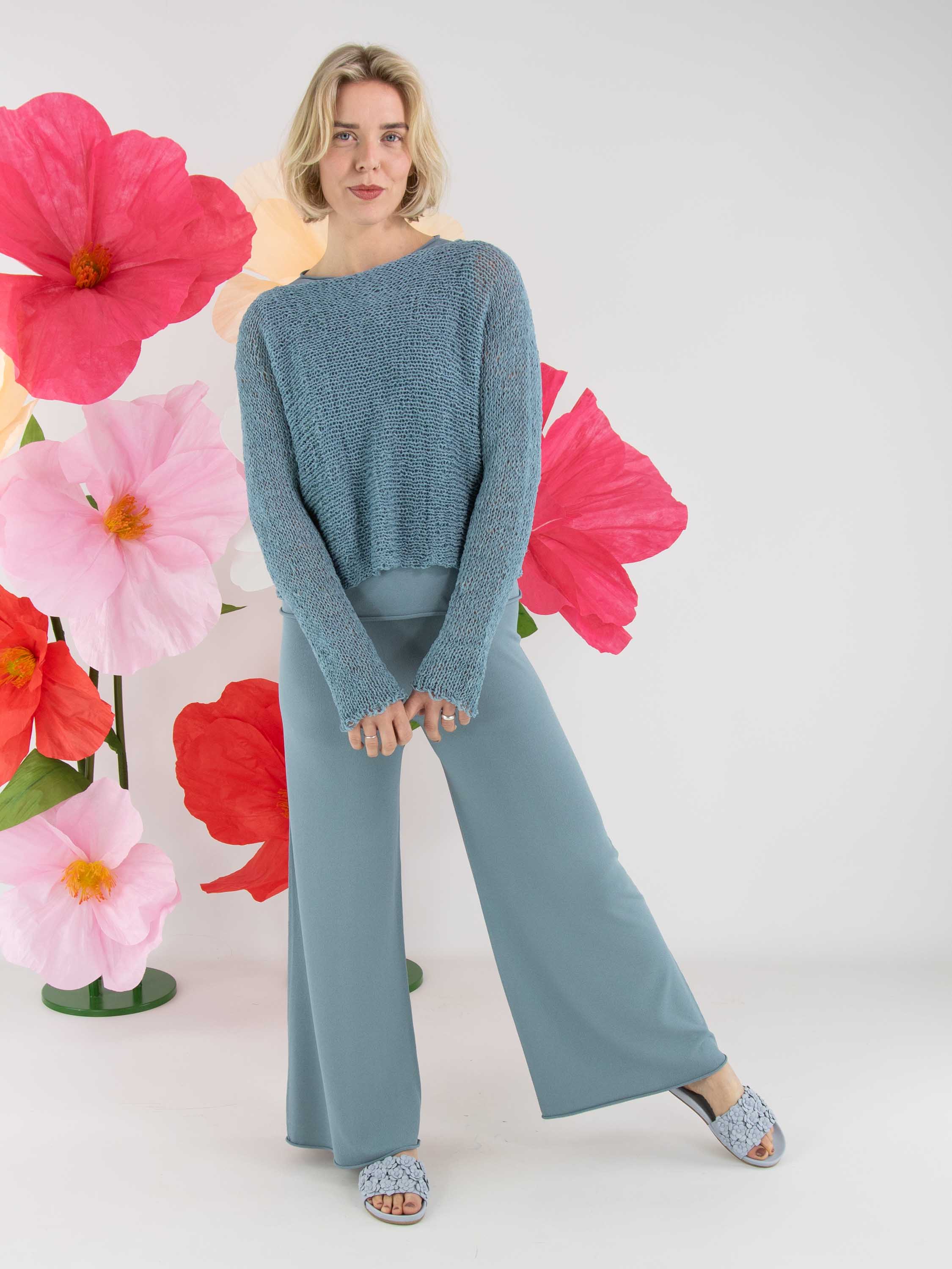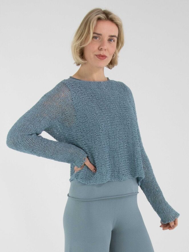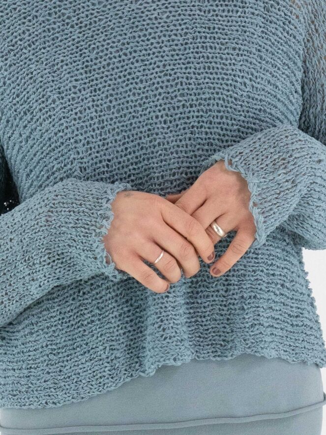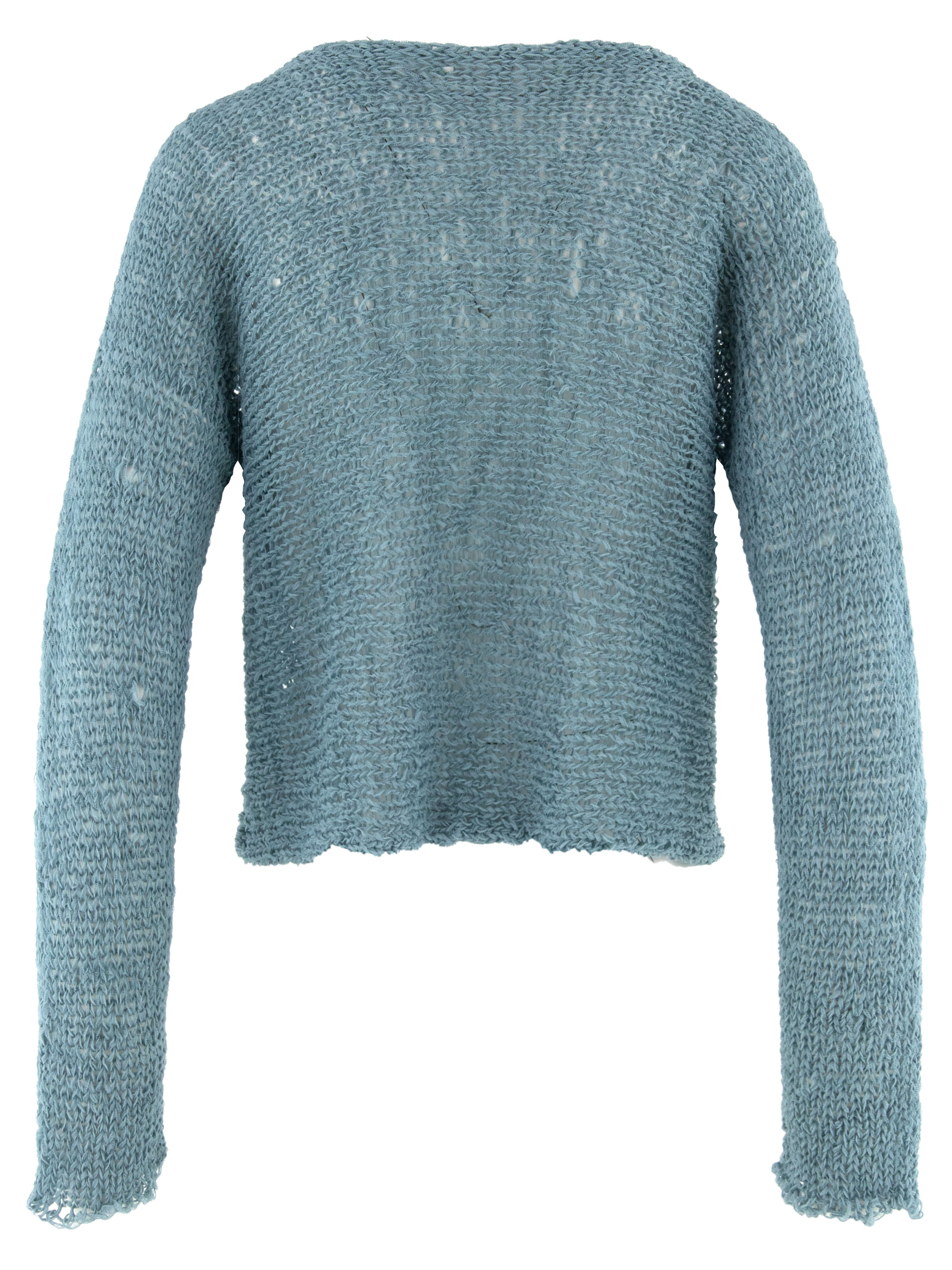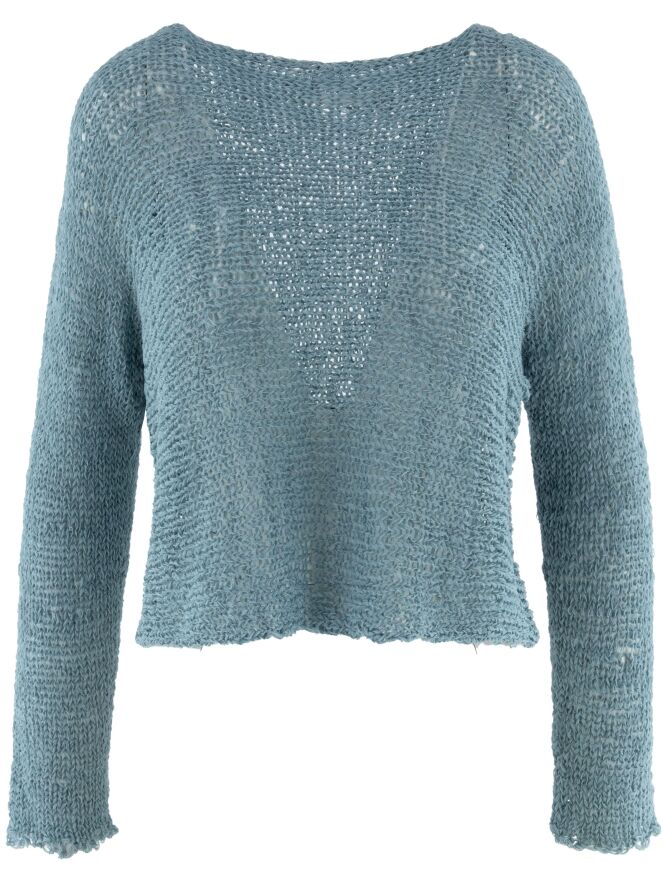 Een pullover van Annette Görtz, opengebreid in lintjesdraad in de kleur blauw. De pullover heeft een ronde hals en lange mouwen en kan met de hand worden gewassen.