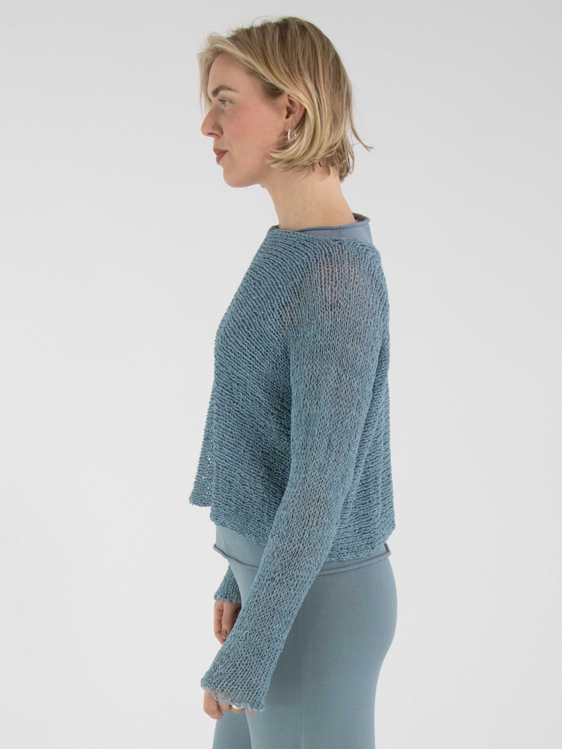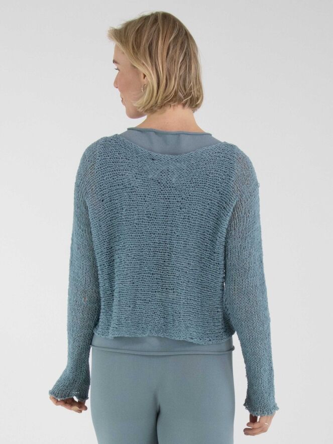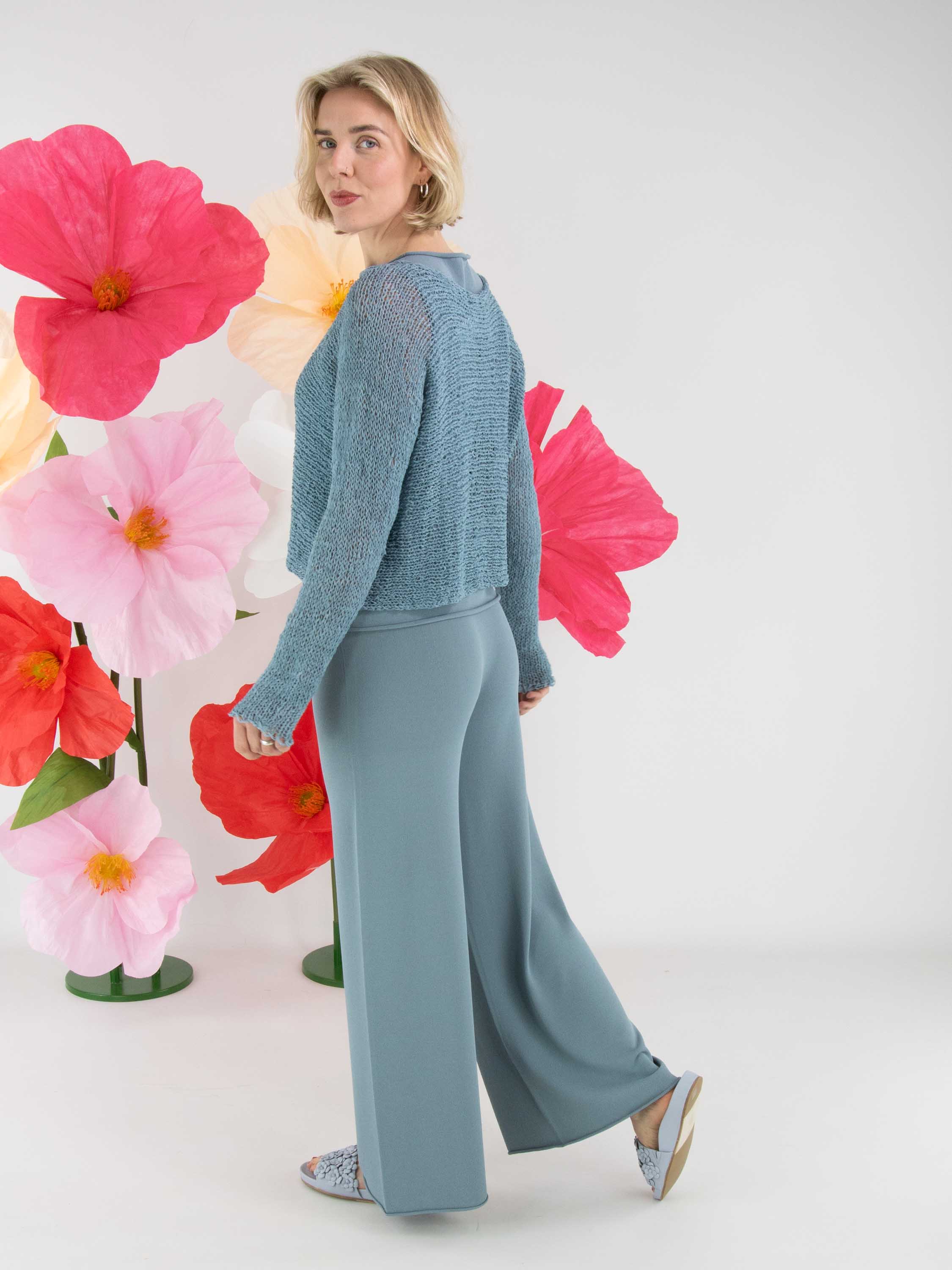 Een pullover van Annette Görtz, opengebreid in lintjesdraad in de kleur blauw. De pullover heeft een ronde hals en lange mouwen en kan met de hand worden gewassen.