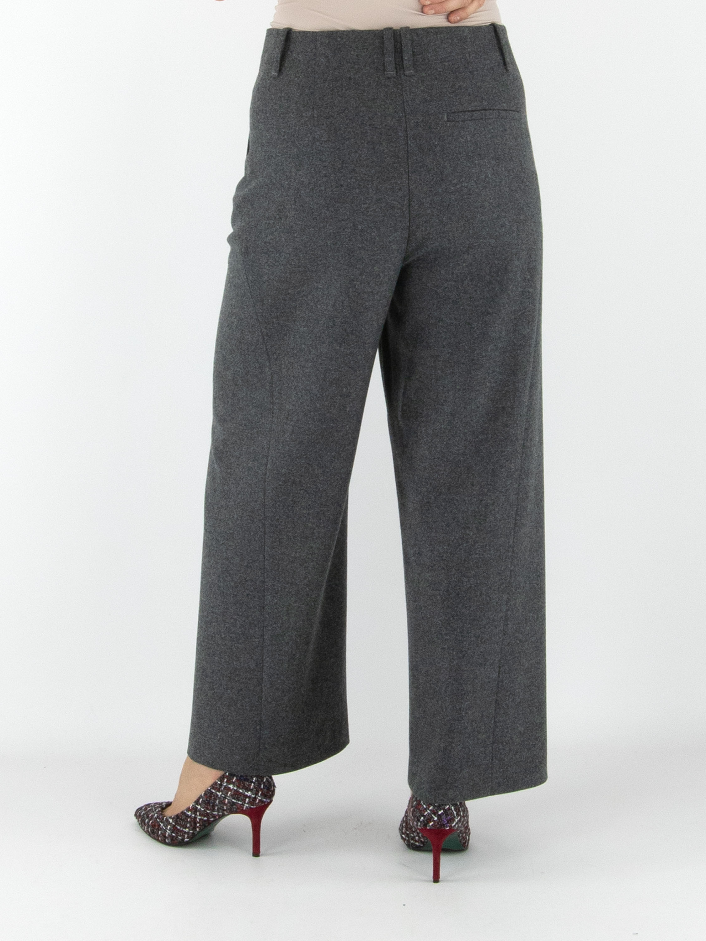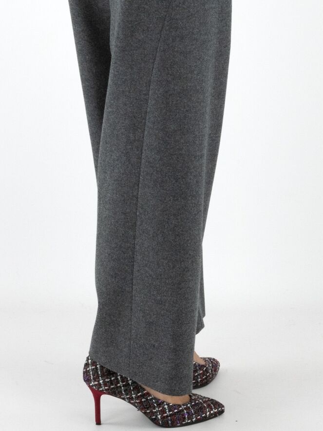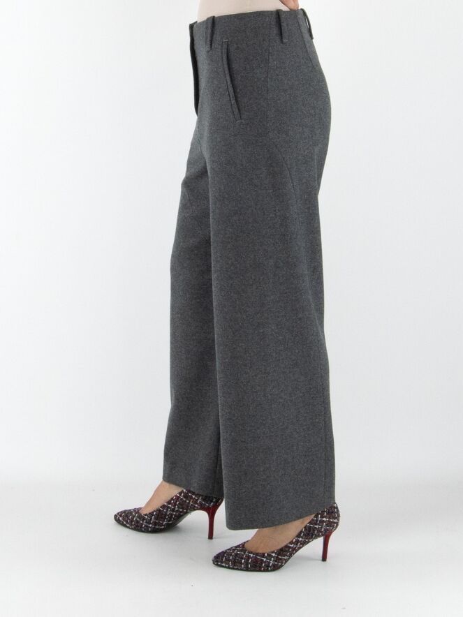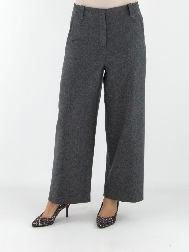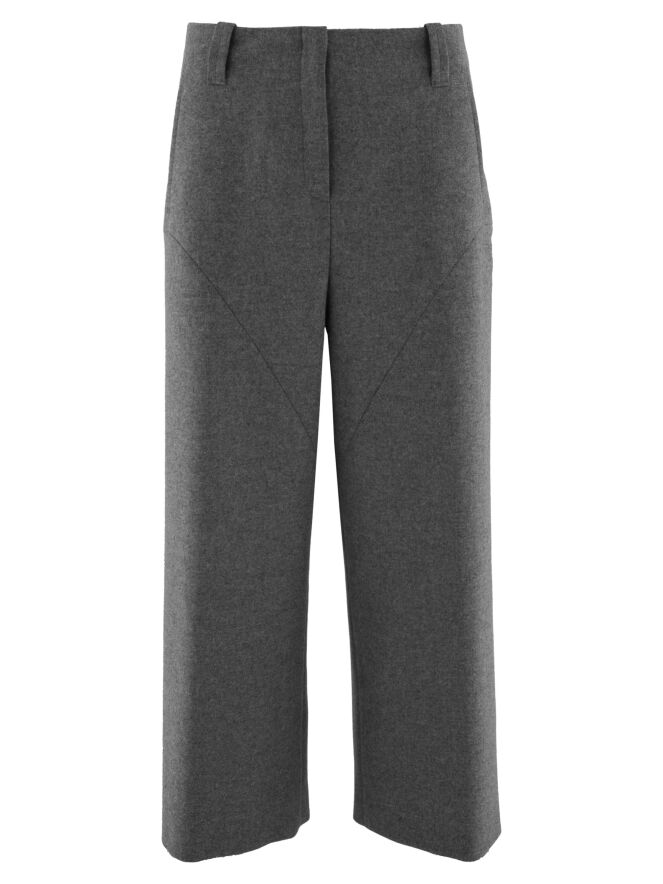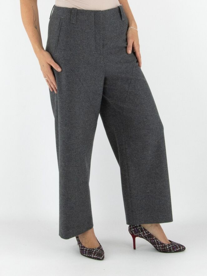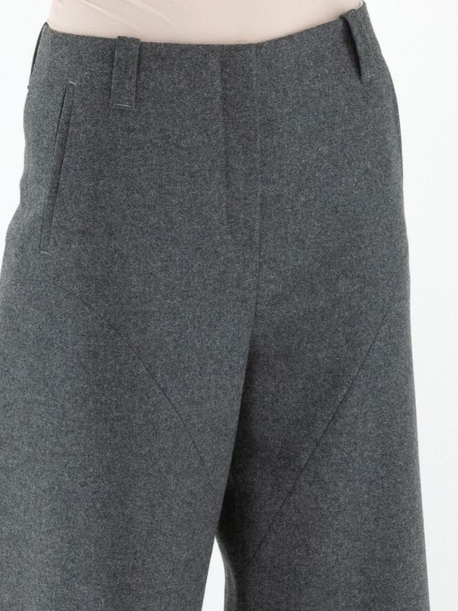 Een broek van Annette Görtz in de kleur grijs. De broek heeft steekzakken en vanaf de onderkant van de zakken loopt een stiknaad in een paraboollijn richting de knieën. De pijpen zijn recht gesneden. Deze broek mag met de hand worden gewassen.