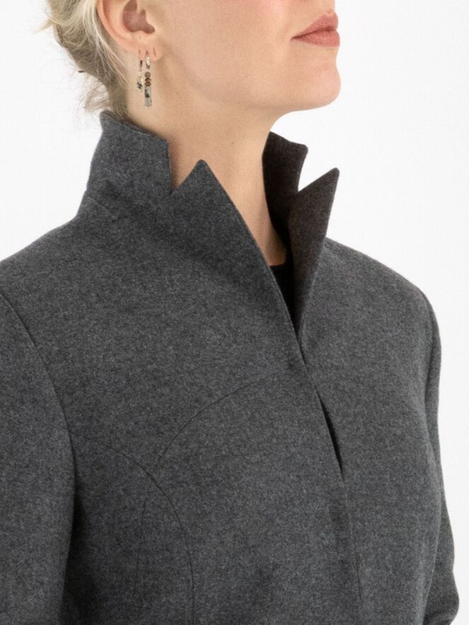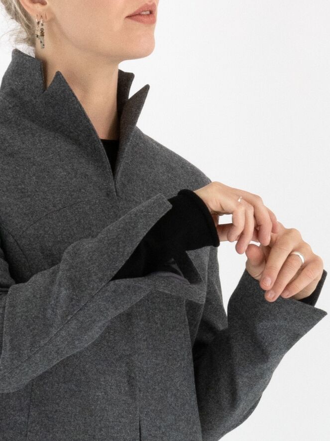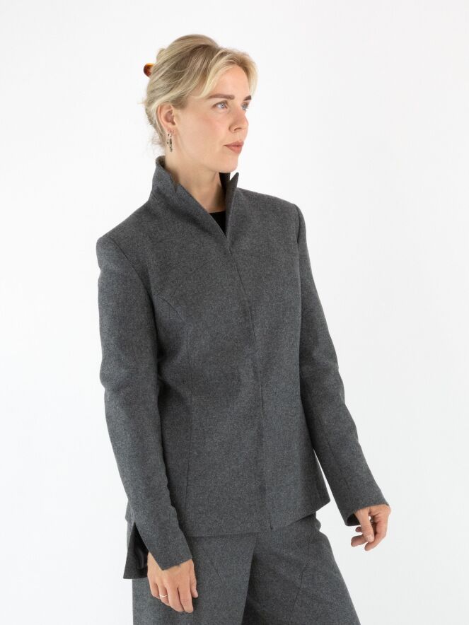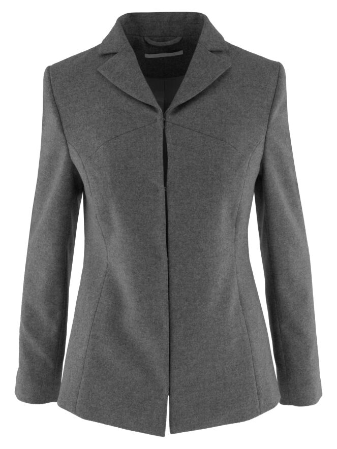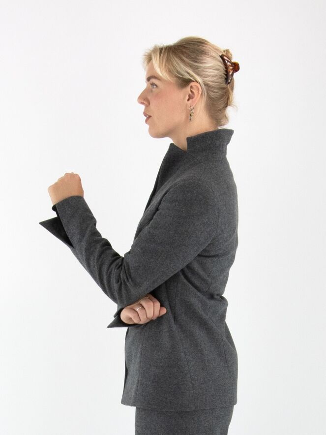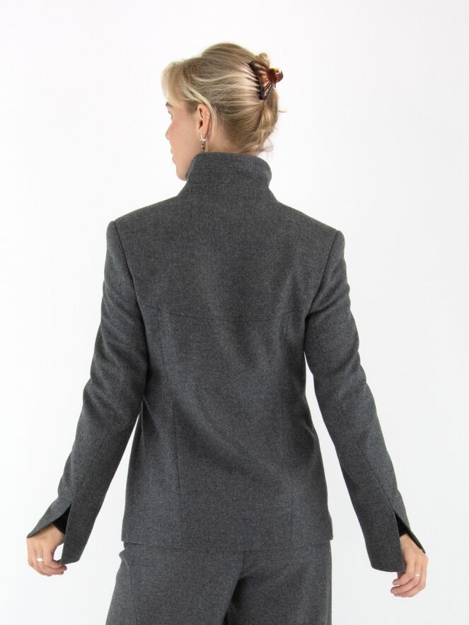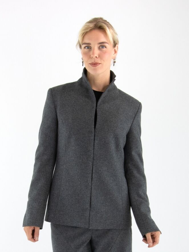 Een blazer van Annette Görtz in de kleur grijs. De blazer sluit met vijf fijne haak- en oogsluitingen. Aan het uiteinde van de lange mouwen bevindt zich een split. De blazer is gevoerd en mag niet worden gewassen.