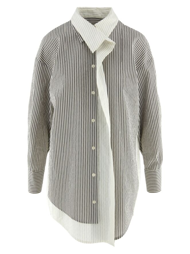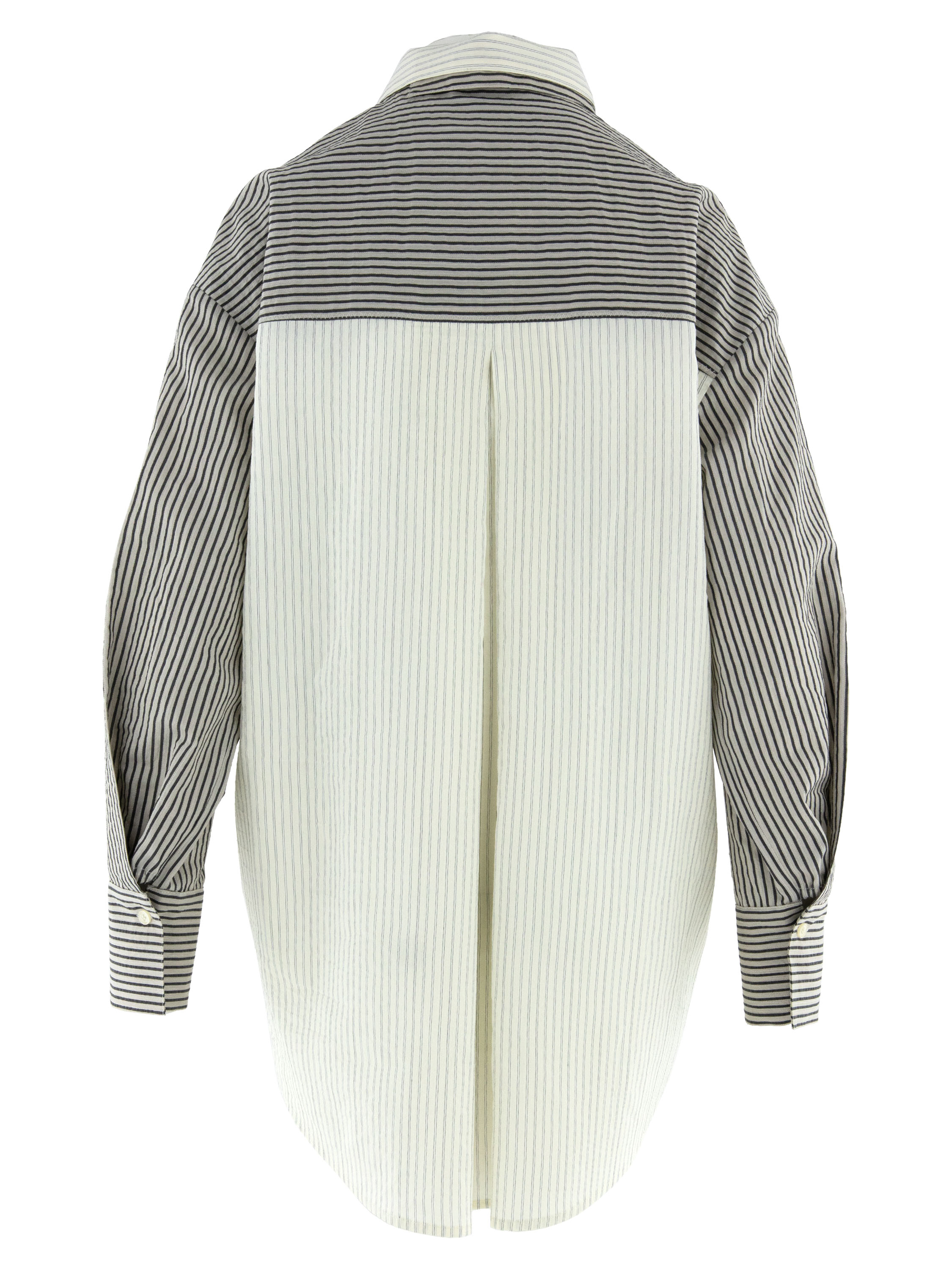 Een blouse van Annette Görtz met een streeppatroon in de kleuren antraciet en grijs. Aan de achterzijde is de brede omslag langs de knoopsluiting, die doorloopt naar de kraag, uitgevoerd in een stof met een streeppatroon in roomwit en grijs. Deze blouse kan met de hand worden gewassen.