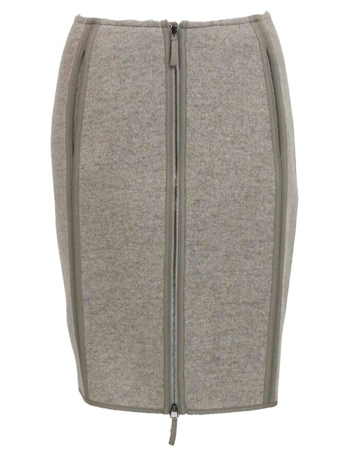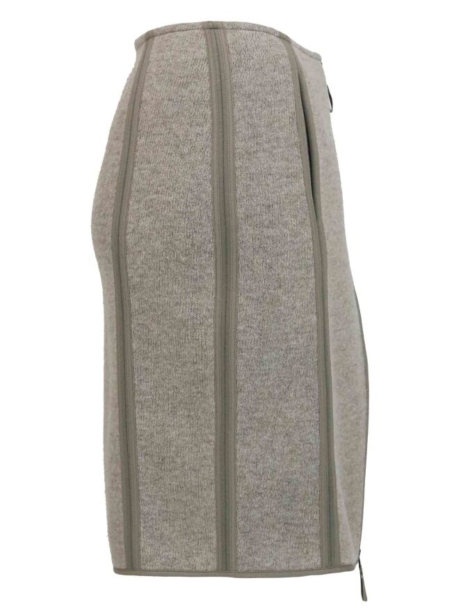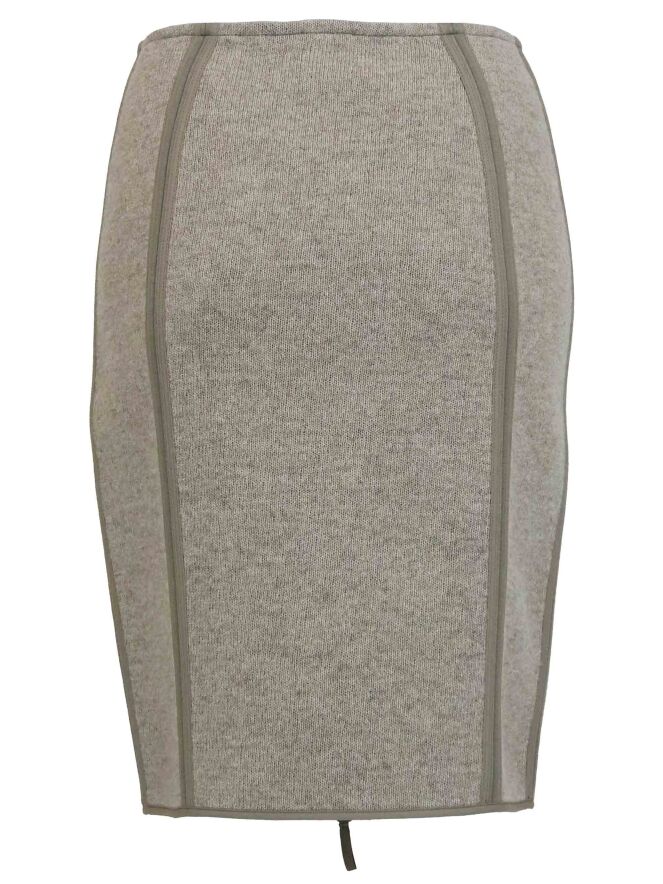 Een rok van Annette Görtz in de kleur beige taupe. De rok heeft een aantal verticale biezen. De rok is ongevoerd en valt net boven de knie. Deze rok mag op de hand worden gewassen.