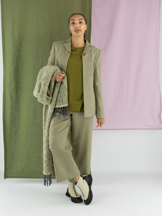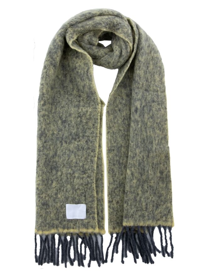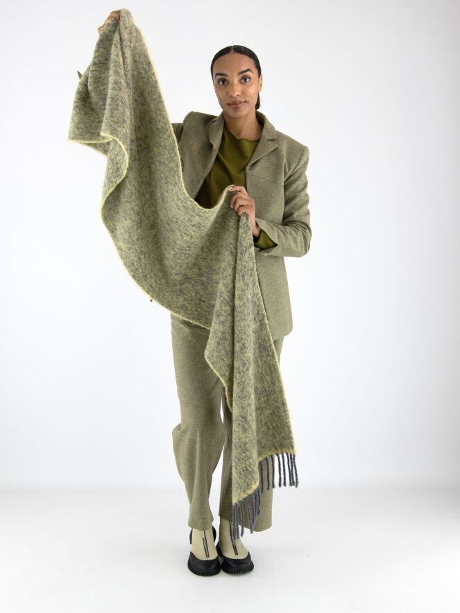 Een luxe shawl van Annette Görtz in een gemêleerde limegroene kleur, gemengd met grijs. Aan de uiteinden van de shawl zijn lange grijskleurige franjes. Deze shawl mag met de hand worden gewassen.