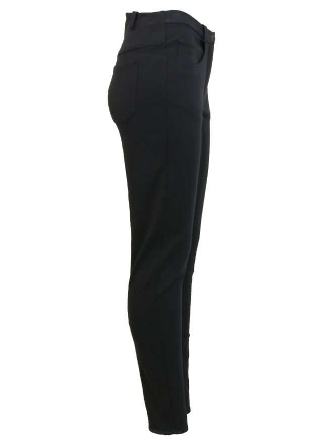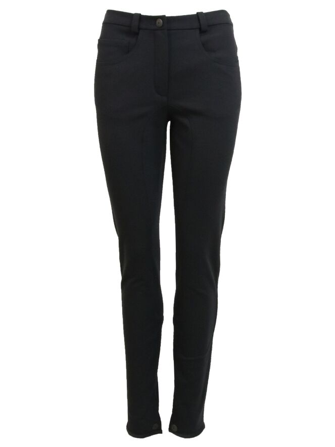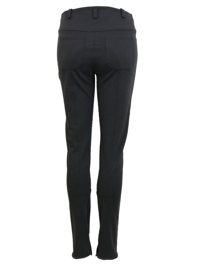Een broek van Annette Görtz in de kleur donkergrijs. De broek is in een 5 pocket model. Aan de onderkant van de pijpen is een split met een mat satijnen bies en een decoratieve knoop. deze broek mag op 30 graden worden gewassen.