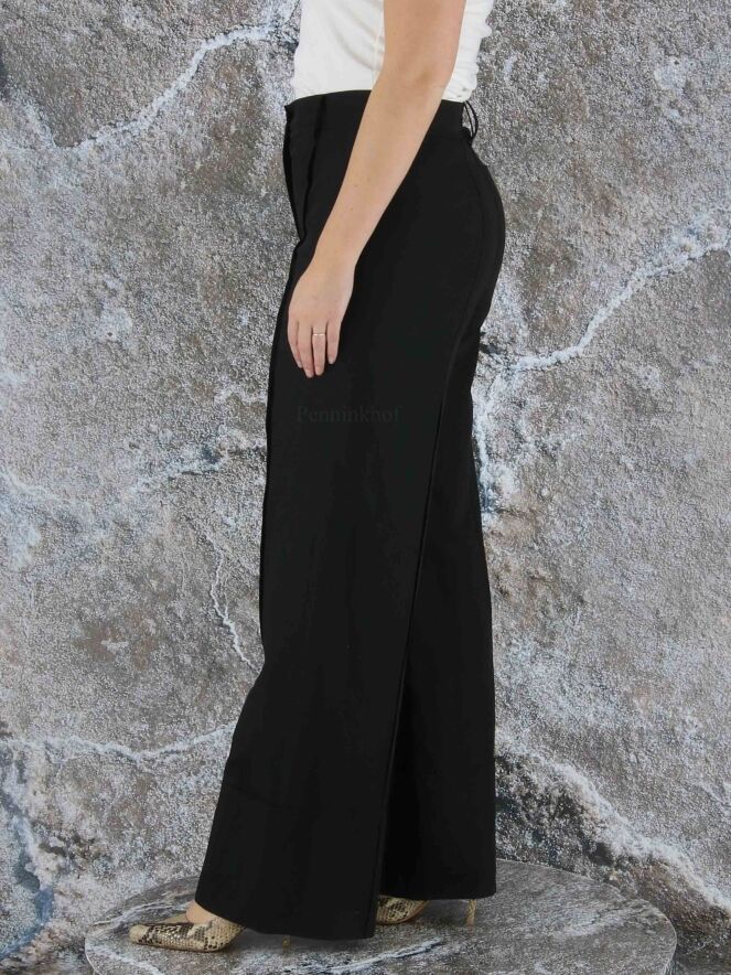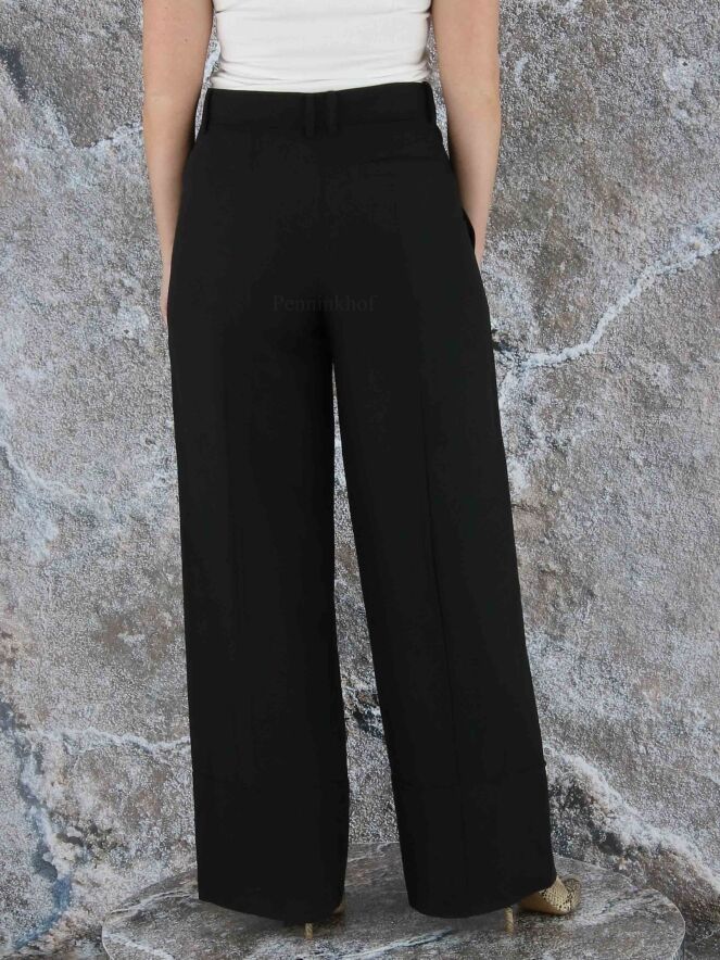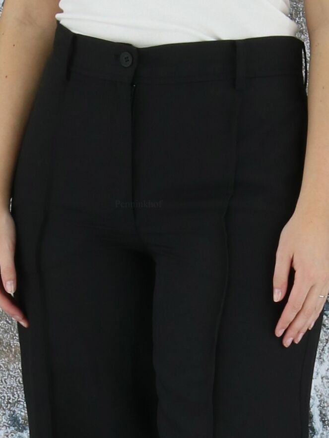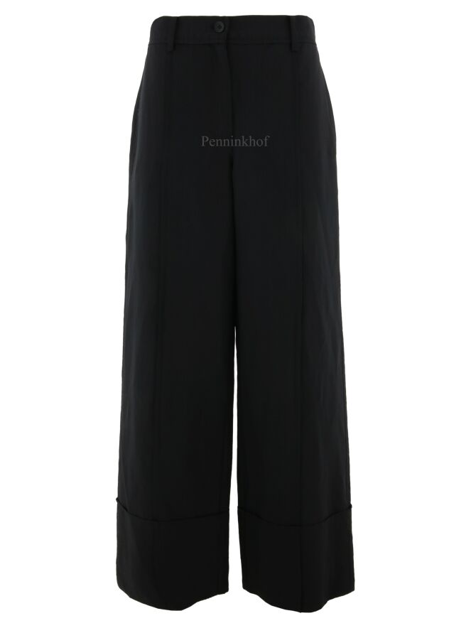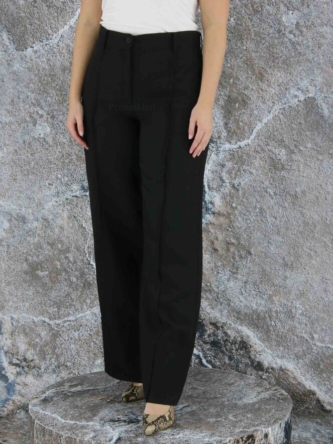 Een wijde broek van Annette Görtz in de kleur zwart. Aan de onderkant van de pijpen is een horizontale stiknaad wat een fake omslag creëert. Over het midden van de pijpen is aan de voor - en achterkant een stiknaad. Deze broek mag op 30 graden worden gewassen.