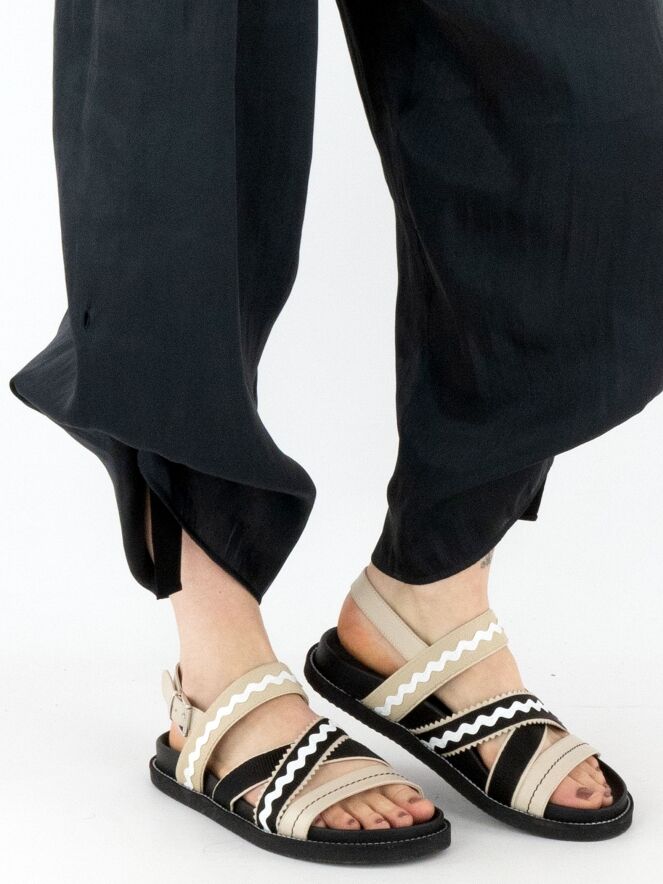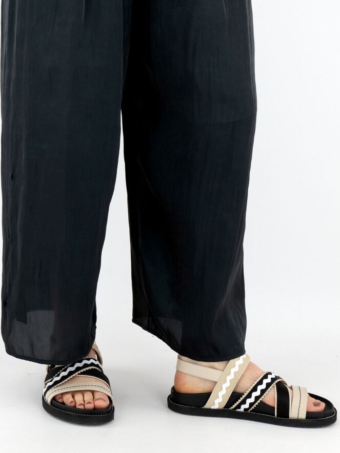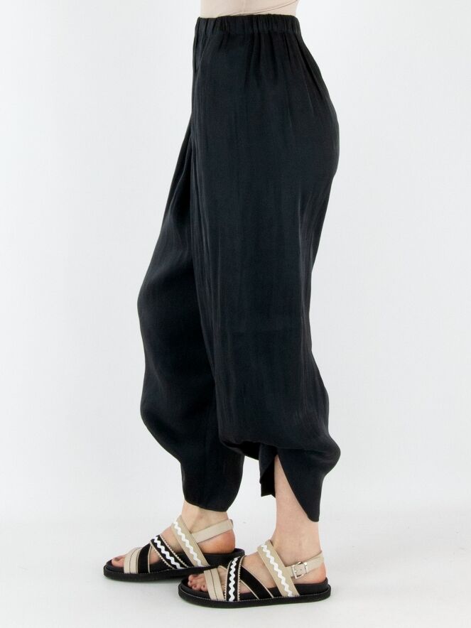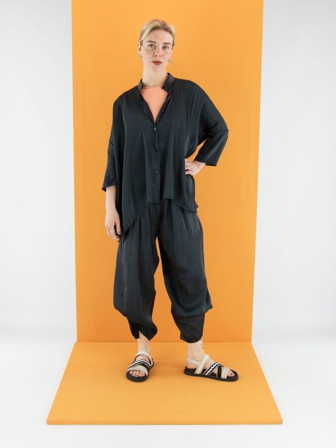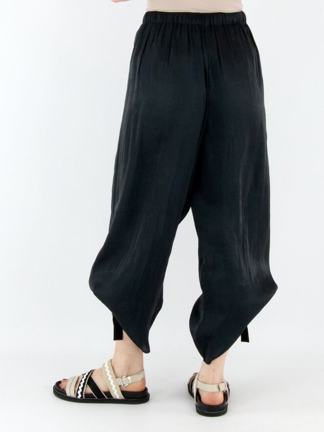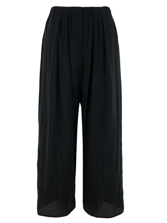Een broek van Annette Görtz in een mat satijnen stof met een gemêleerde print in de kleur antraciet. De taille heeft een fijn geplooide elastische band. Aan de binnenkant van de broek zit een lint met knoopjes, waarmee plooieffecten kunnen worden gecreëerd voor verschillende lengtes. Deze broek mag op 30 graden worden gewassen.