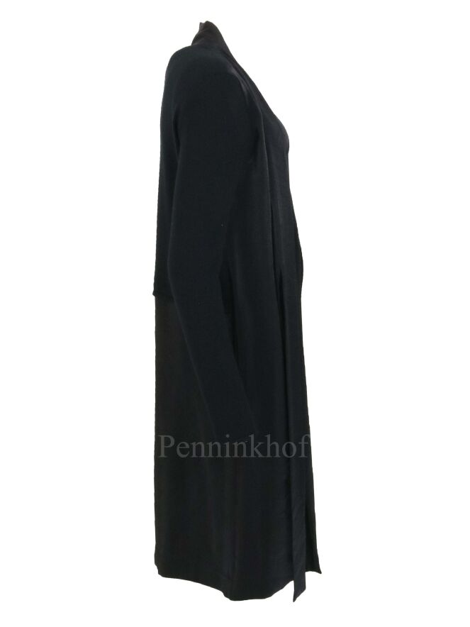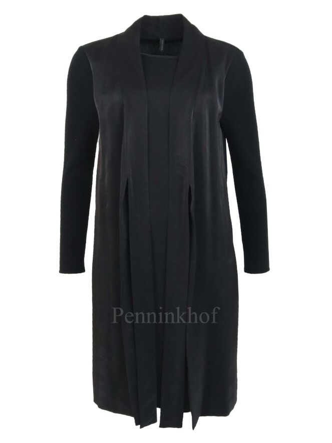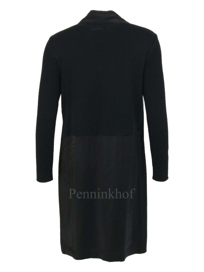 Een jurk van Annette Görtz met een mat satijnen stof aan de voorzijde in de kleur zwart. De achterzijde tot de taille en de mouwen zijn in een zwarte tricot stof. Aan de voorzijde heeft de jurk een vest stijl in een mat satijnen stof met een lint ceintuur sluiting. Deze jurk mag op de hand worden gewassen.