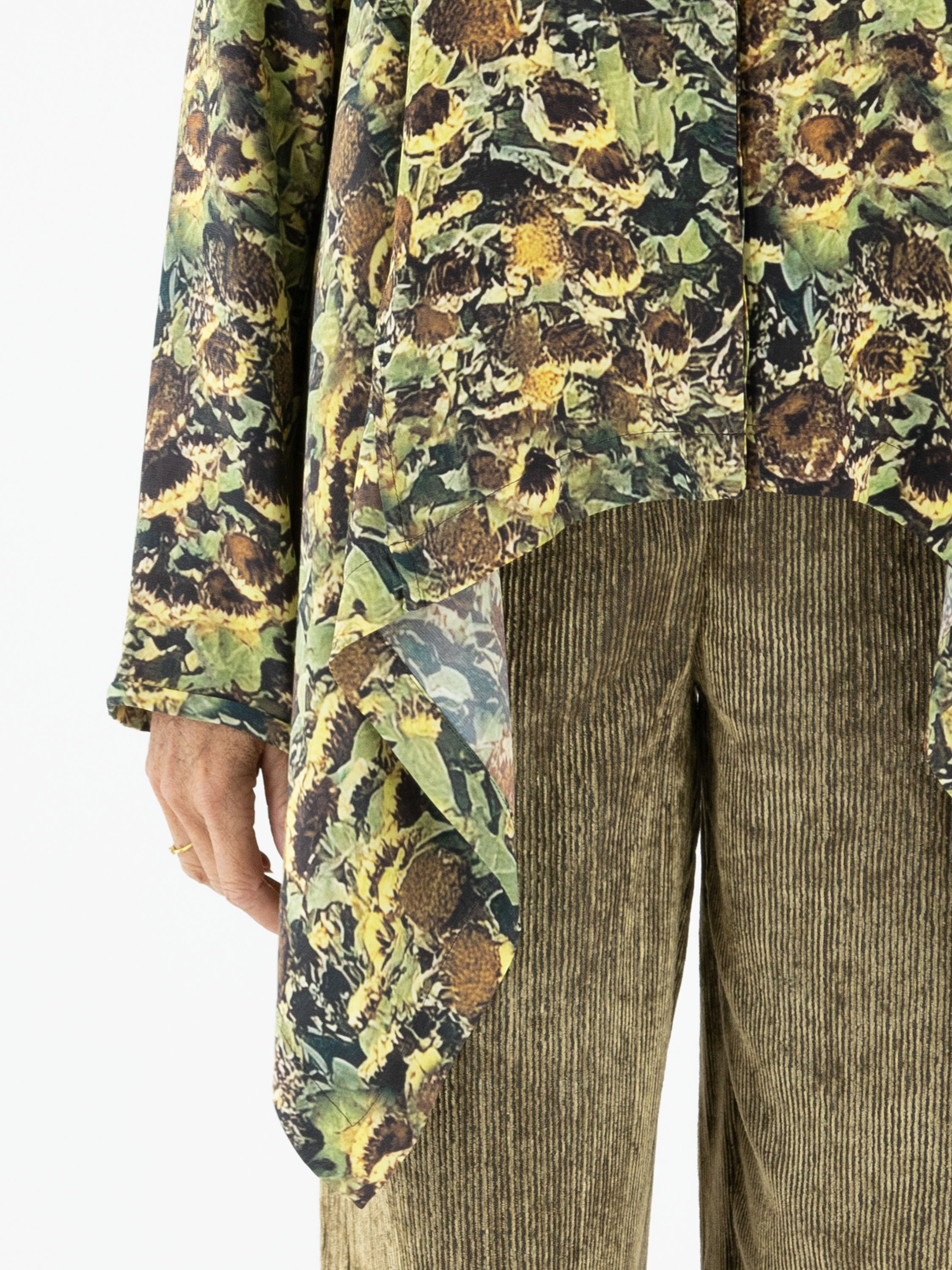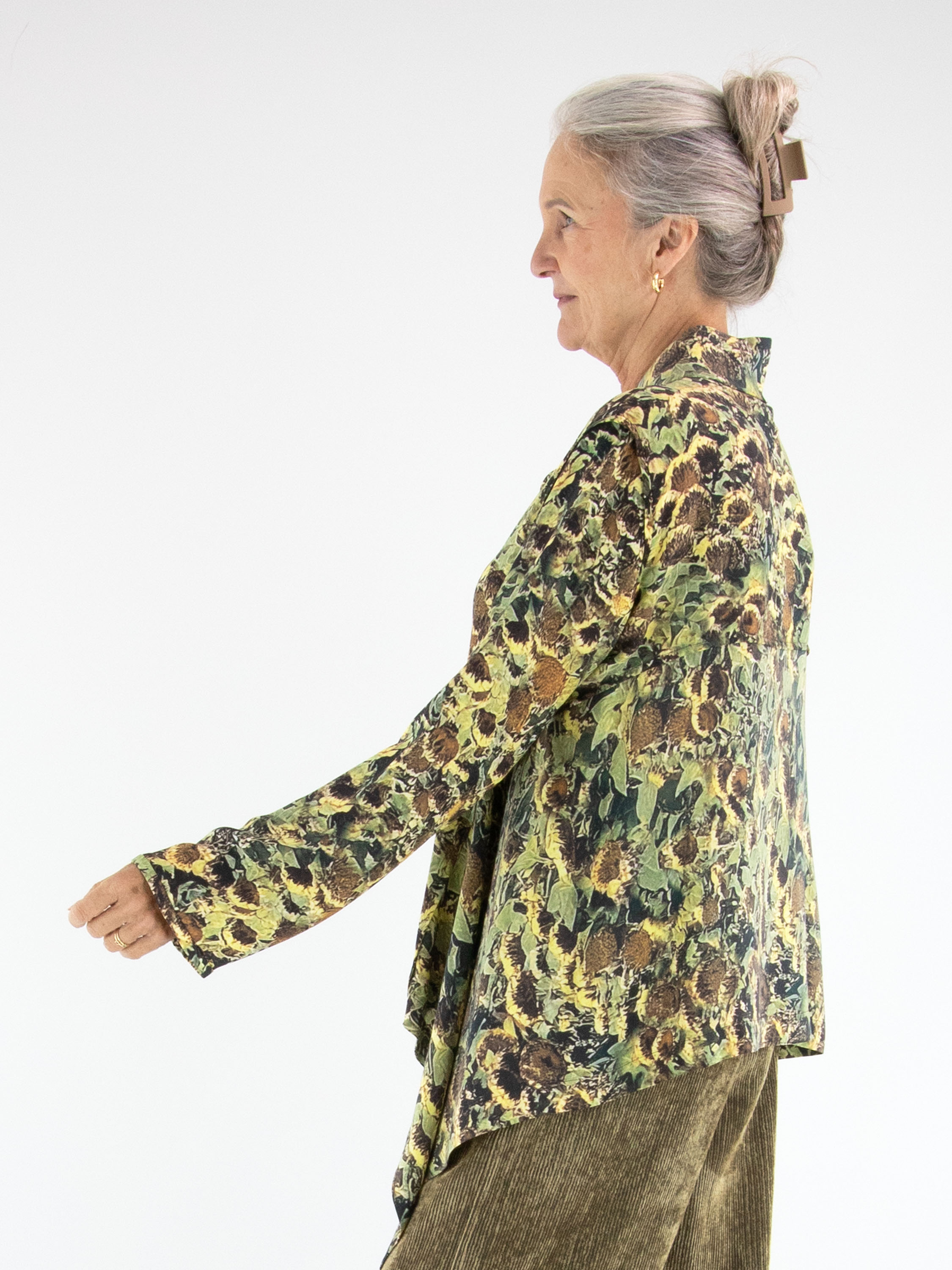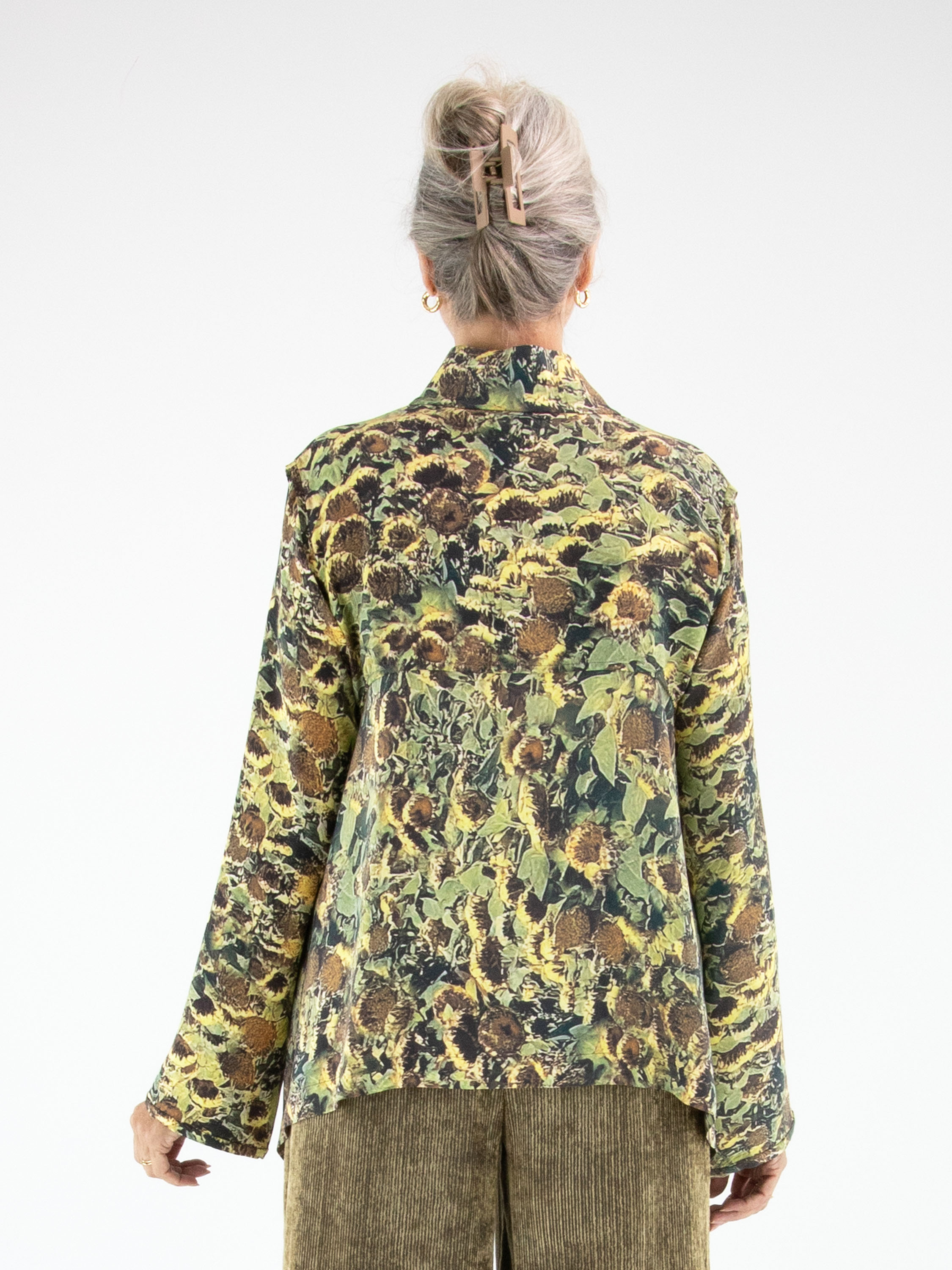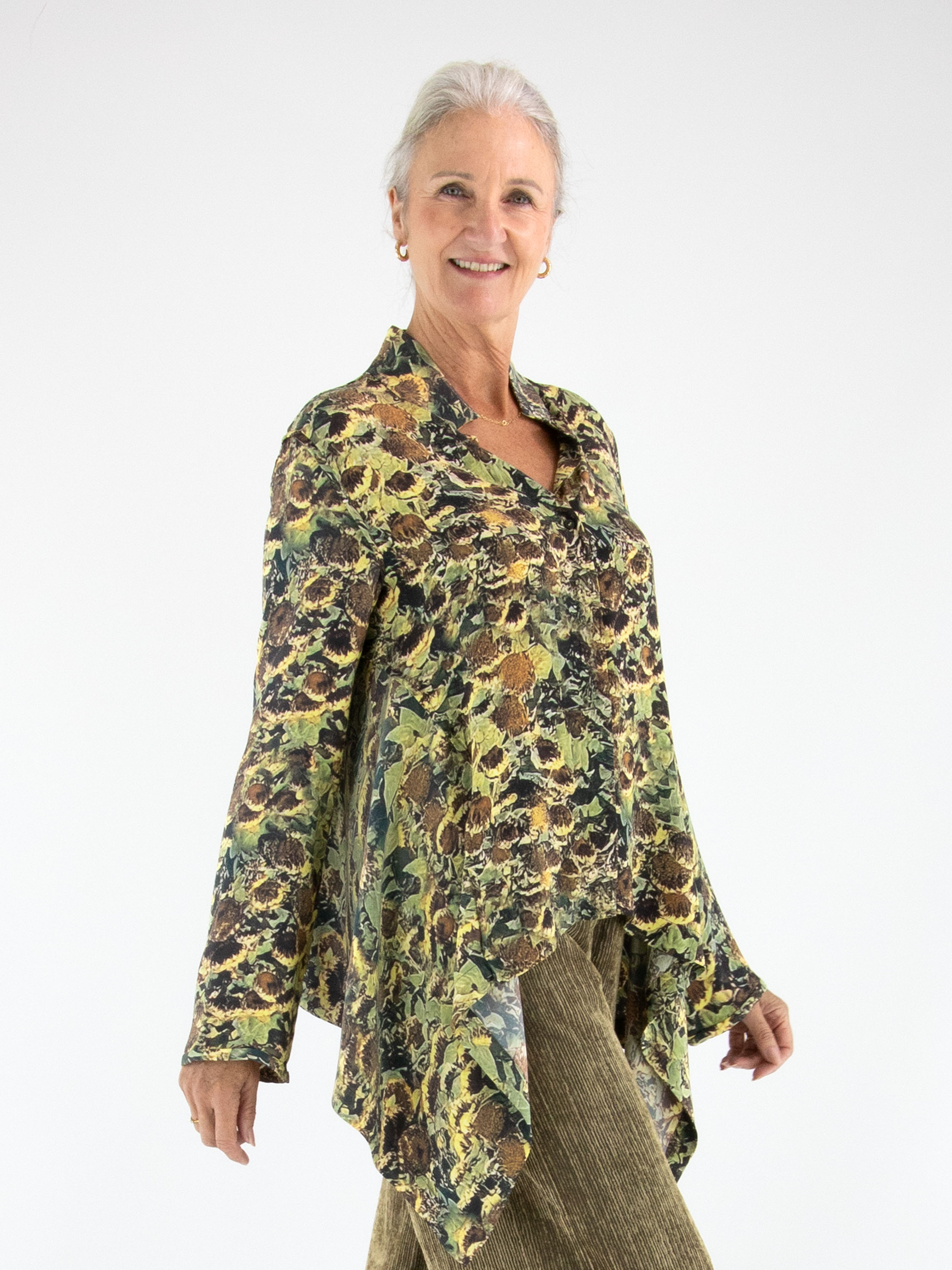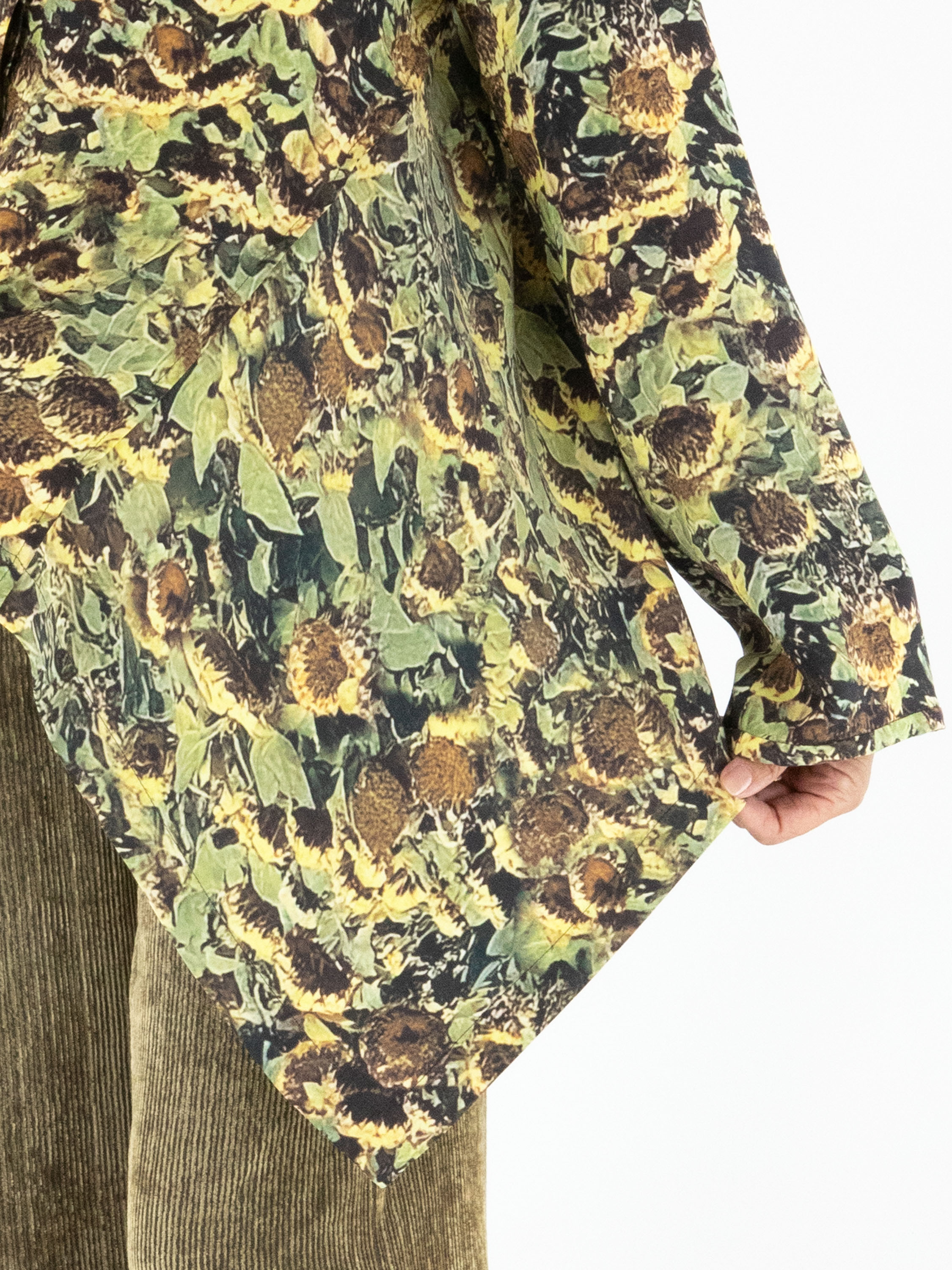 Blouse van Annette Görtz met een artistieke print van uitgebloeide zonnebloemen in tinten geel, olijfgroen, bruin en zwart. De blouse heeft een verborgen knoopsluiting en extra stof aan de zijkanten, waardoor een speels effect met subtiele punten ontstaat. Deze exclusieve designerblouse kan met de hand worden gewassen.
