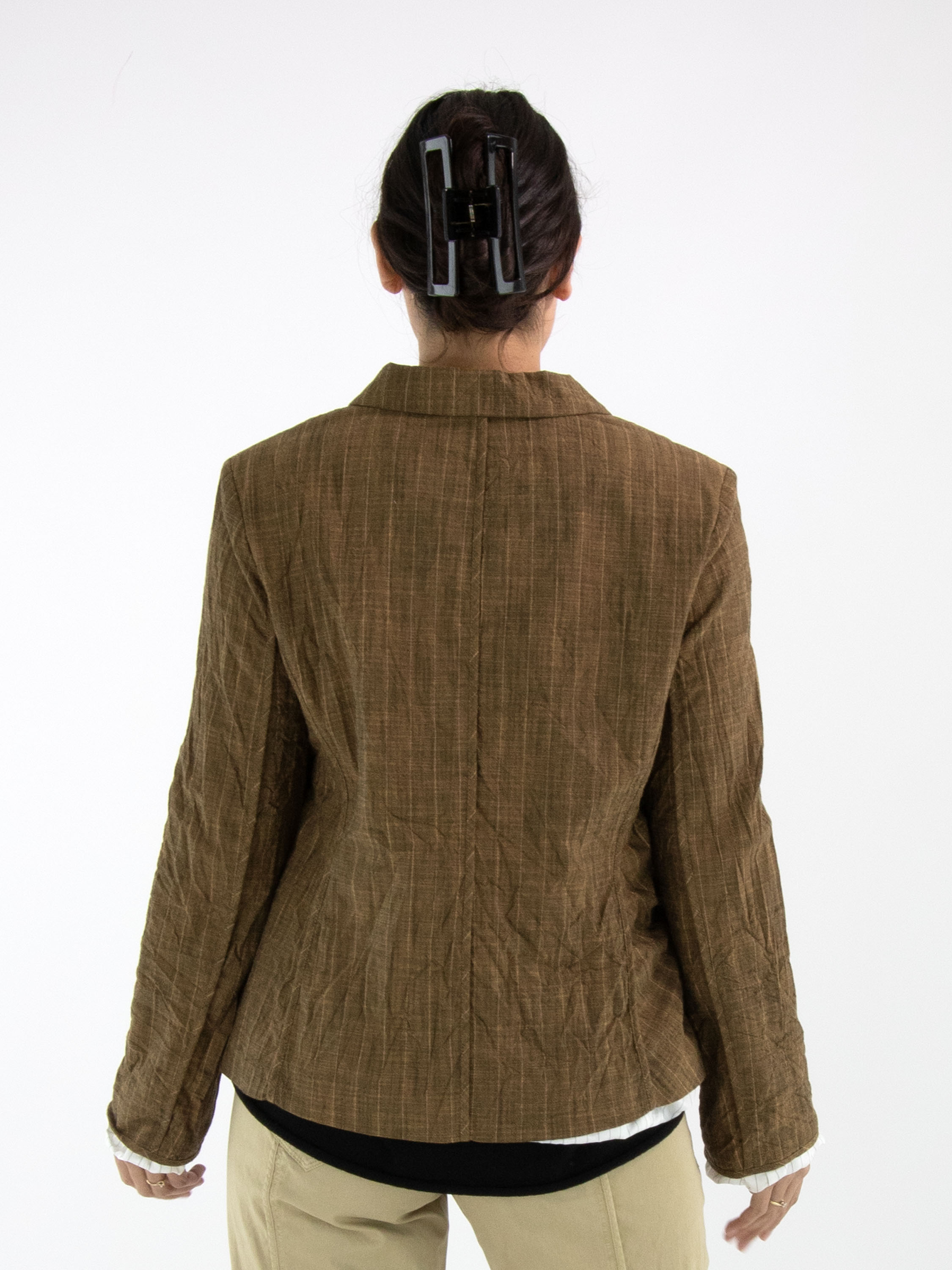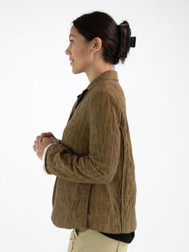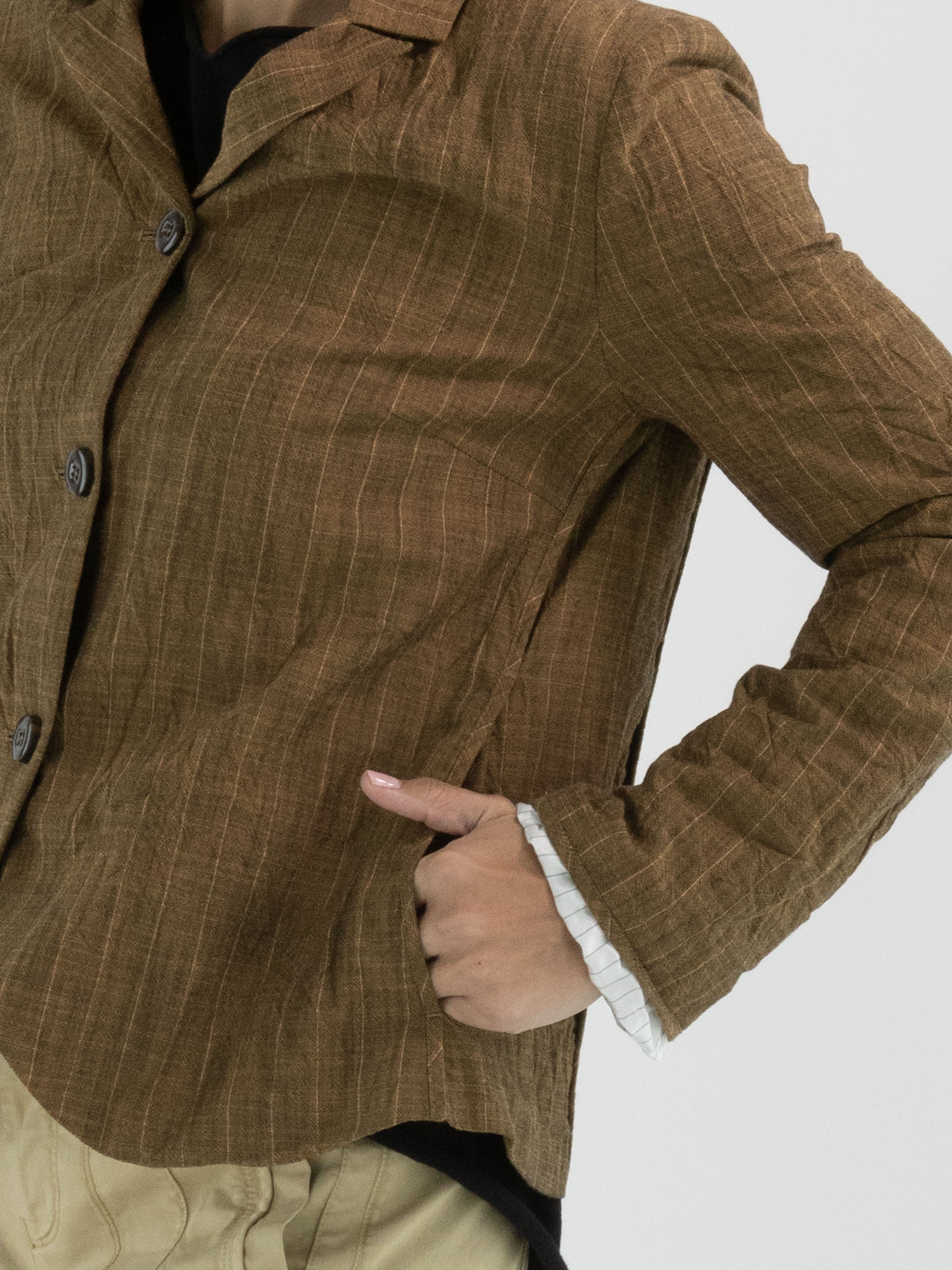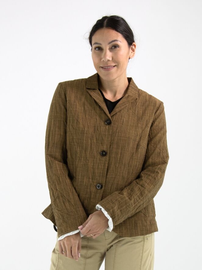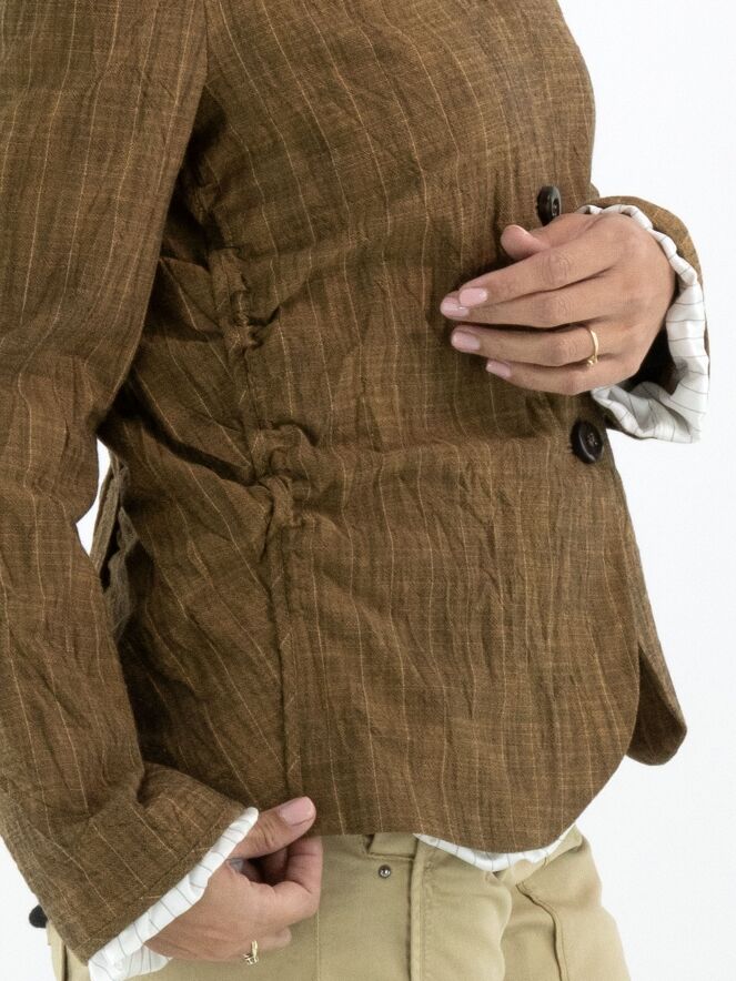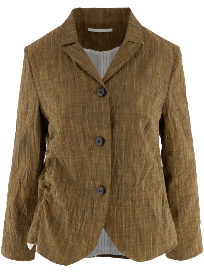 Een blazer van Annette Görtz in een krijtstreeppatroon in mosterd en camel. De gekreukte stof is aan de rechterzijkant fijn geplooid langs de stiknaad. De witte krijtstreepvoering komt subtiel tevoorschijn aan de onderkant van de blazer en bij de uiteinden van de lange mouwen. De blazer heeft een sluiting met drie knopen en een rond gesneden onderkant. Deze blazer mag niet worden gewassen.