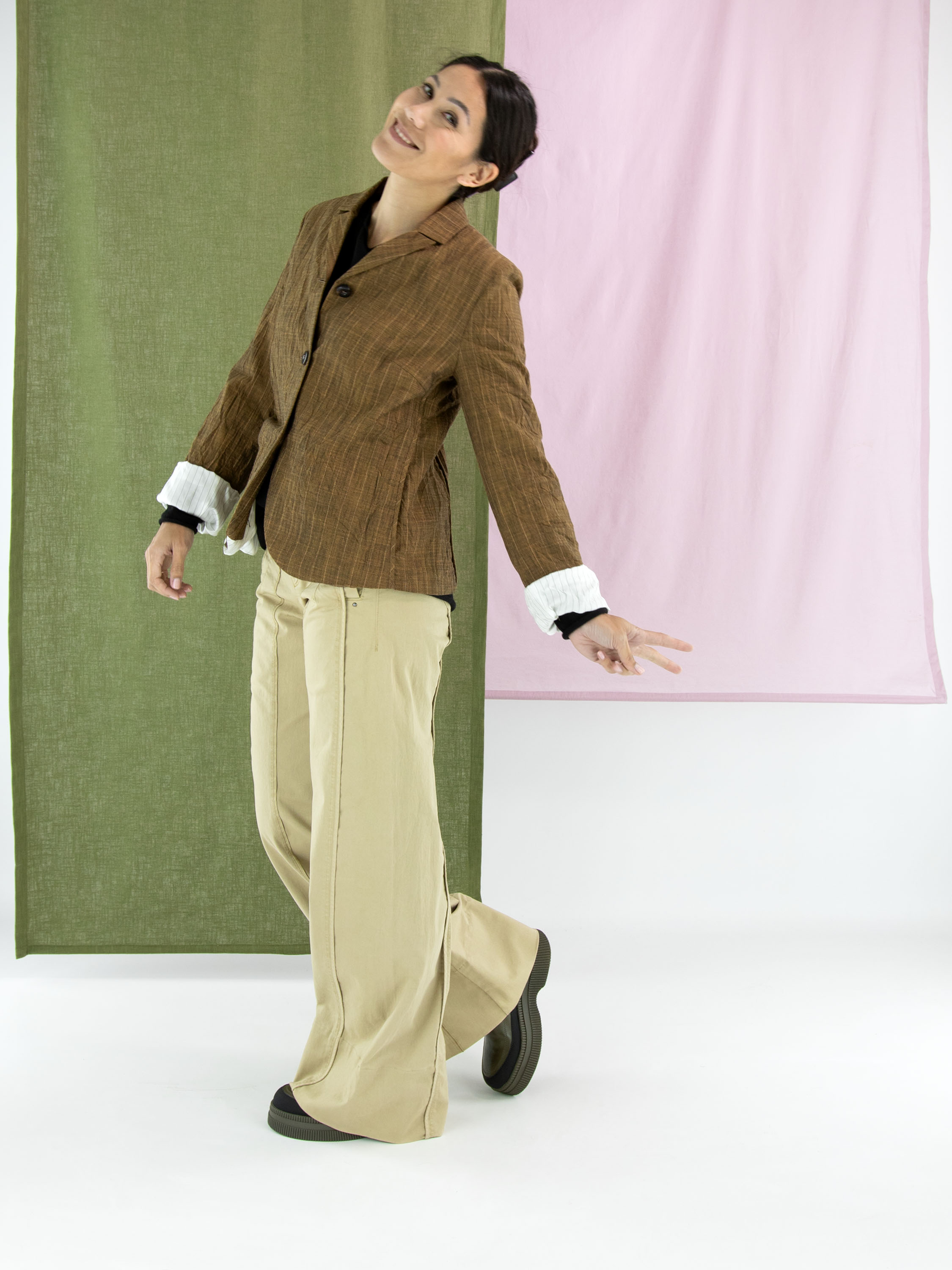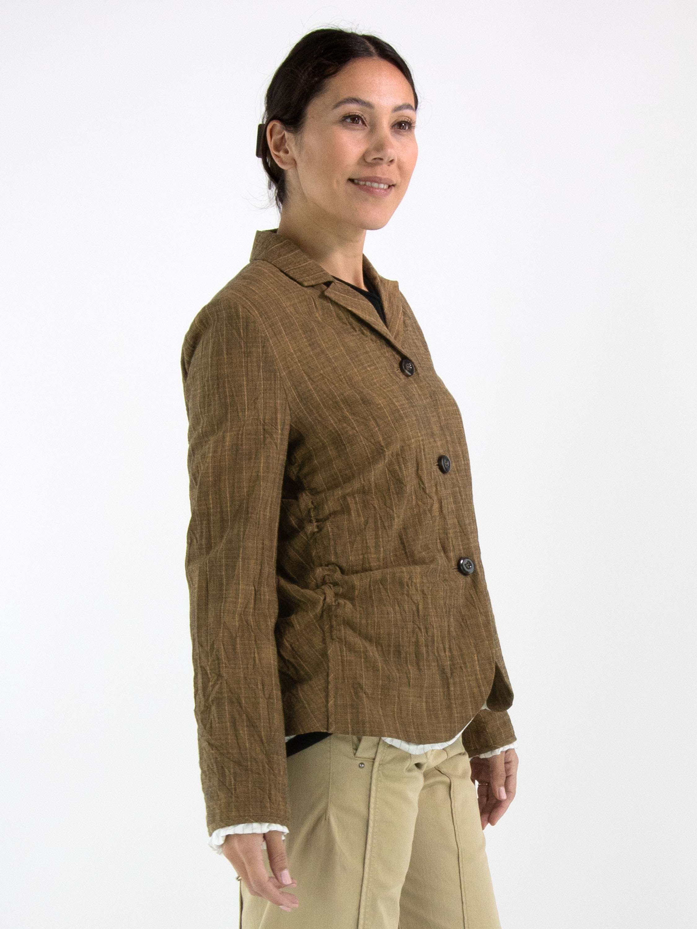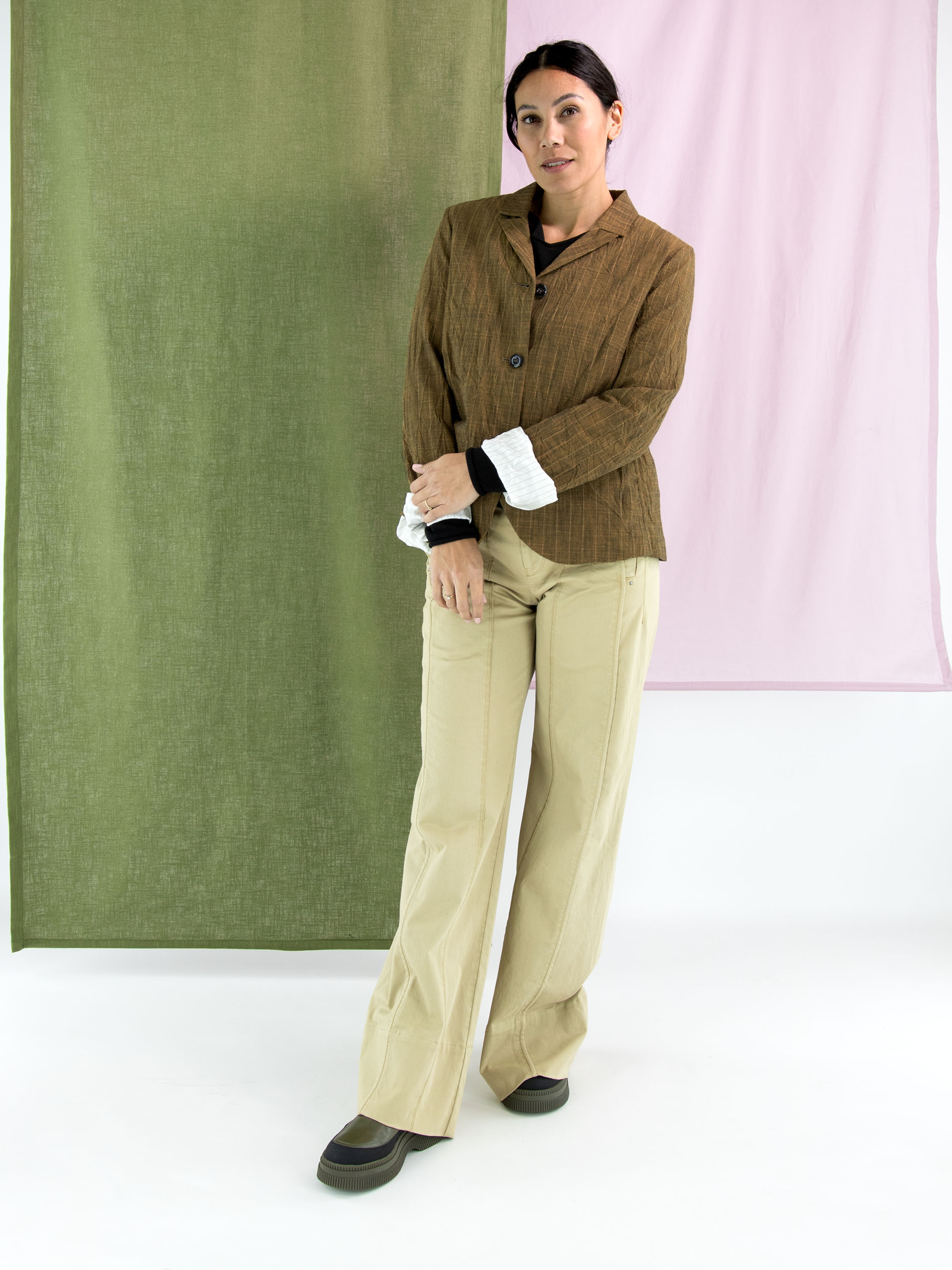 Een blazer van Annette Görtz in een krijtstreeppatroon in mosterd en camel. De gekreukte stof is aan de rechterzijkant fijn geplooid langs de stiknaad. De witte krijtstreepvoering komt subtiel tevoorschijn aan de onderkant van de blazer en bij de uiteinden van de lange mouwen. De blazer heeft een sluiting met drie knopen en een rond gesneden onderkant. Deze blazer mag niet worden gewassen.