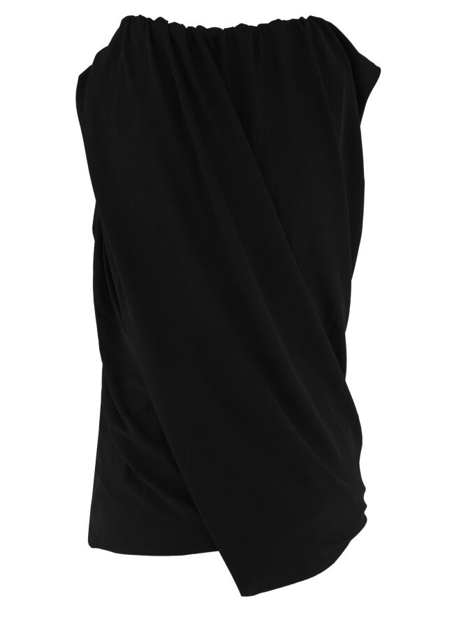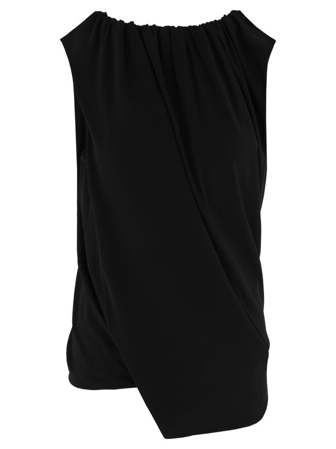 Een top van Annette Görtz in een fijn geribbelde stof in de kleur zwart. De top is uitgevoerd met een dubbele stof en gedraaid verwerkt, wat een slank silhouet creëert. De rand van de ronde hals is fijn geplooid. Deze top kan op 30 graden worden gewassen.